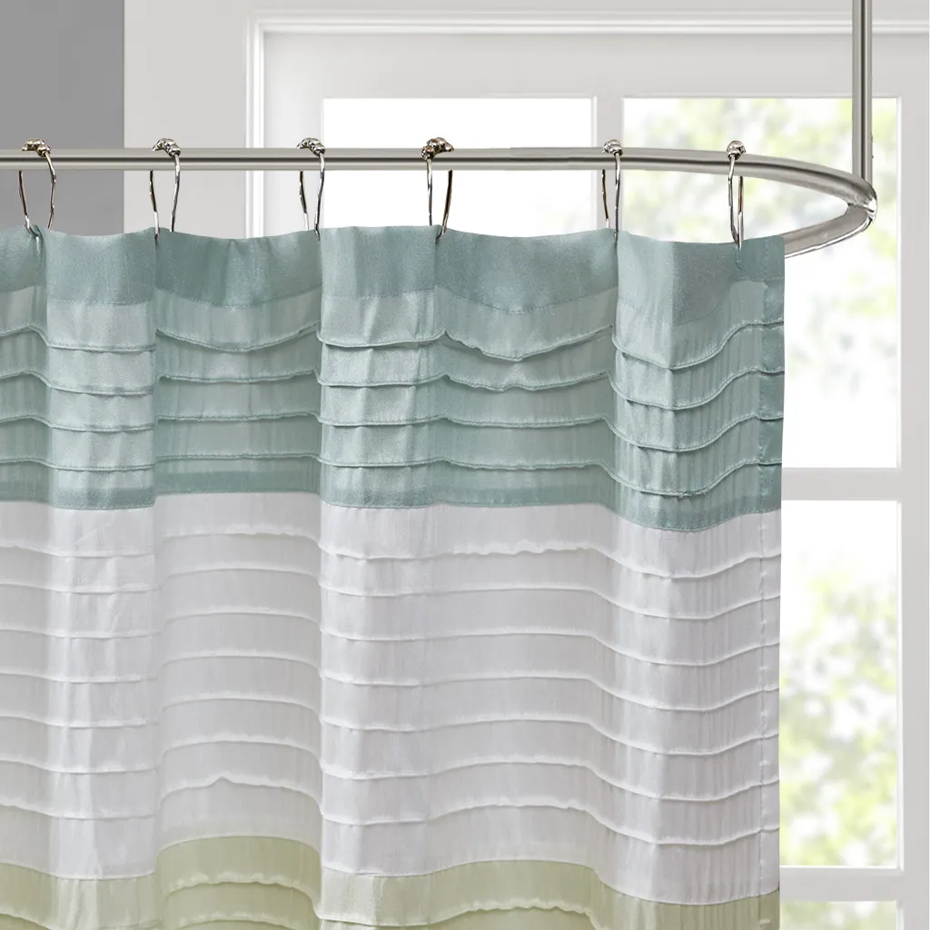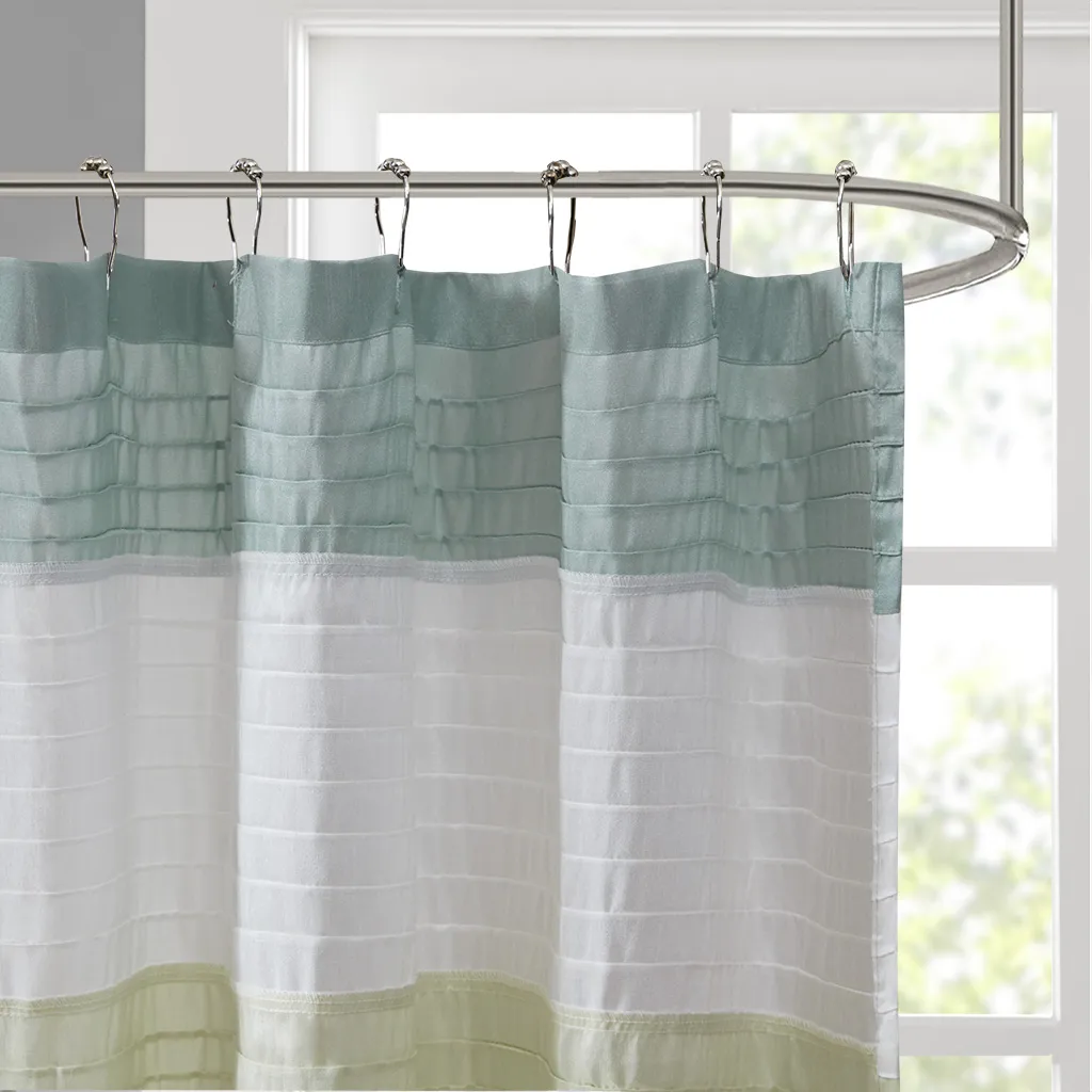 Easily transition your bathroom with this simple, yet beautifully classic shower curtain. The faux silk dupioni fabric has a natural light sheen and drapes beautifully, while also machine washable for easy care. This lightweight shower curtain features pieced and pintucking details creating a rich texture and a unique color block design, sure to freshen up any space. Pattern layout may vary due to variation of sizes. A water repellant liner is not included, and highly recommended. Complete the collection and look with coordinate bath decor, bedding, and window decor - available and sold separately.