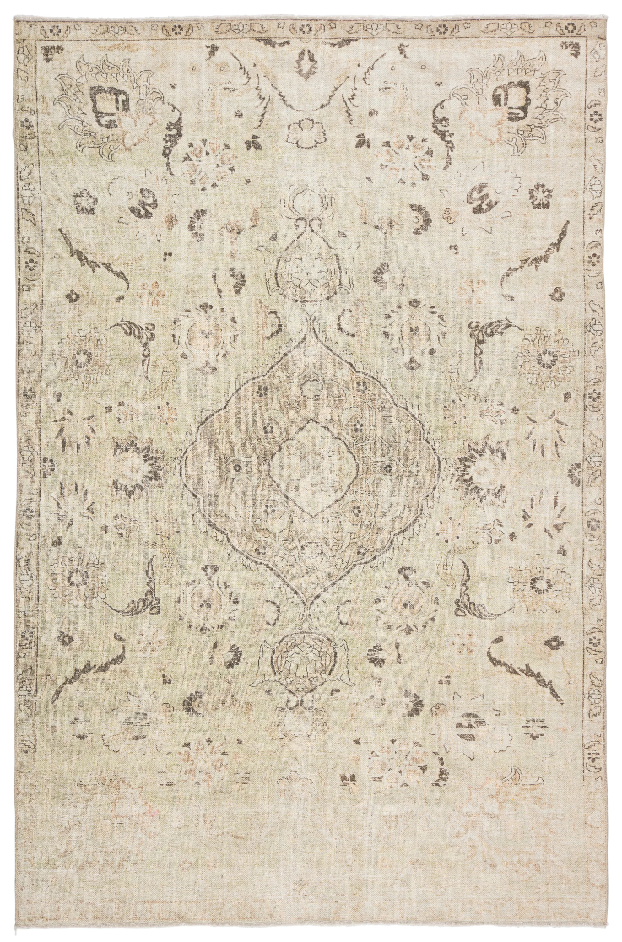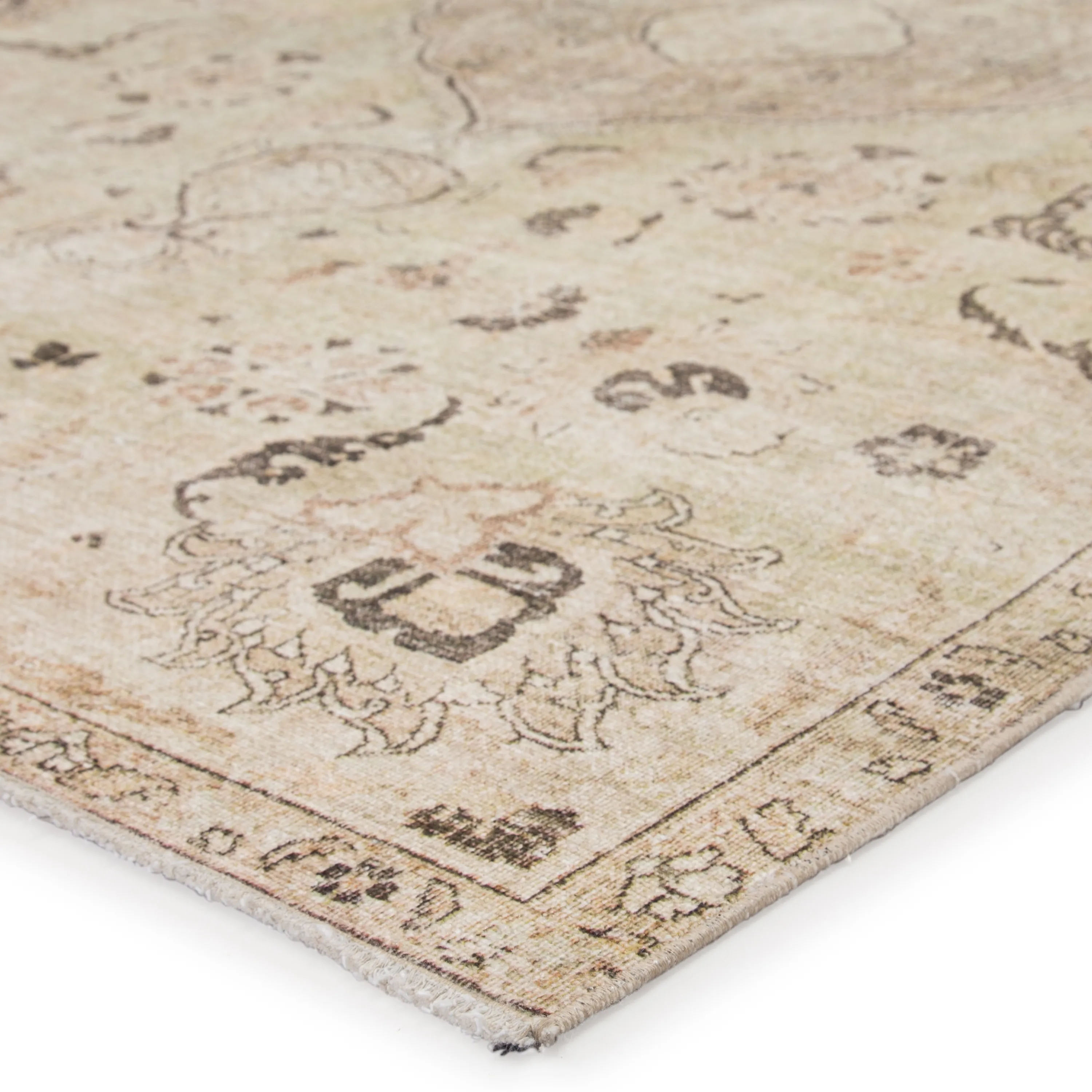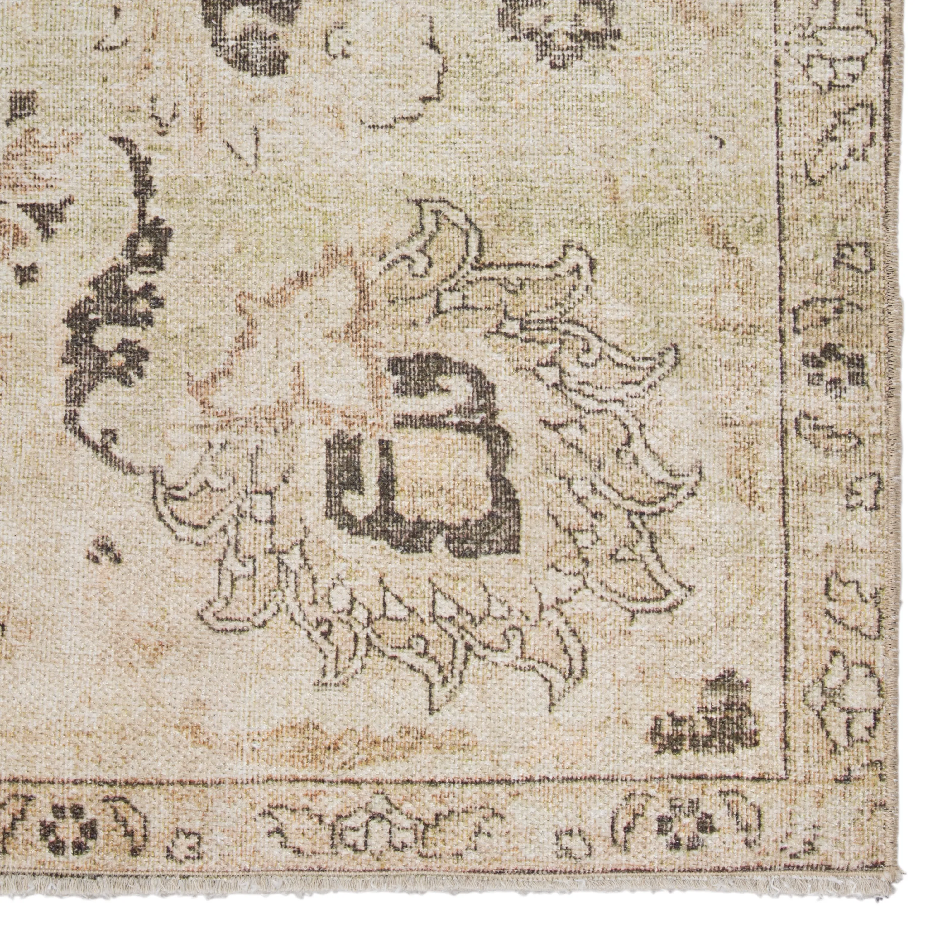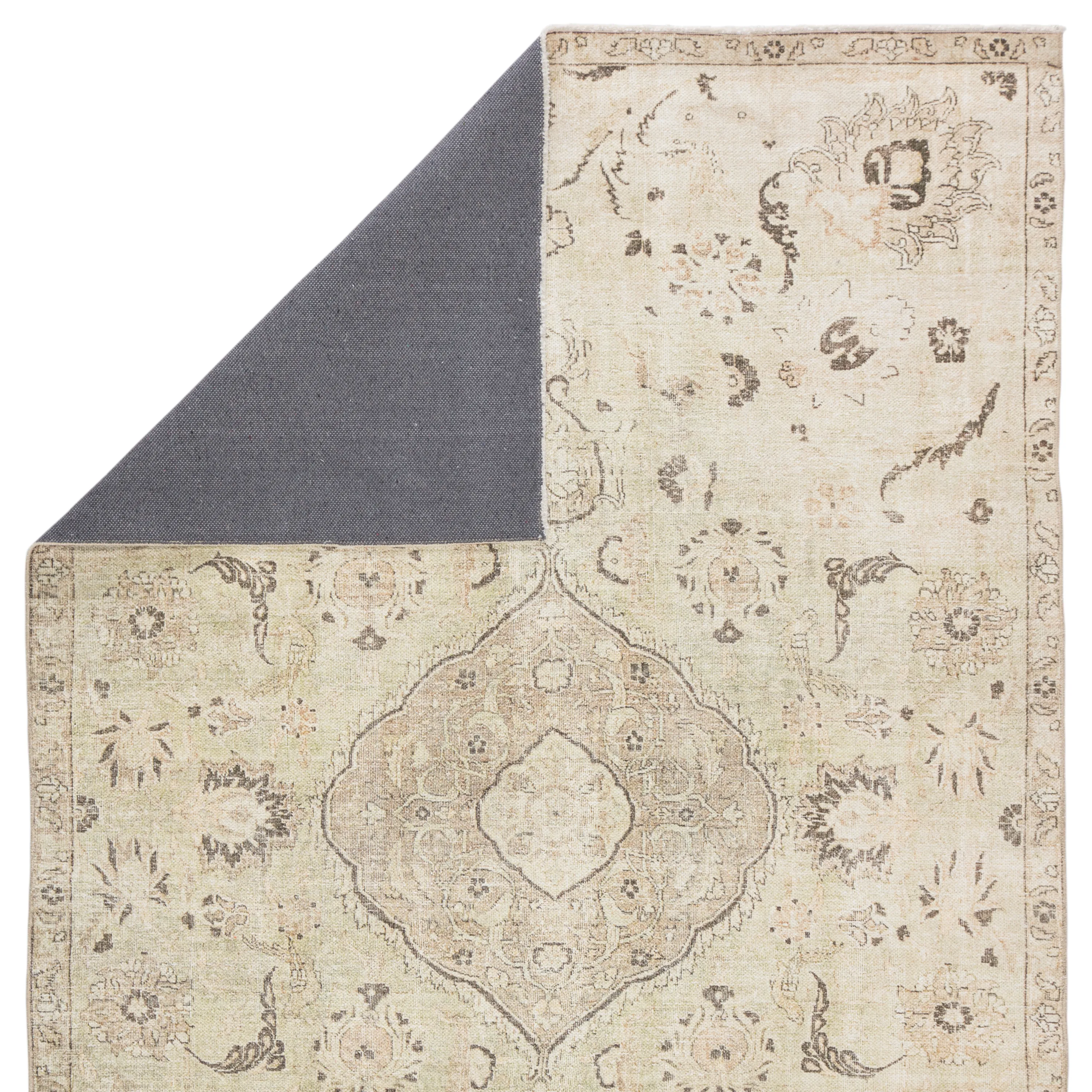 The Boheme collection brings vintage inspiration to life with ornate, worldly designs and a timeless distress effect. The Victoire area rug boasts an elegantly antiqued center medallion in neutral tones of green, gray, and beige. This zero-pile rug is made of cotton, polyester, and soft chenille for a flat, durable finish.