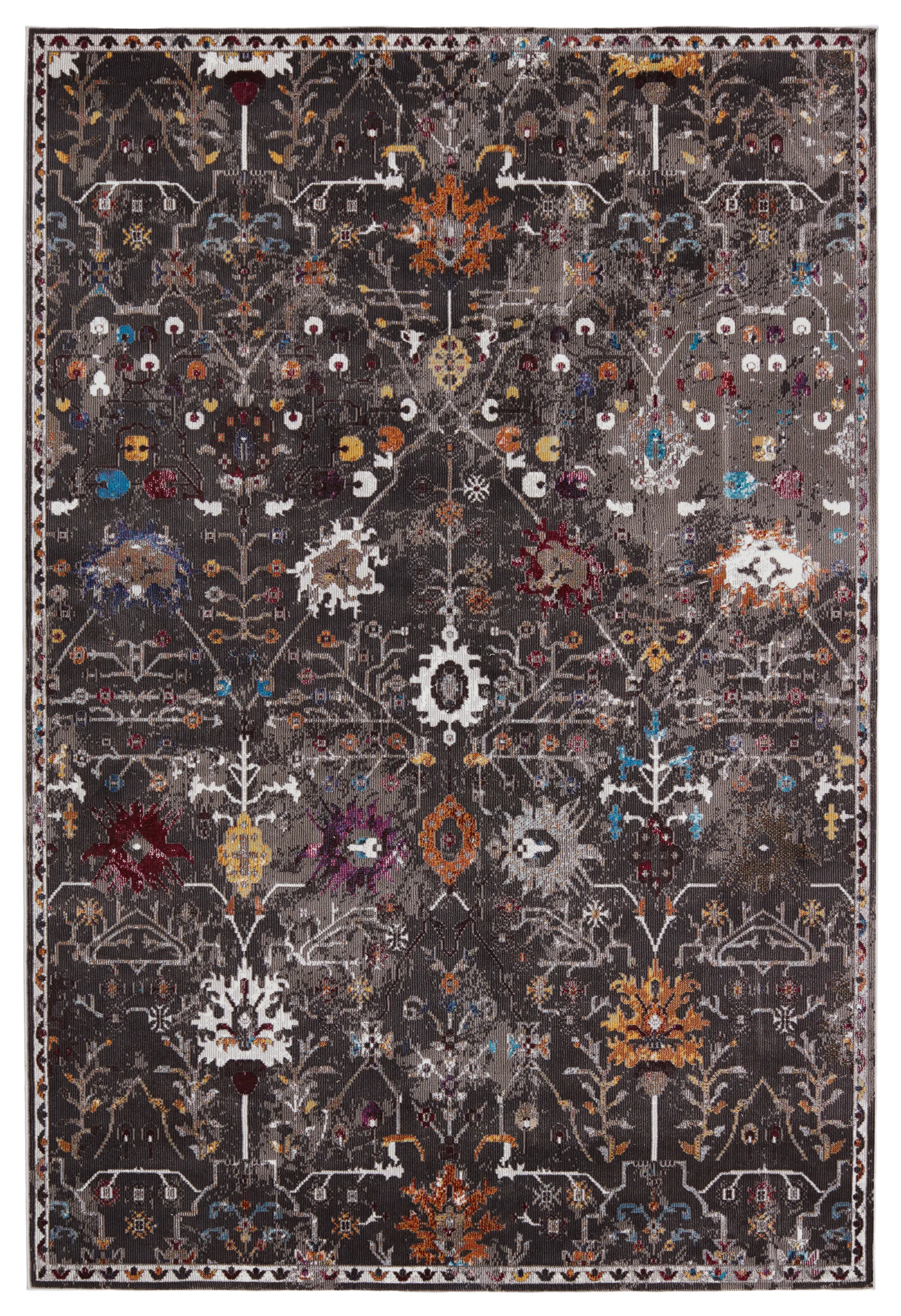 The Borealis is a stellar study in color, movement, and texture. The Zaniah rug melds traditional motifs with a moody palette of black, taupe, gray, and bright multicolors for a whimsical statement. Made of durable polypropylene, this vibrant power-loomed rug is easy-care and perfect for high-traffic rooms in the home.