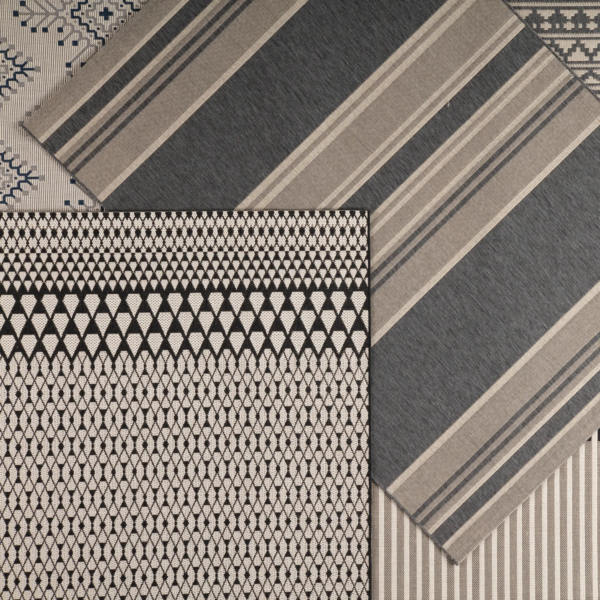 With an assortment of nautical and global designs, the Catamaran collection is the perfect weather-resistant and stylish accent for outdoor and indoor settings. The flat-woven Pilot rug boasts a sisal-inspired look and a dynamic stripe pattern. Neutral gray and natural beige hues offer a classic colorway to any space.