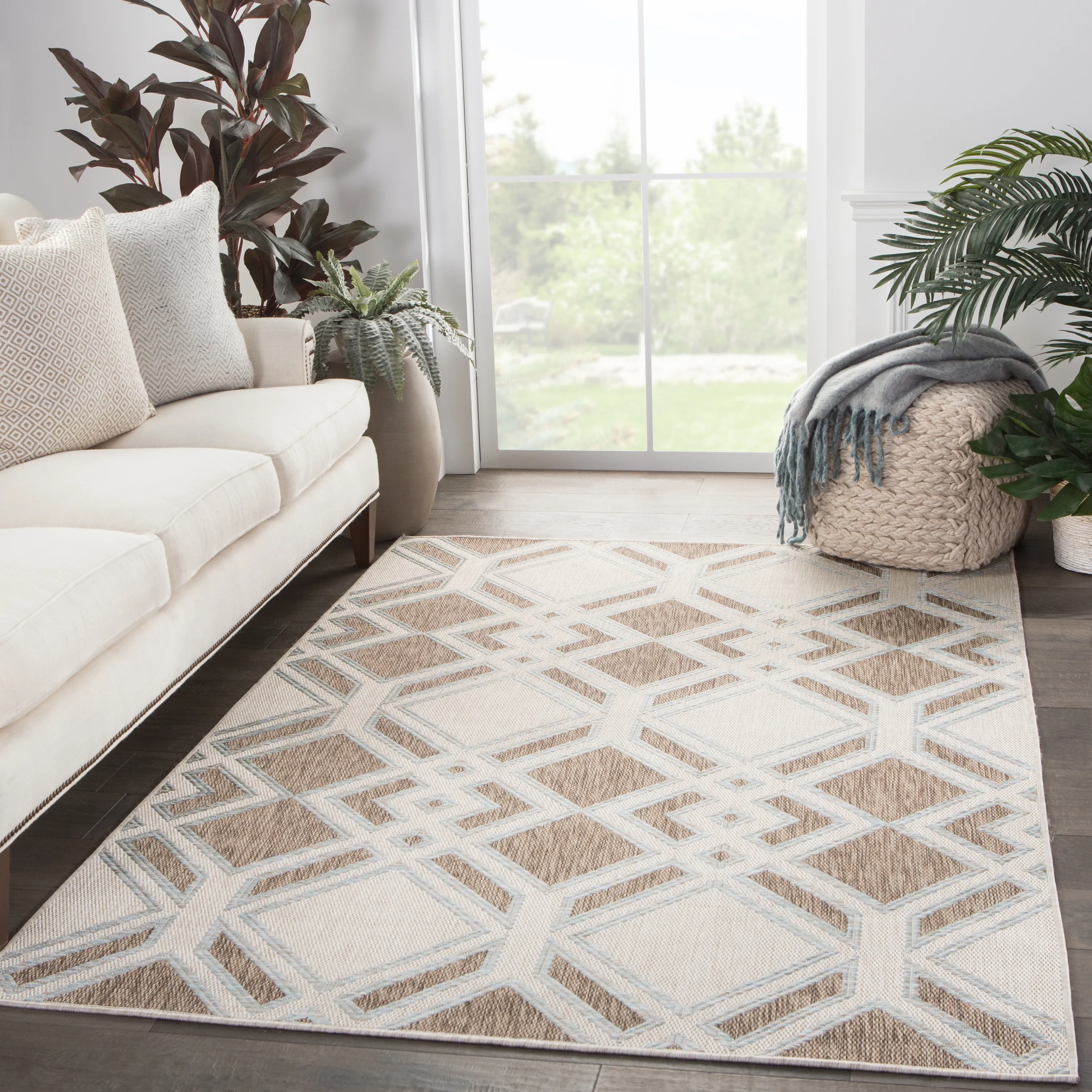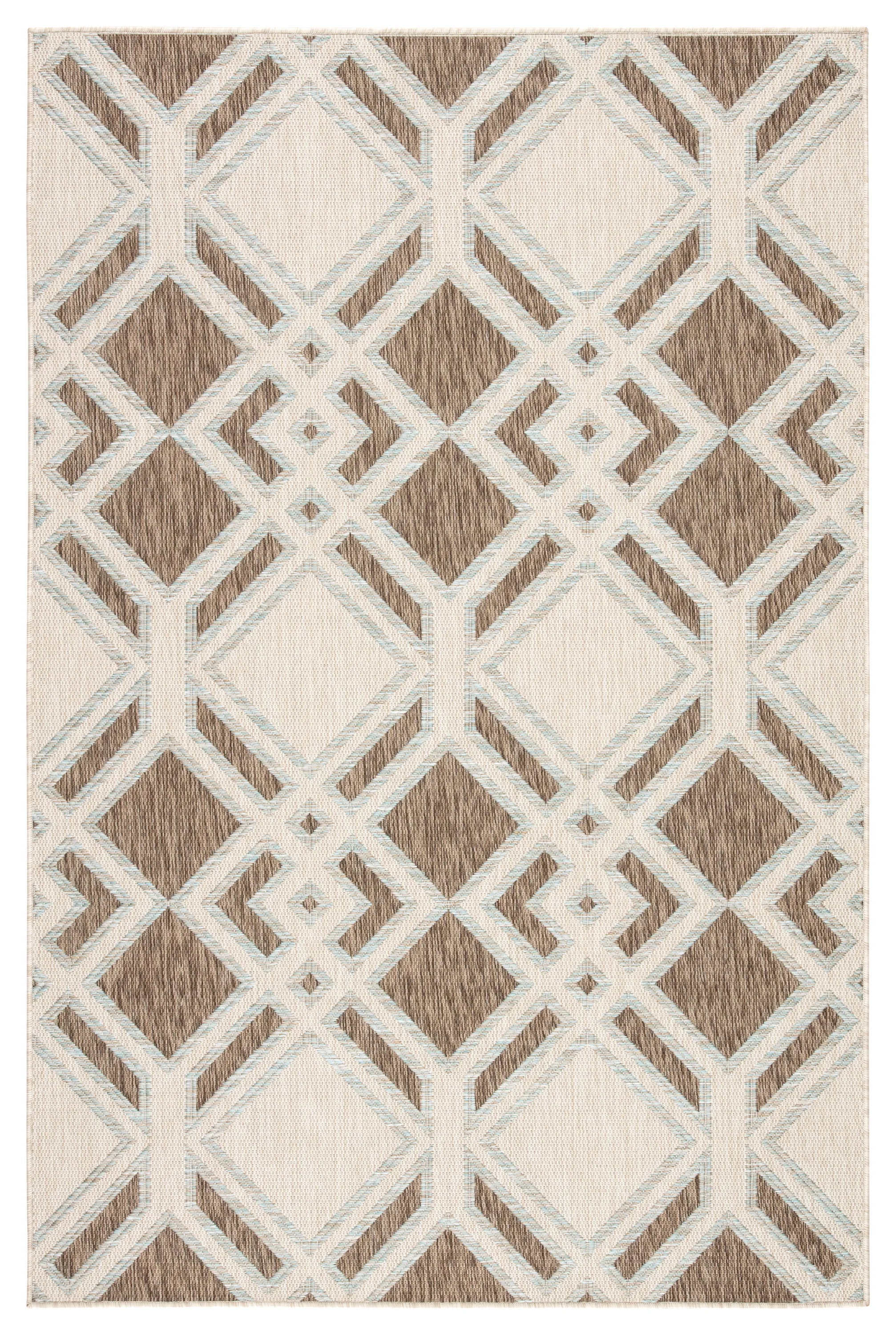 The Decora collection by Nikki Chu combines bold and graphic designs with a striking yet versatile palette. The Samba area rug brings geometric appeal to indoor and outdoor spaces with a dynamic diamond lattice pattern in brown, ivory, and sky blue.