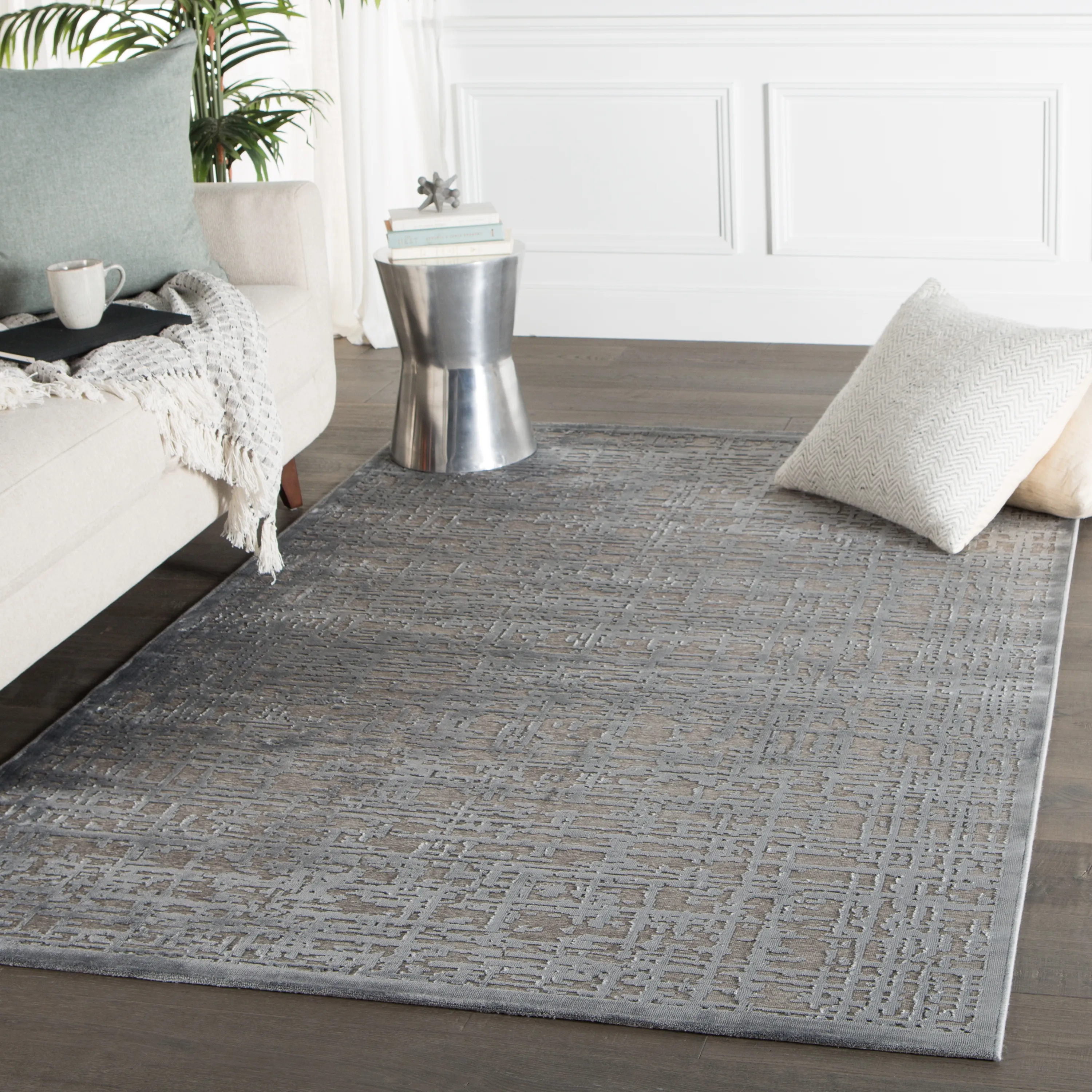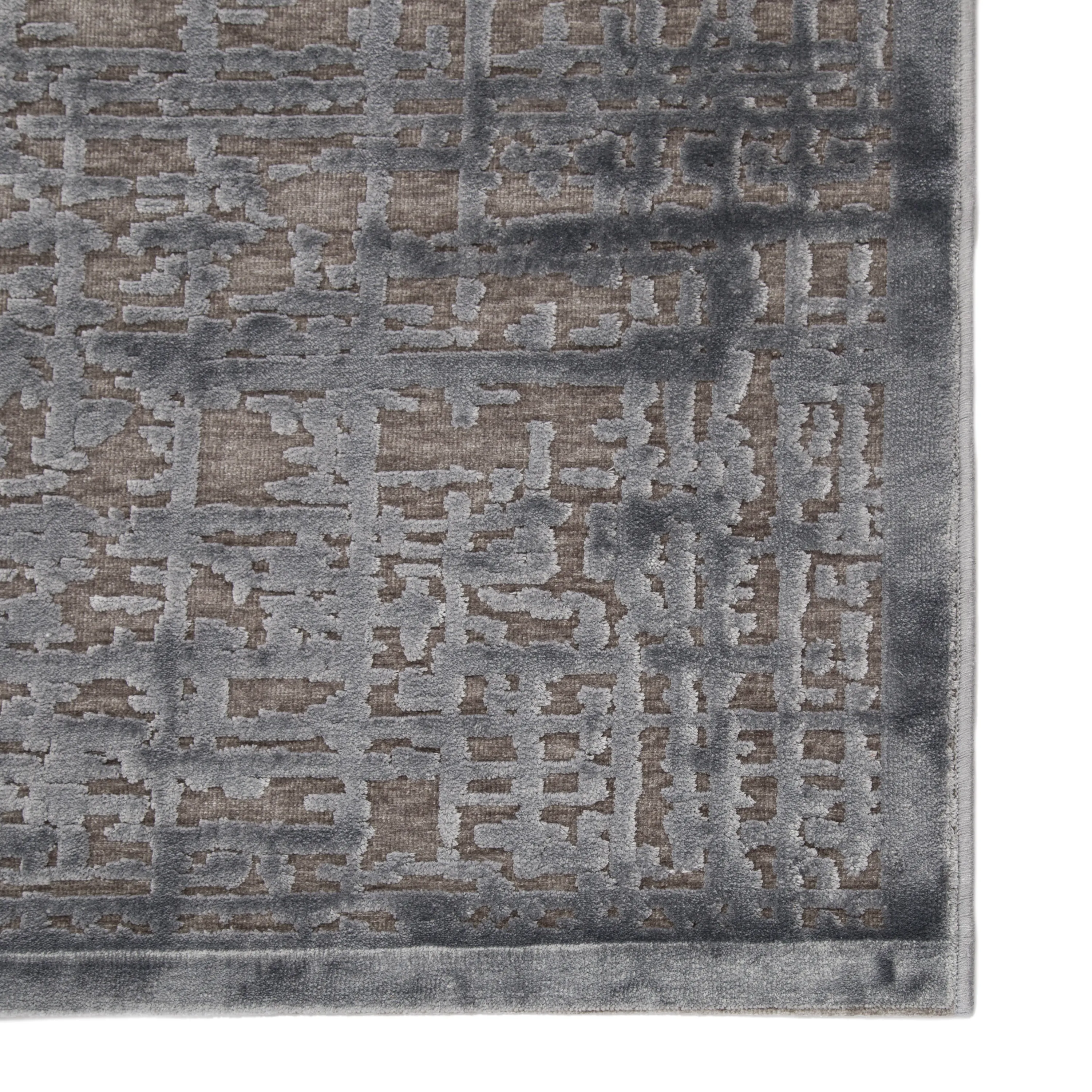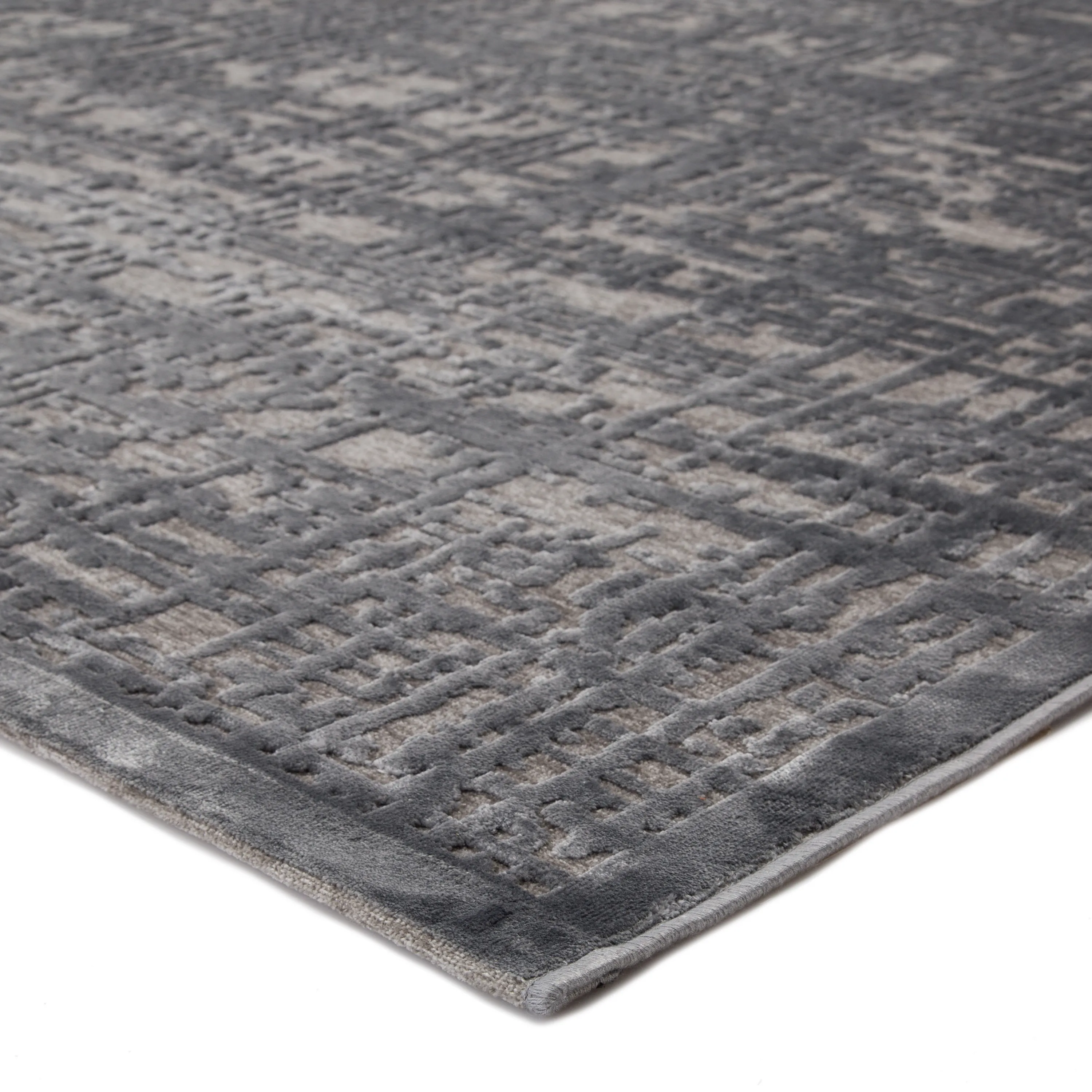 Soft to the touch and alluring with a distinctive high-low texture, this rayon and acrylic blend area rug lends the perfect accent to bedrooms. A modern cross-hatched pattern adds dimensional appeal to this chic and lustrous tone-on-tone gray layer.