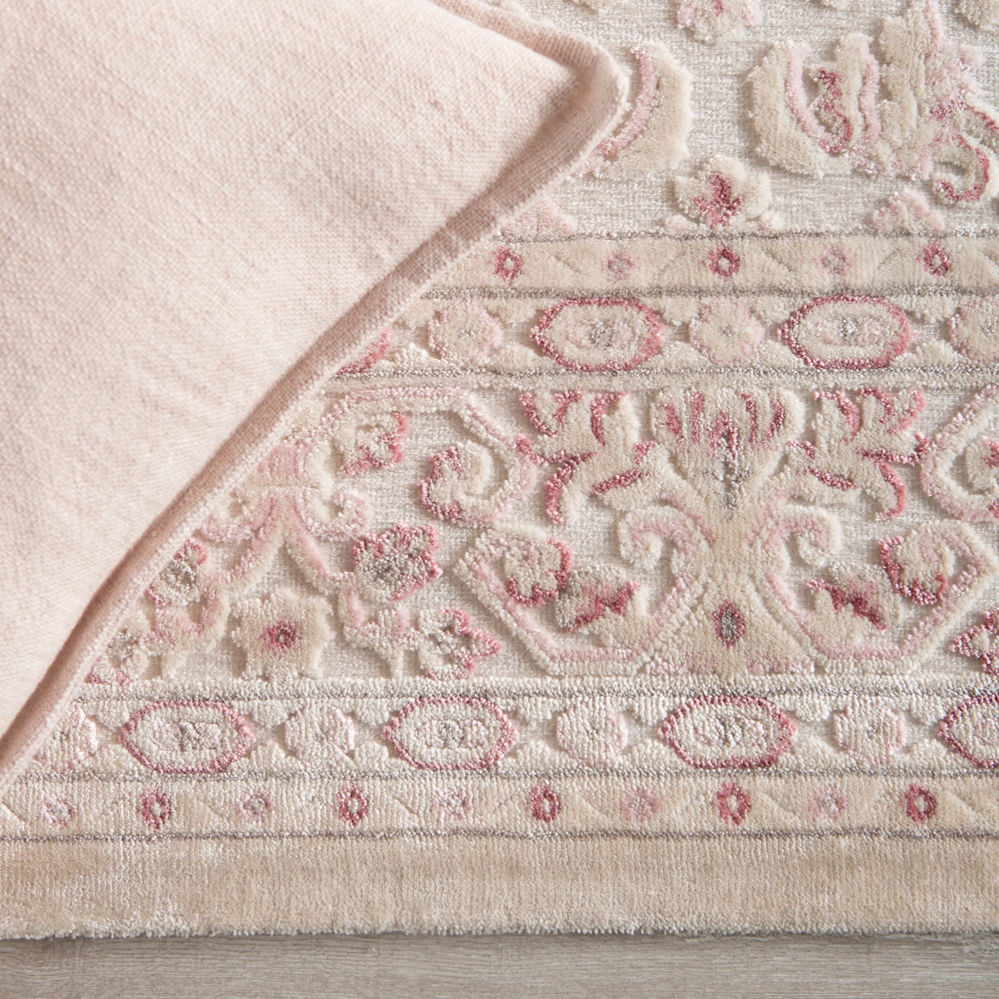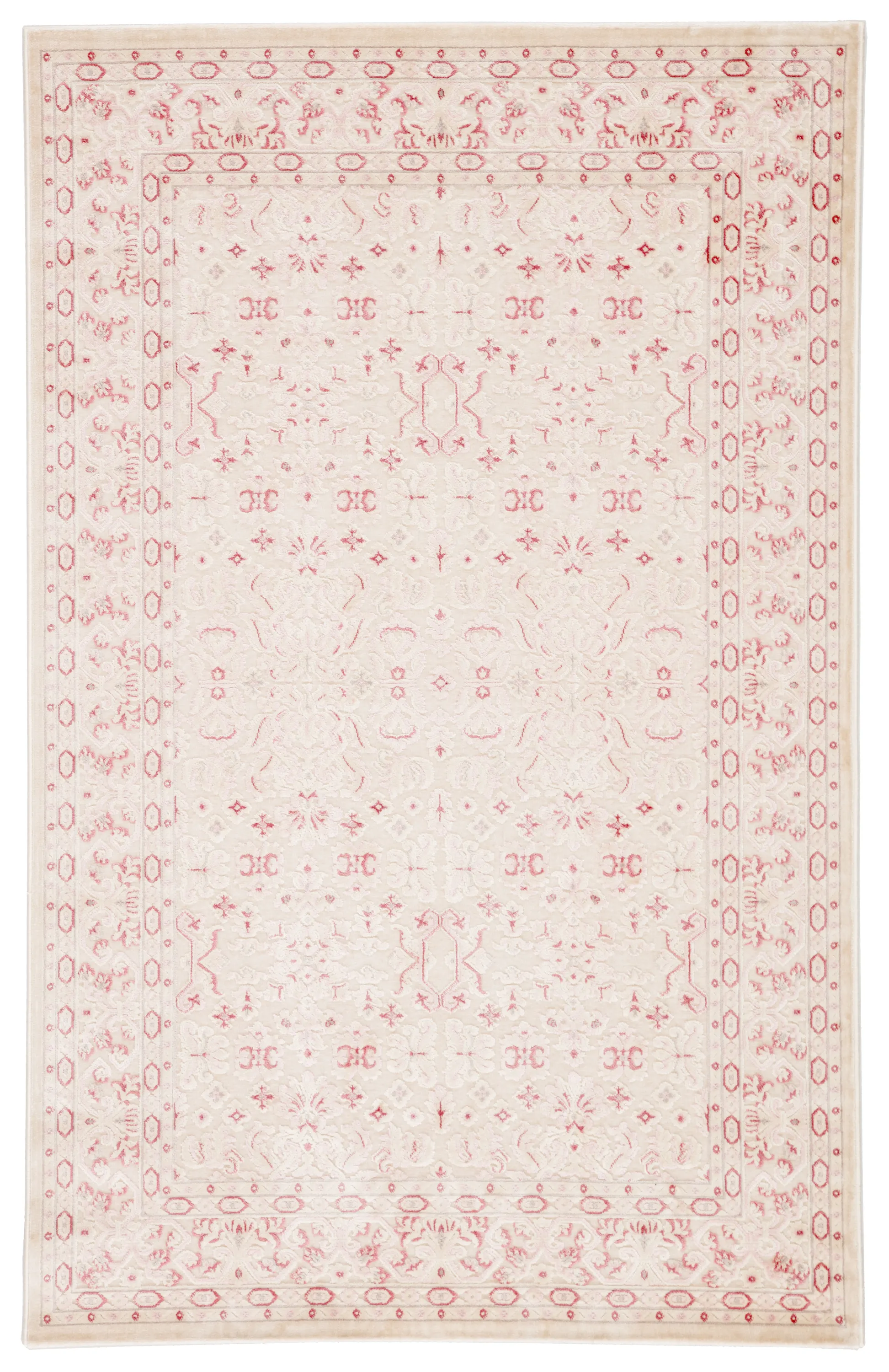 The Fables collection is a curated assortment of contemporary and transitional styles with an invitingly soft touch, rich high-low texture, and a luxurious sheen. The Regal area rug offers Old World-inspired elegance to transitional spaces with an ornate brocade and border design. A glamorous pink and cream colorway lends soft femme appeal to this stunning acrylic, rayon, and polyester rug.