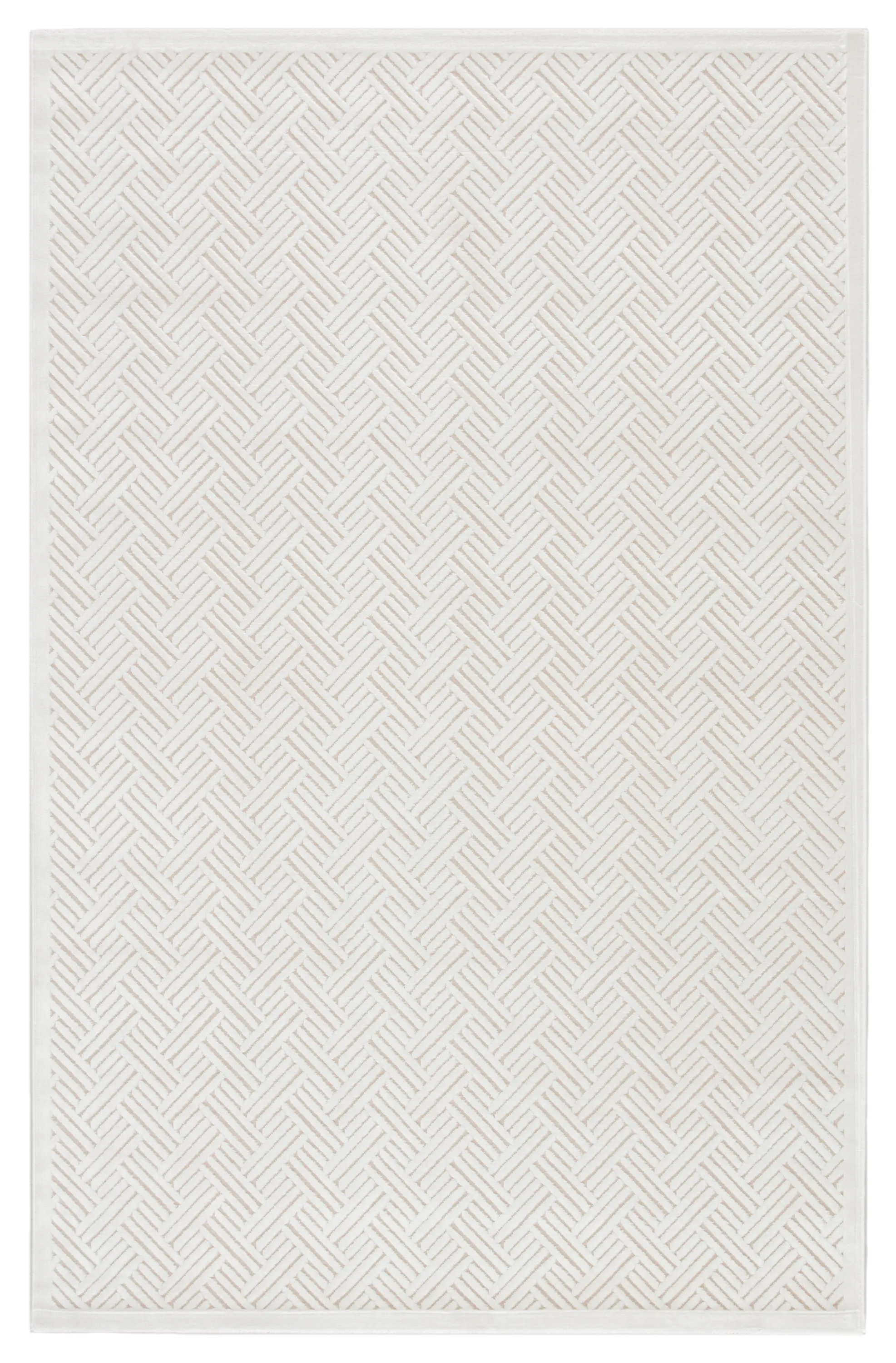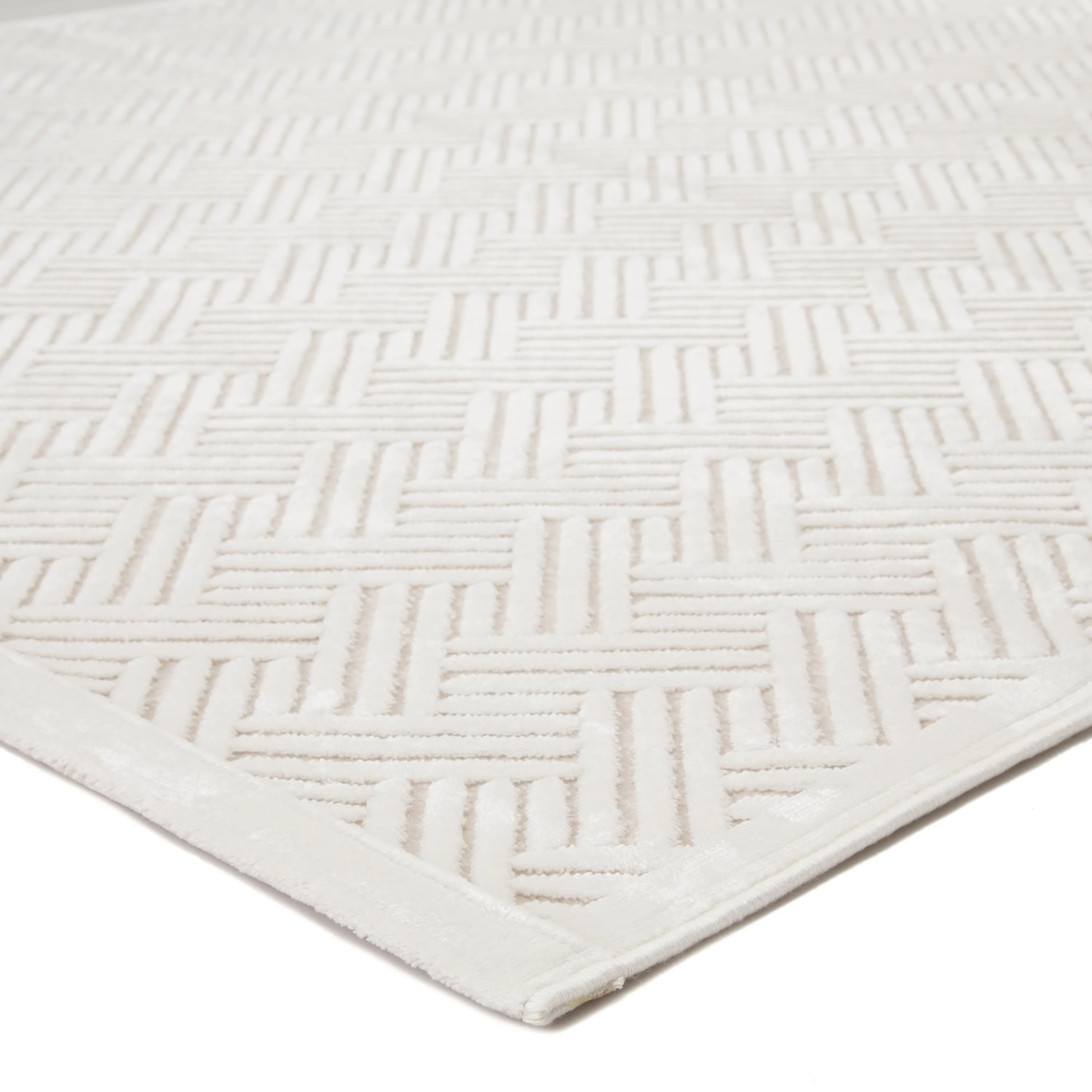 Soft to the touch and alluring with a distinctive high-low texture, this rayon and acrylic blend area rug lends the perfect accent to bedrooms. A distinctive herringbone pattern offers graphic intrigue to this luxe layer, while a tone-on-tone white colorway presents glamorous flair.