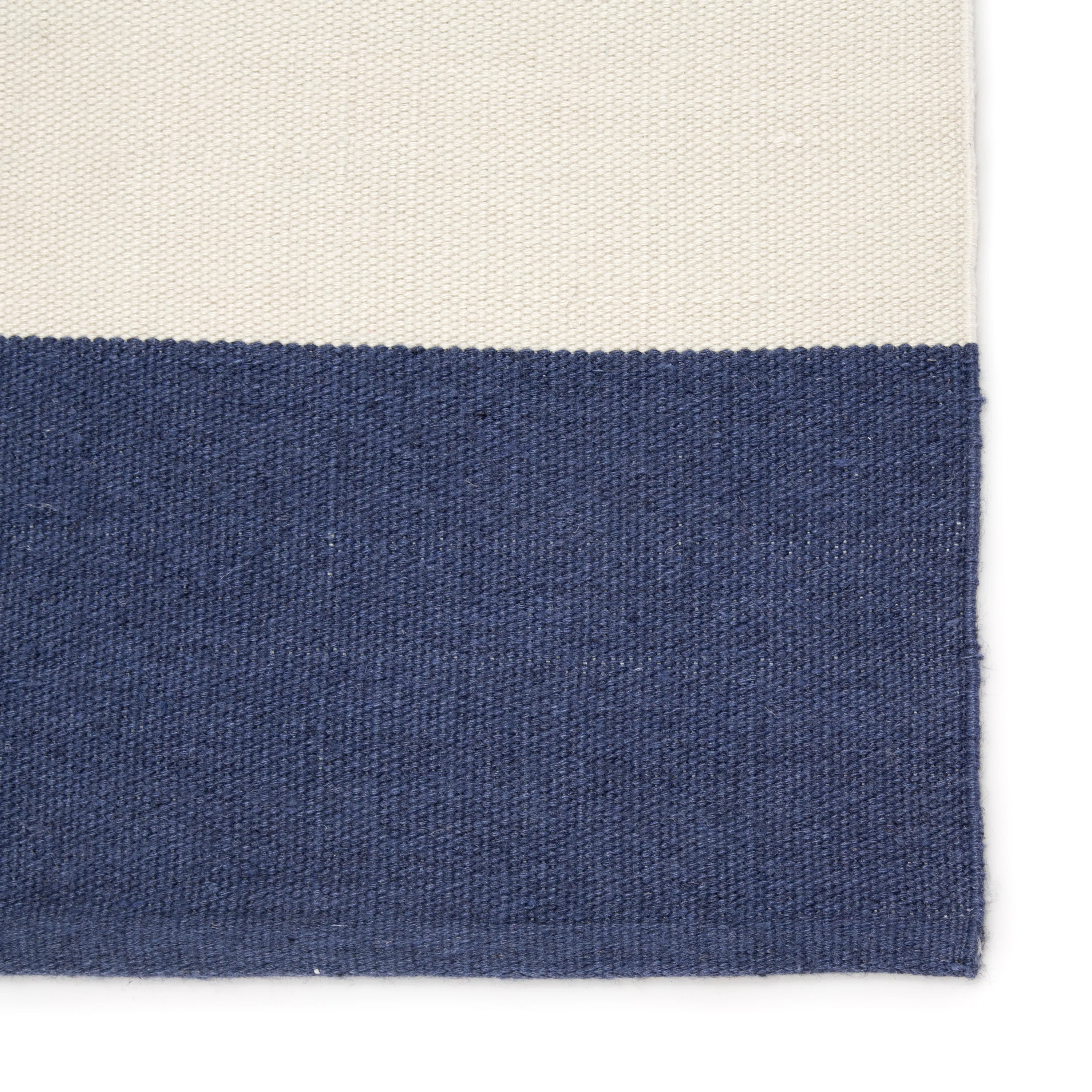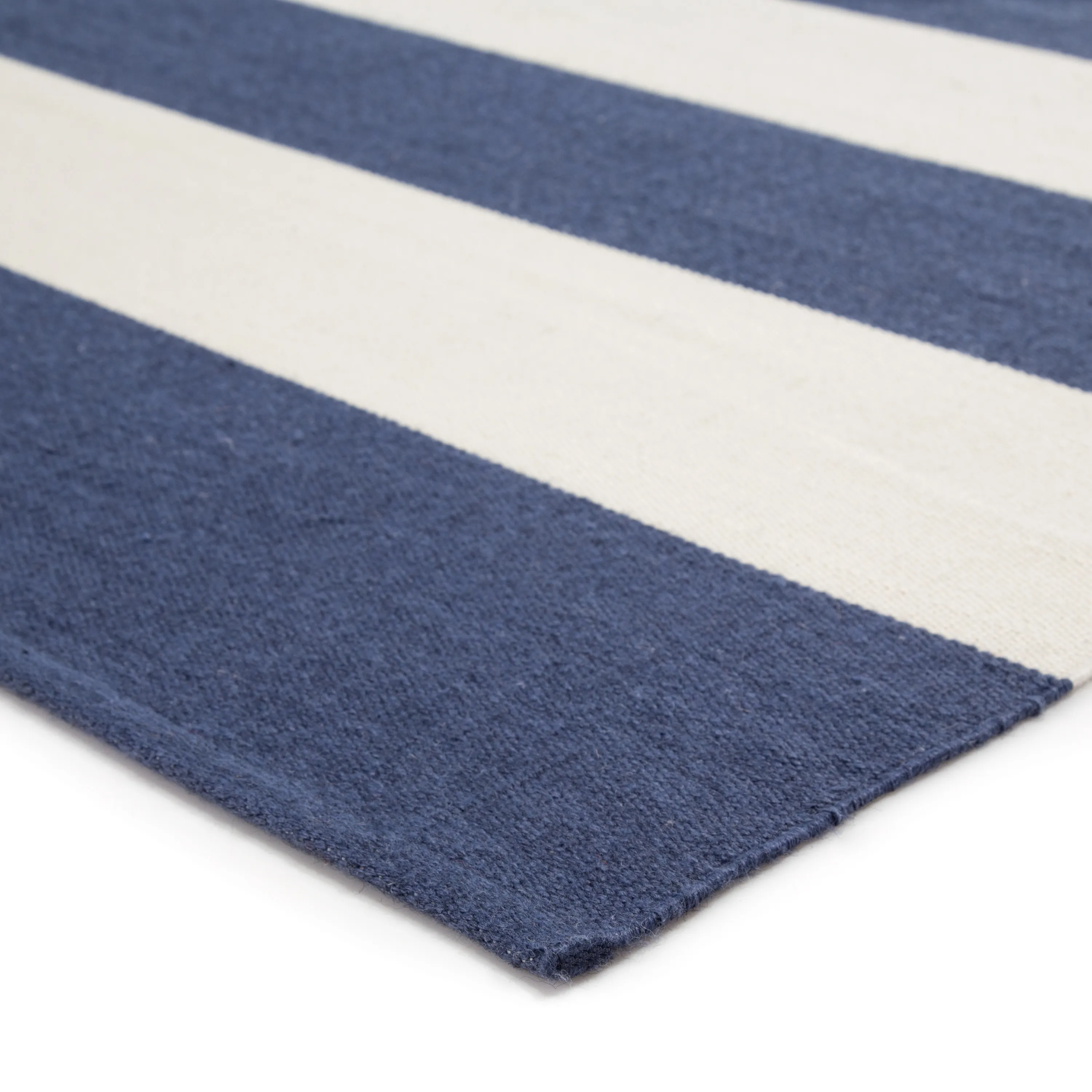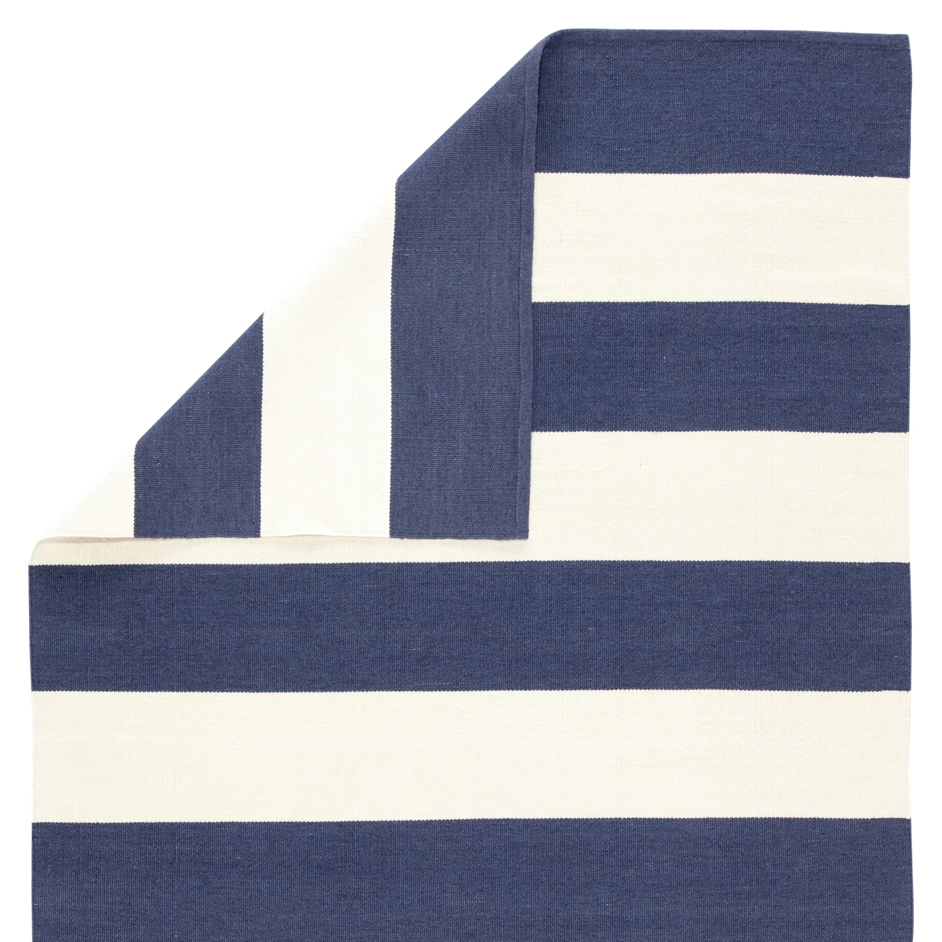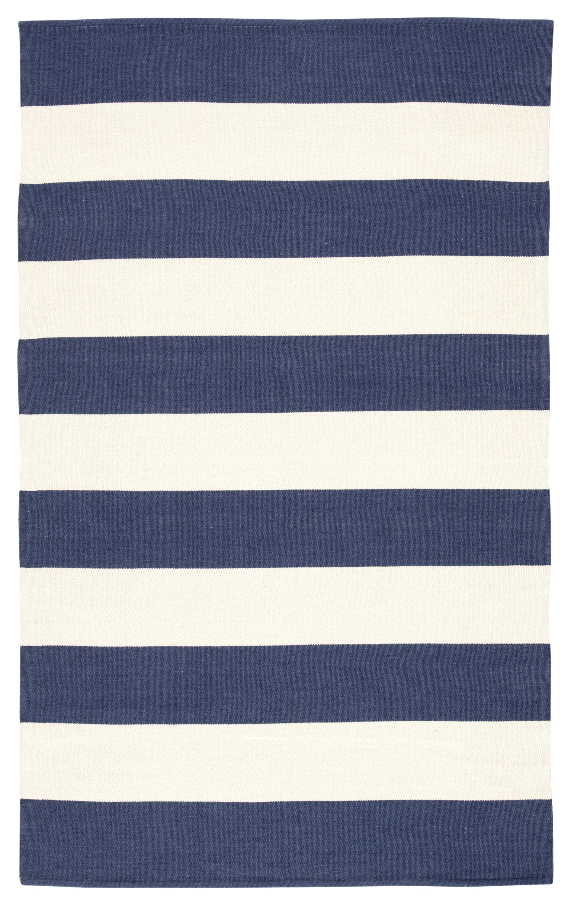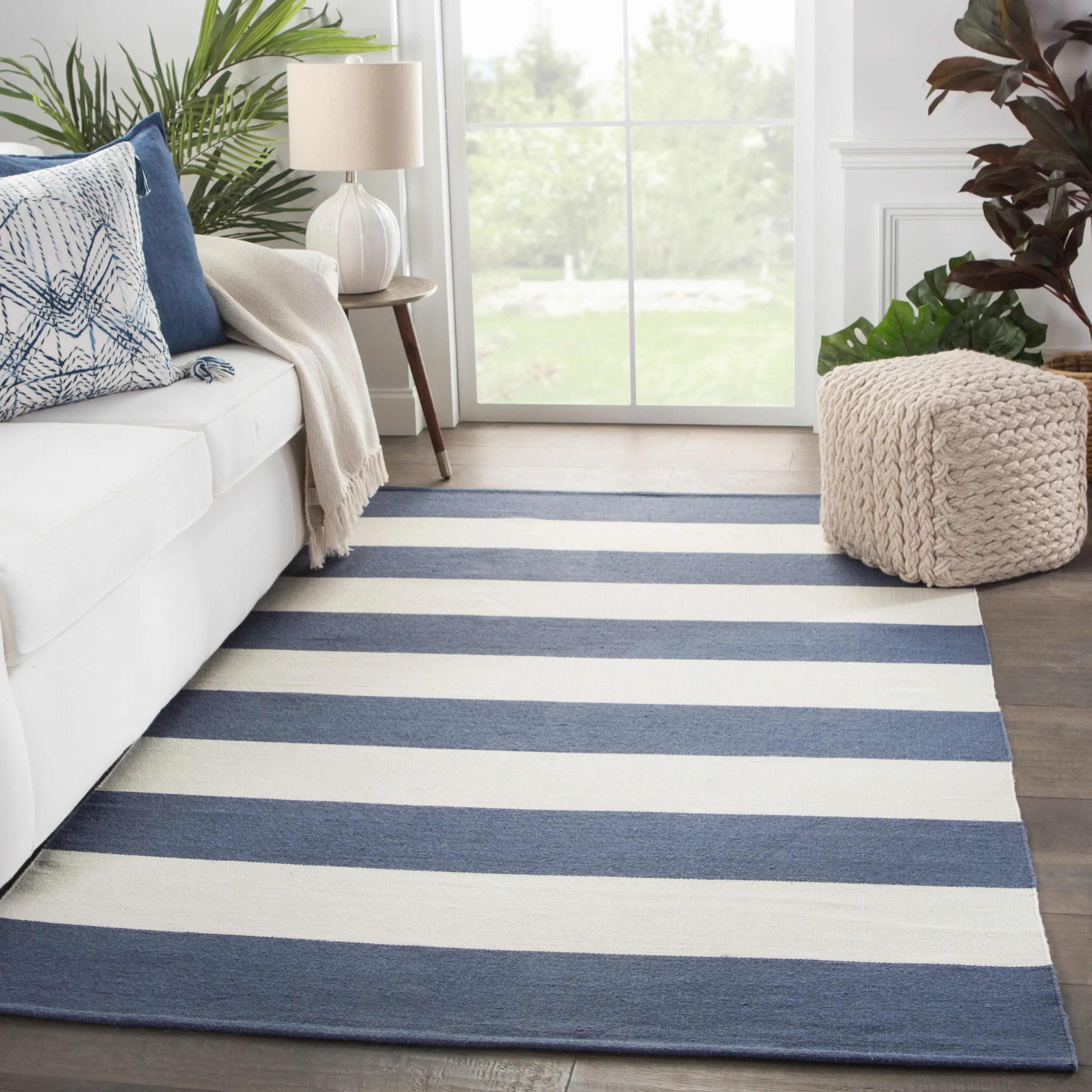 Relaxed and sophisticated in the same moment, the Lanai collection is a chic assortment of nautical designs. The bold stripe Remora area rug infuses both indoor and outdoor spaces with a classic colorway of deep blue and ivory. Hand woven of eco-friendly PET yarns, this durable rug is easy to clean and perfect for high-traffic areas.