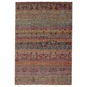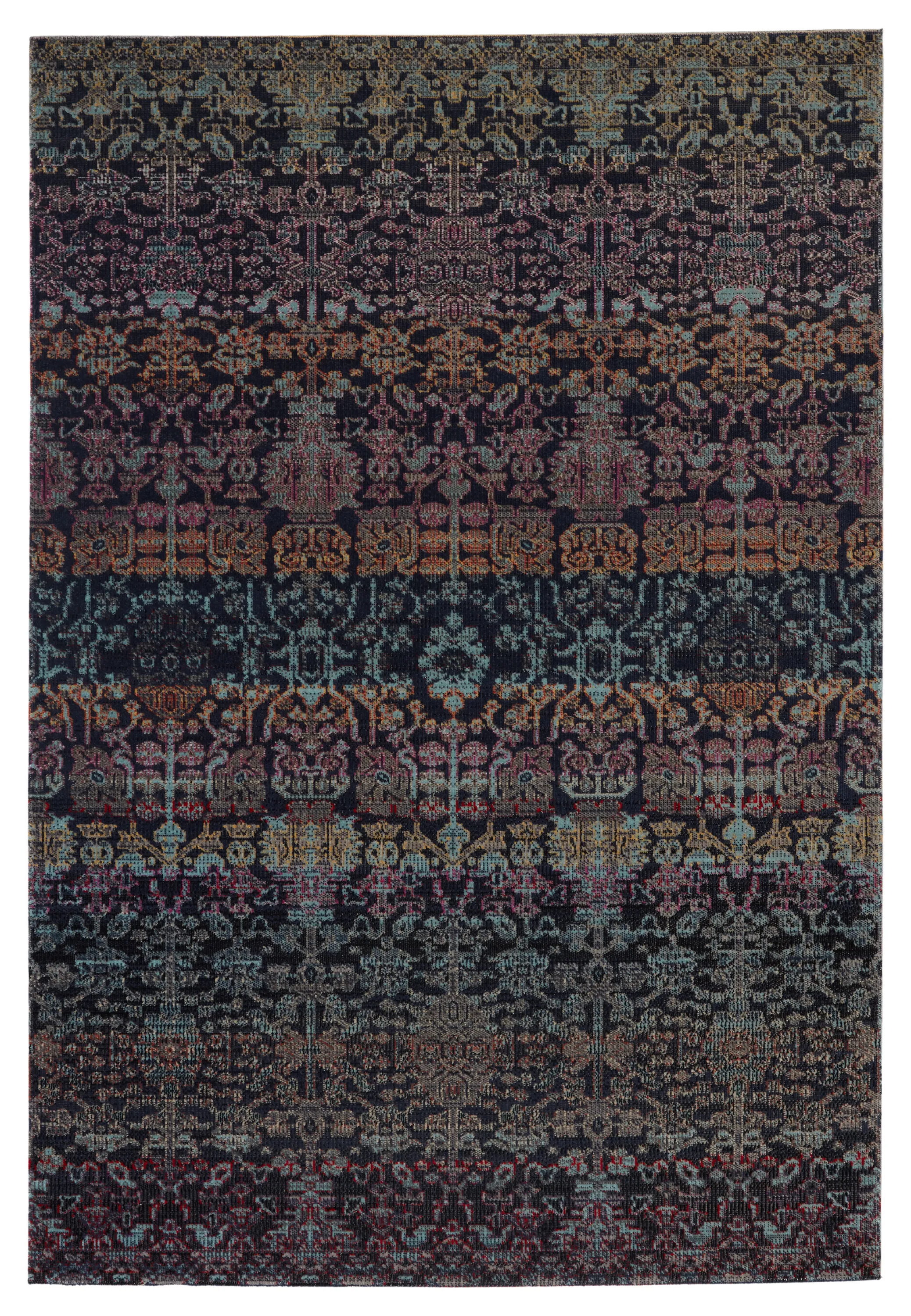Capturing the beauty of antique Turkish rugs, the indoor-outdoor Polaris collection combines admired traditional designs with a durable, light-weight polypropylene construction. The Bodega rug features a vibrant and whimsical take on an ornate brocade motif with bands of deep, multicolor jewel tones. This rich, globally inspired rug offers a bold and statement-making addition to dining rooms, patios, and kitchens.