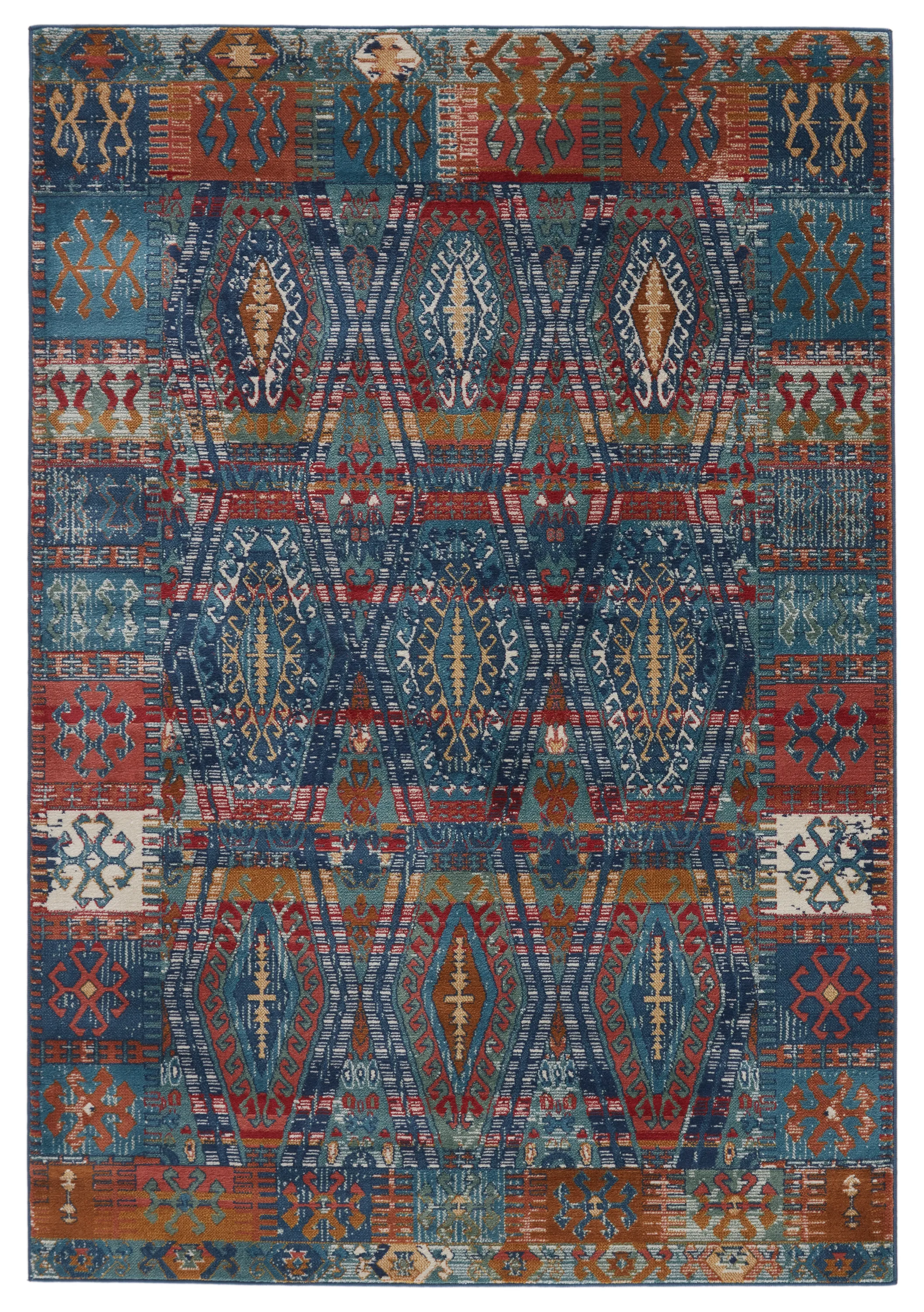Emulating the bold, saturated colors of vegetable-dyed antique rugs, the innovative Prisma collection combines admired traditional design with a durable polypropylene construction. The eclectic Miron rug boasts a tribal lattice motif in rich red, blue, green, ocher, and white tones. The low pile and easy-to-clean material of this rug proves perfect for high-traffic spaces.