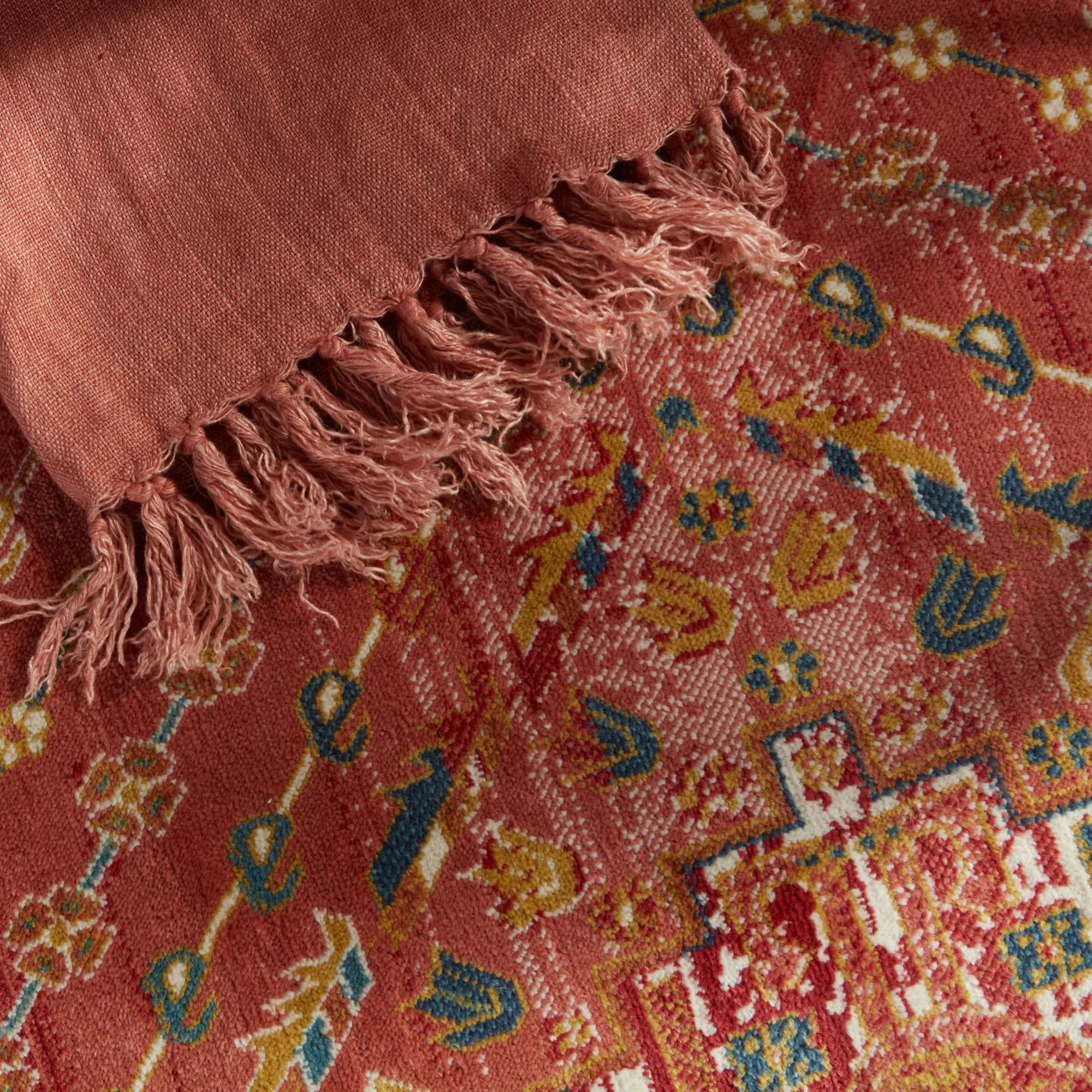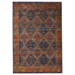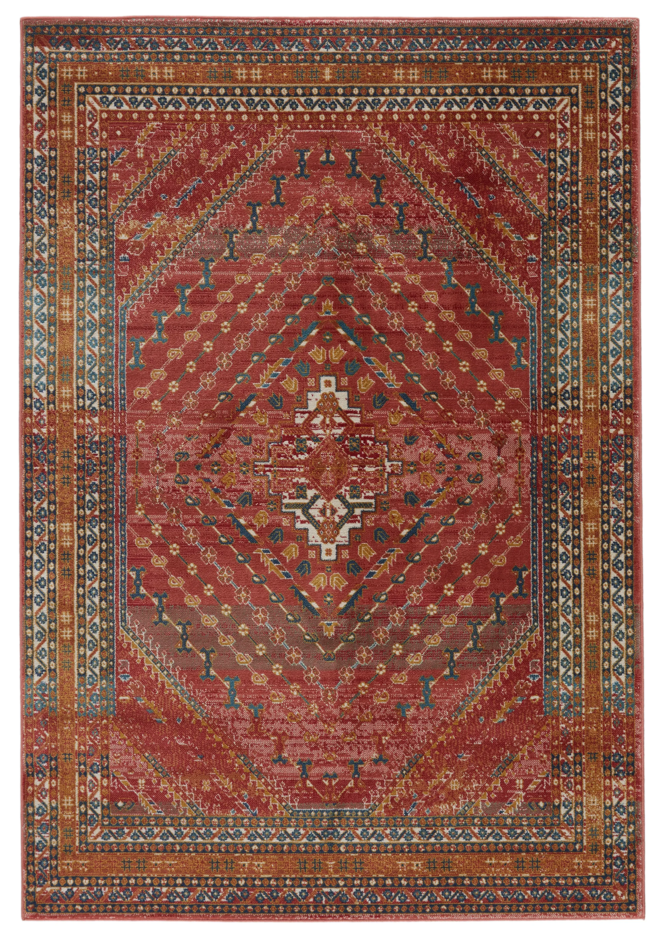 Emulating the bold, saturated colors of vegetable-dyed antique rugs, the innovative Prisma collection combines admired traditional design with a durable polypropylene construction. The Selah rug boasts a finely detailed, geometric medallion in rich tones of red, pink, and ocher. The low pile and easy-to-clean material of this rug proves perfect for high-traffic spaces.