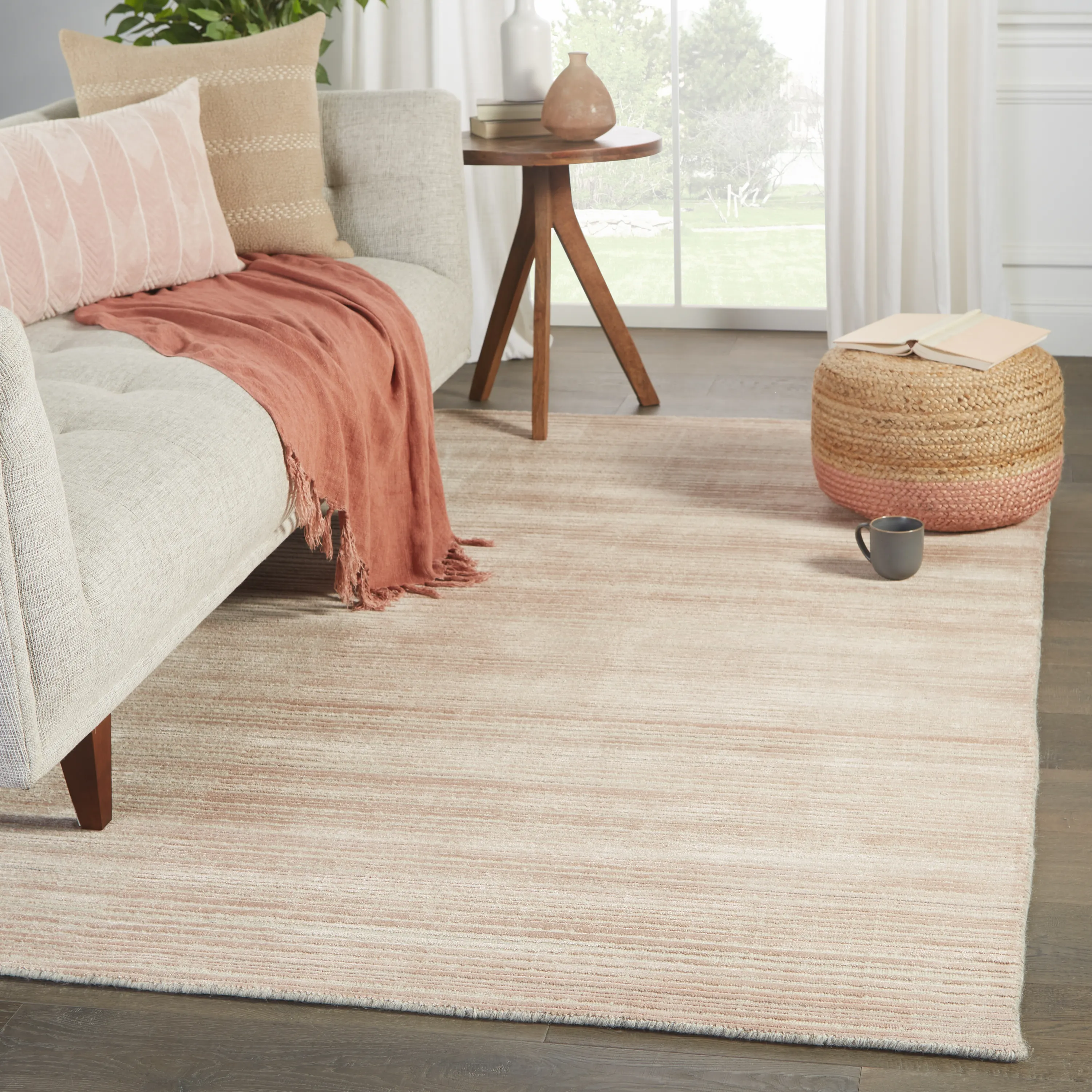 The easy-to-decorate, earthy tones of the Second Sunset collection prove that simplicity can sometimes be striking. The Gradient rug is hand loomed of durable wool and rayon made from bamboo for a sumptuous and inviting hand. The variation in the rosy tan, cream, and gray tones of this lustrous rug creates stunning depth and dimension with the help of subtle striation in the cut-and-looped pile.