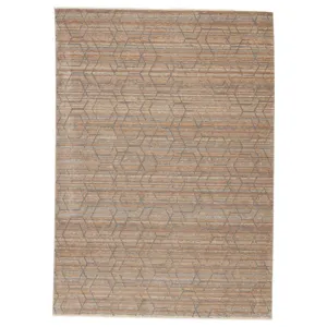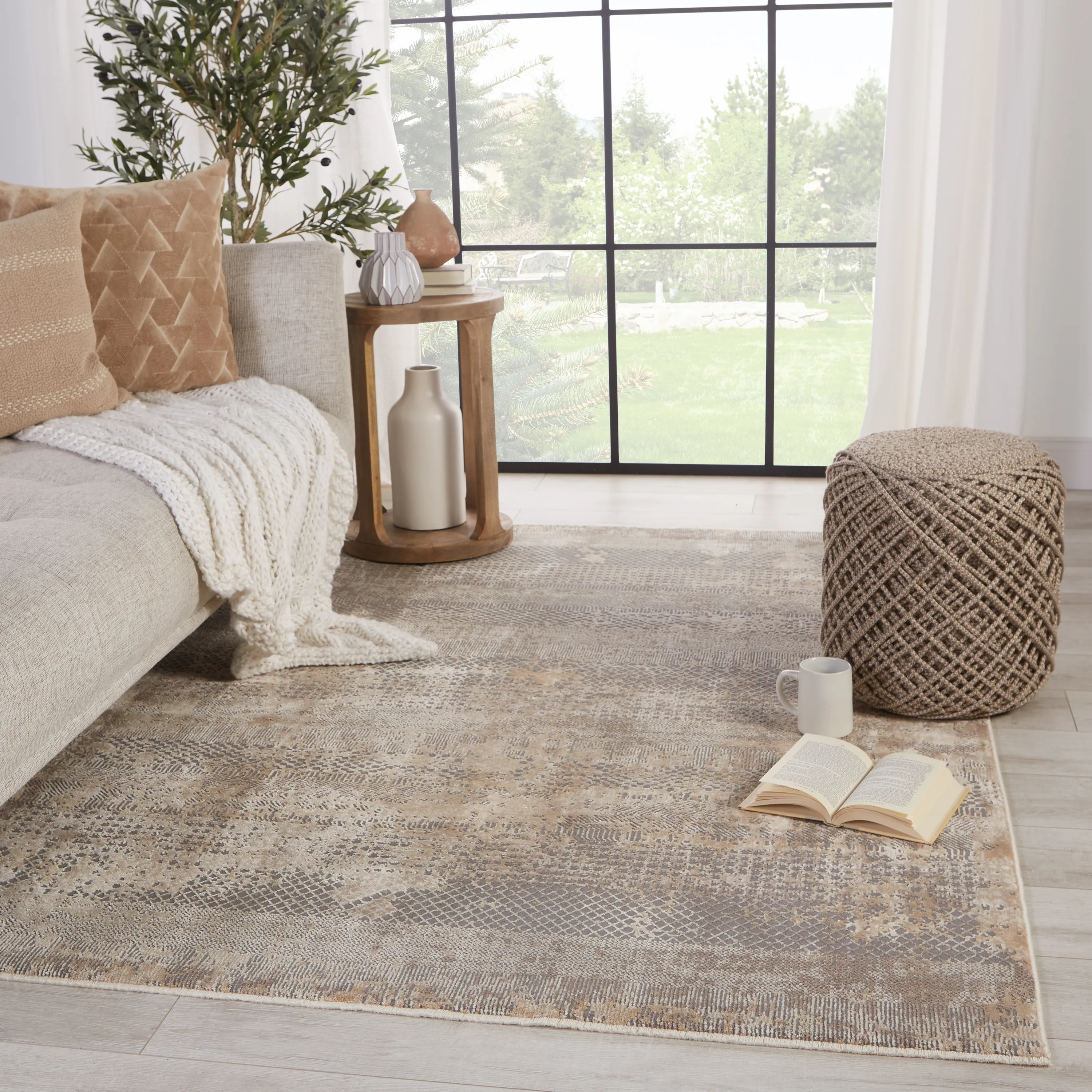 The elegant Vienne collection showcases the on-trend blanc de blanc look for an effortless and luxuriously vintage statement. The Ezri rug boasts a distressed mosaic motif in warm tones of tan, gray, and taupe with accents of metallic gold and bronze. Soft and lustrous, this chameleon-like design emulates the timeless style of a Turkish hand-knotted rug, but in an accessible polyester and viscose power-loomed quality.