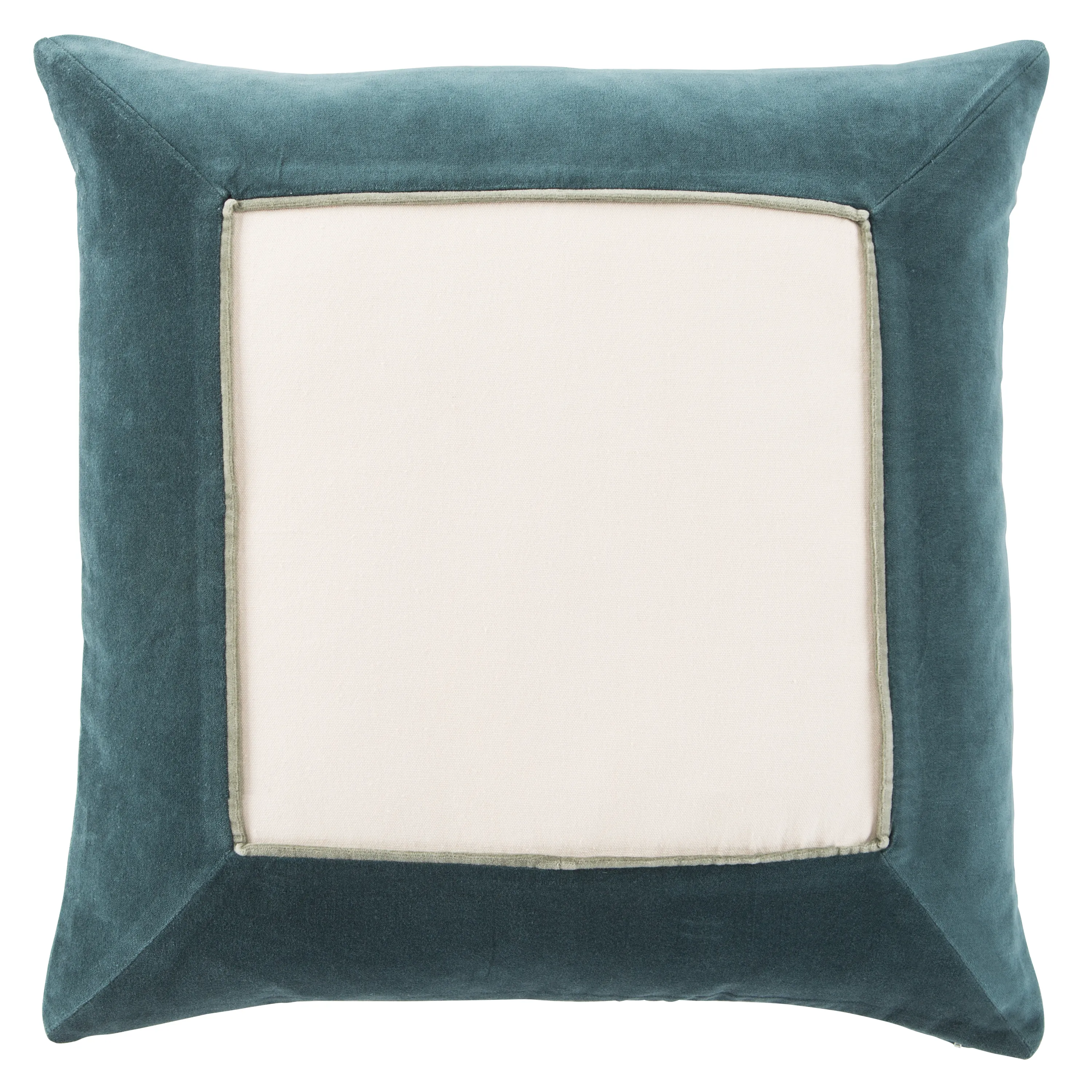 The Emerson pillow collection features an assortment of clean-lined, coordinating accents crafted of luxe cotton velvet. The Hendrix pillow boasts a border design and piped edge detailing in a teal and green-gray color scheme.