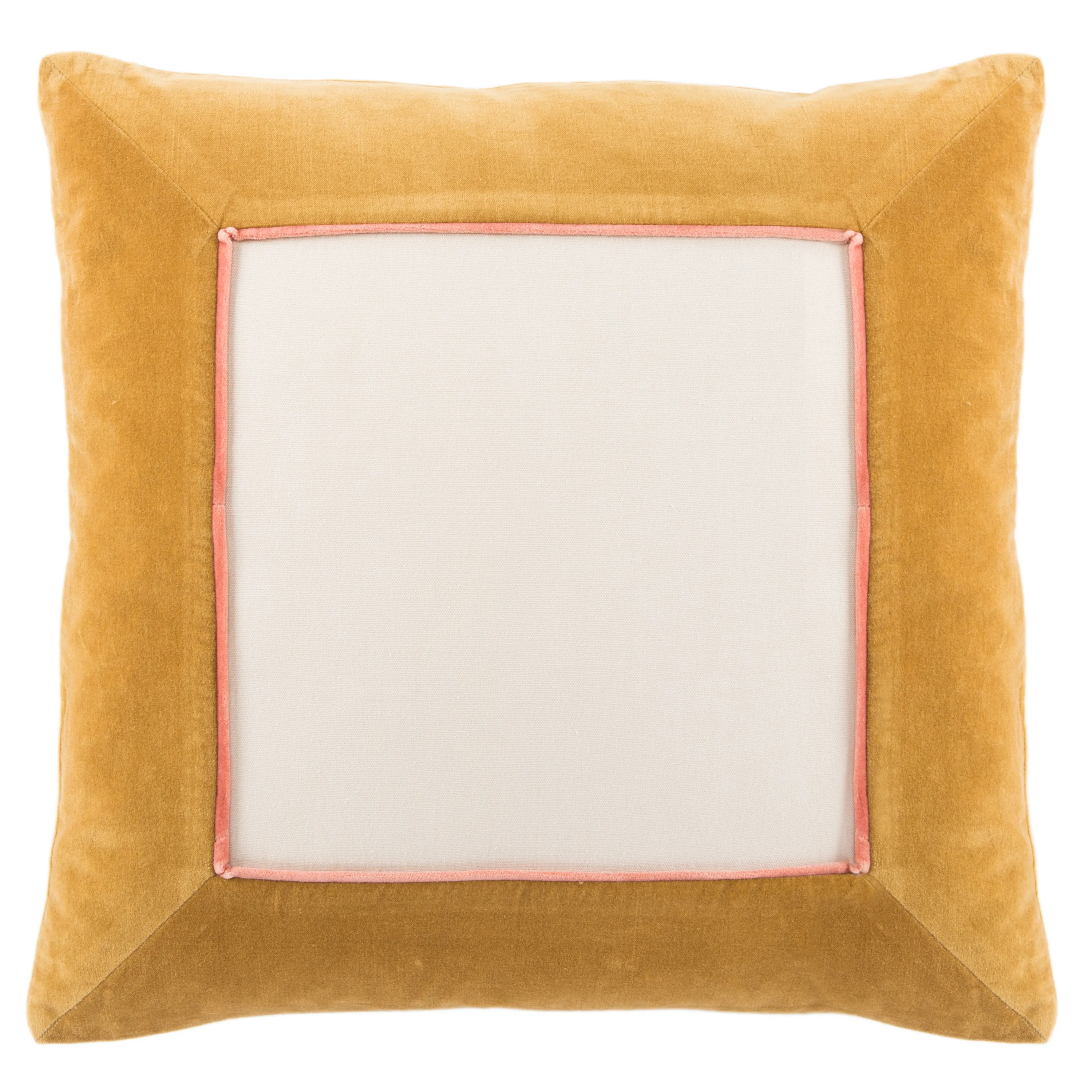 The Emerson pillow collection features an assortment of clean-lined, coordinating accents crafted of luxe cotton velvet. The Hendrix pillow boasts a border design and piped edge detailing in a gold and deep coral color scheme.
