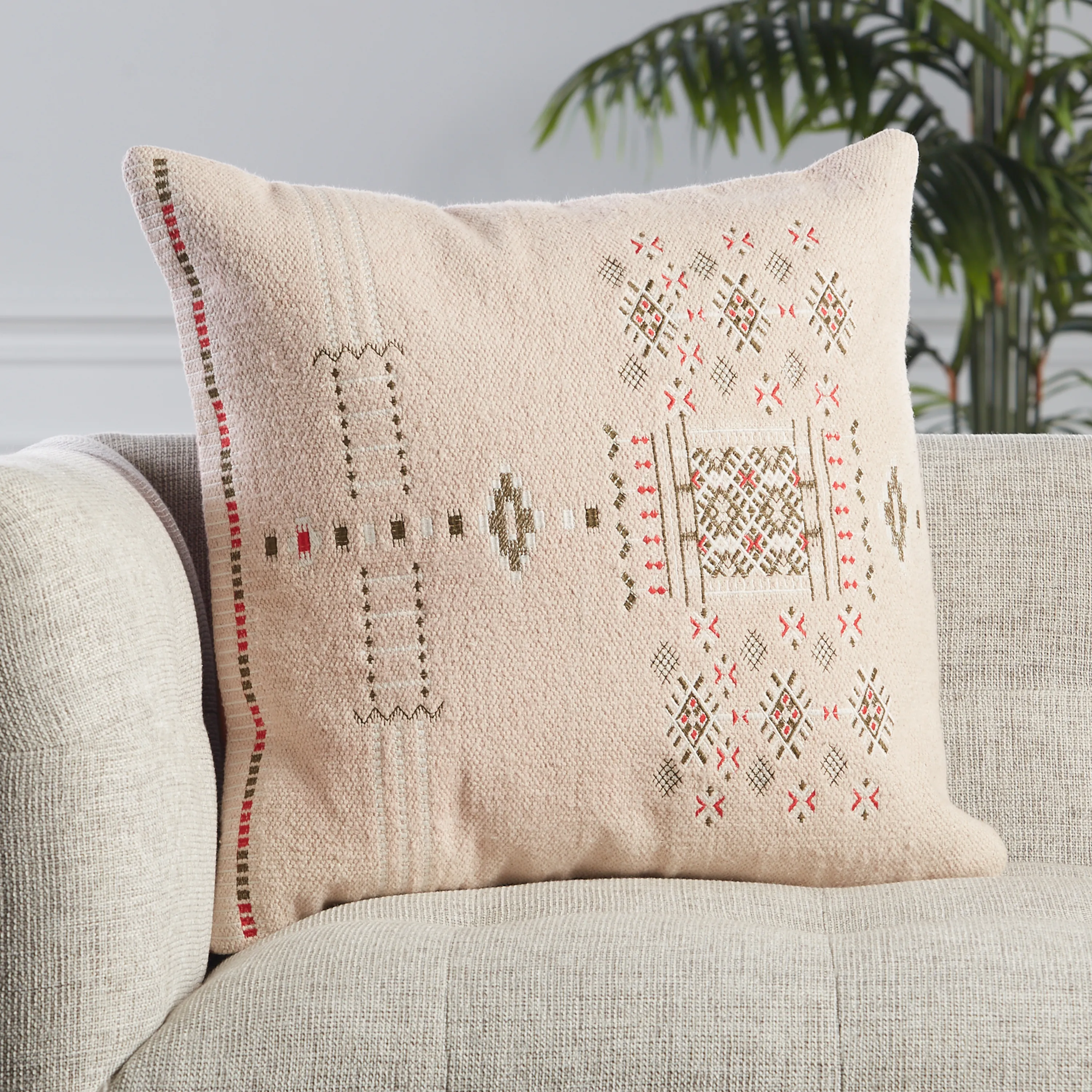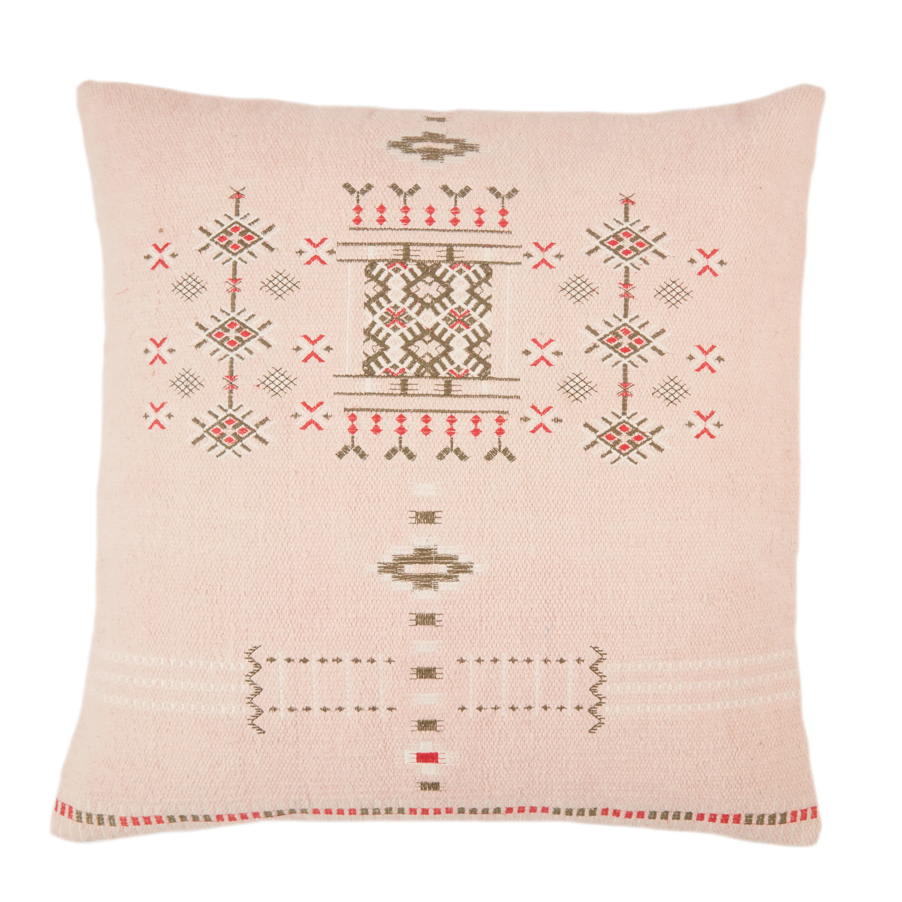Inspired by Moroccan Sabra styles, the Puebla collection boasts vibrant color palettes and intricate tribal embroidery. The Maram throw pillow features an on-trend blush colorway with rich brown, pink, and white details accenting the textural, cotton weave.