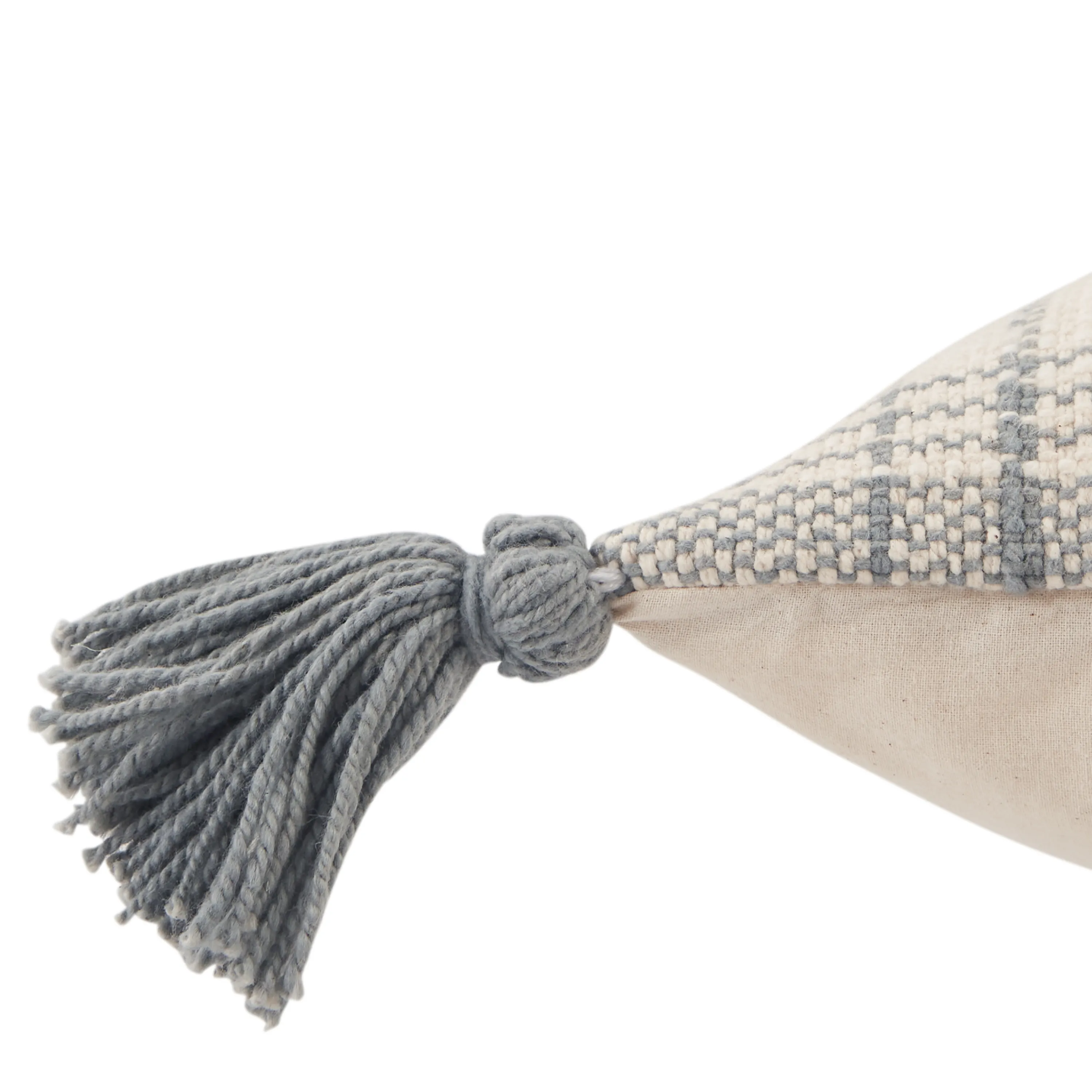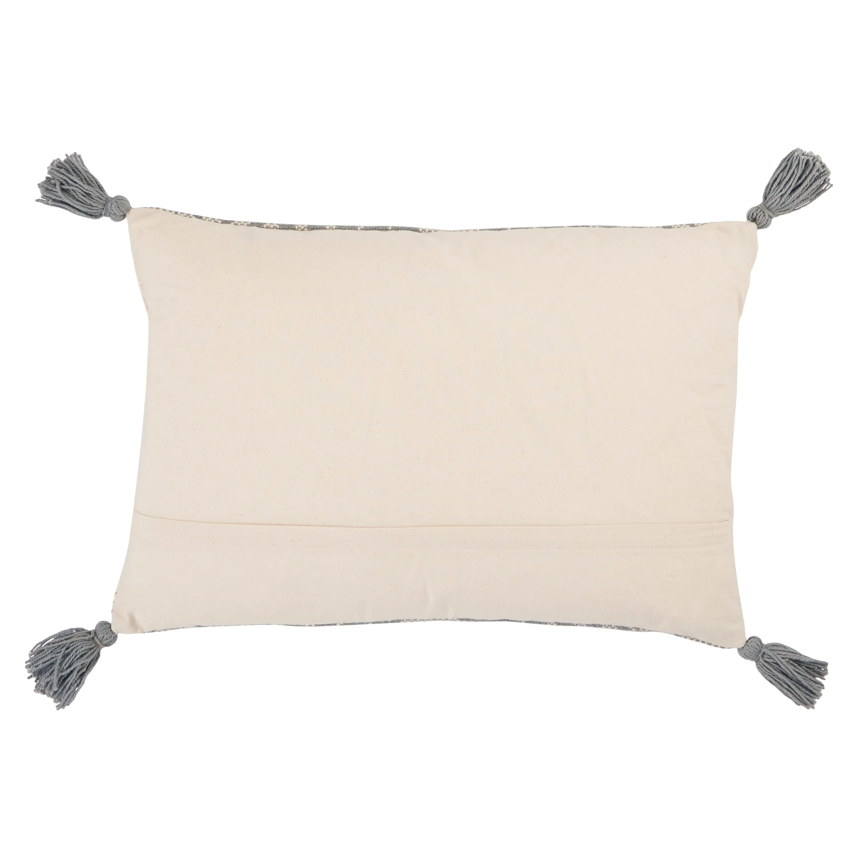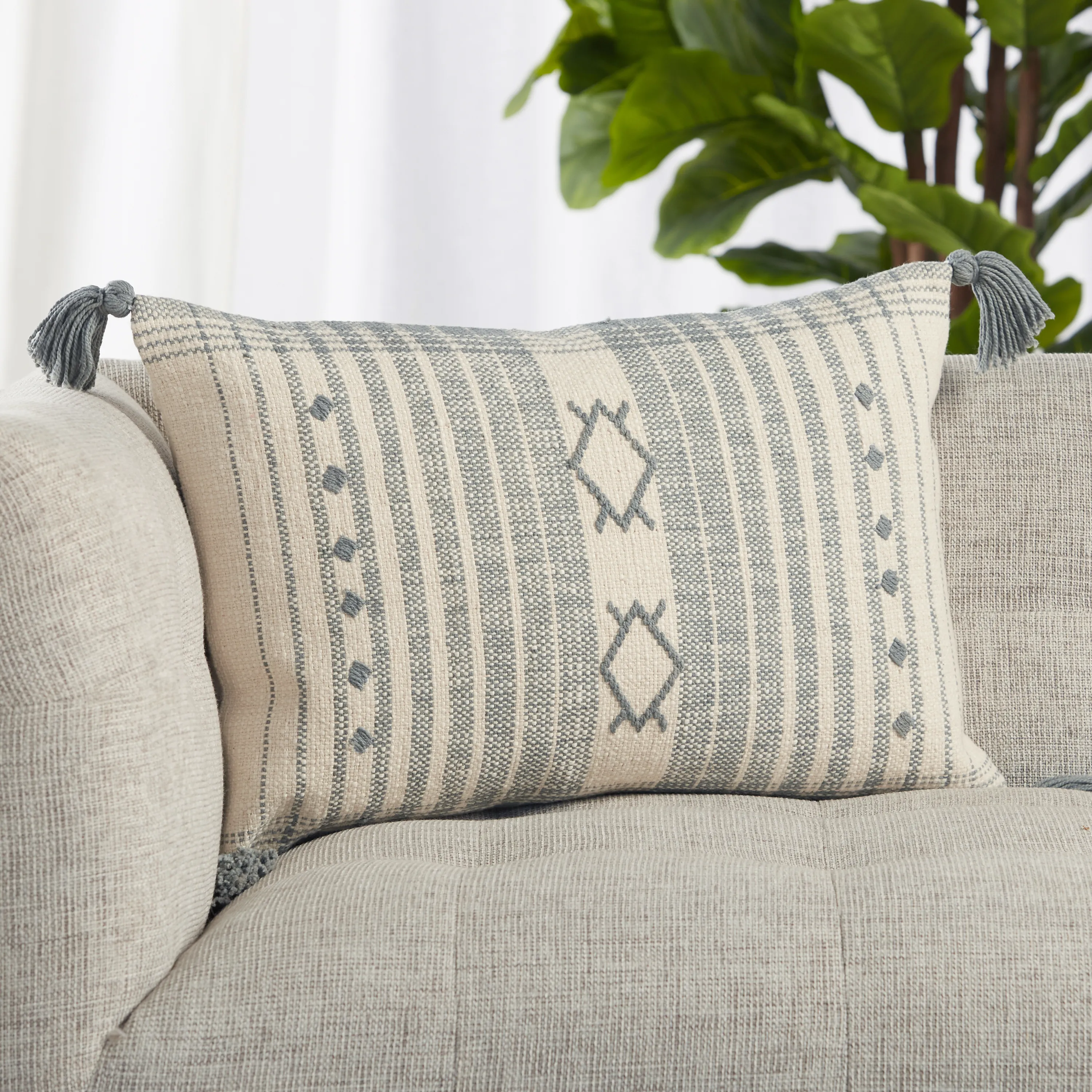 The Parable collection features Southwestern vibes and easy-going, fresh style. The Razili lumbar pillow showcases a mix of stripe and tribal motifs in chic tones of blue-gray and cream. Crafted of soft cotton, this light and neutral accent boasts bohemian touches of tasseled corners and a relaxed woven texture.