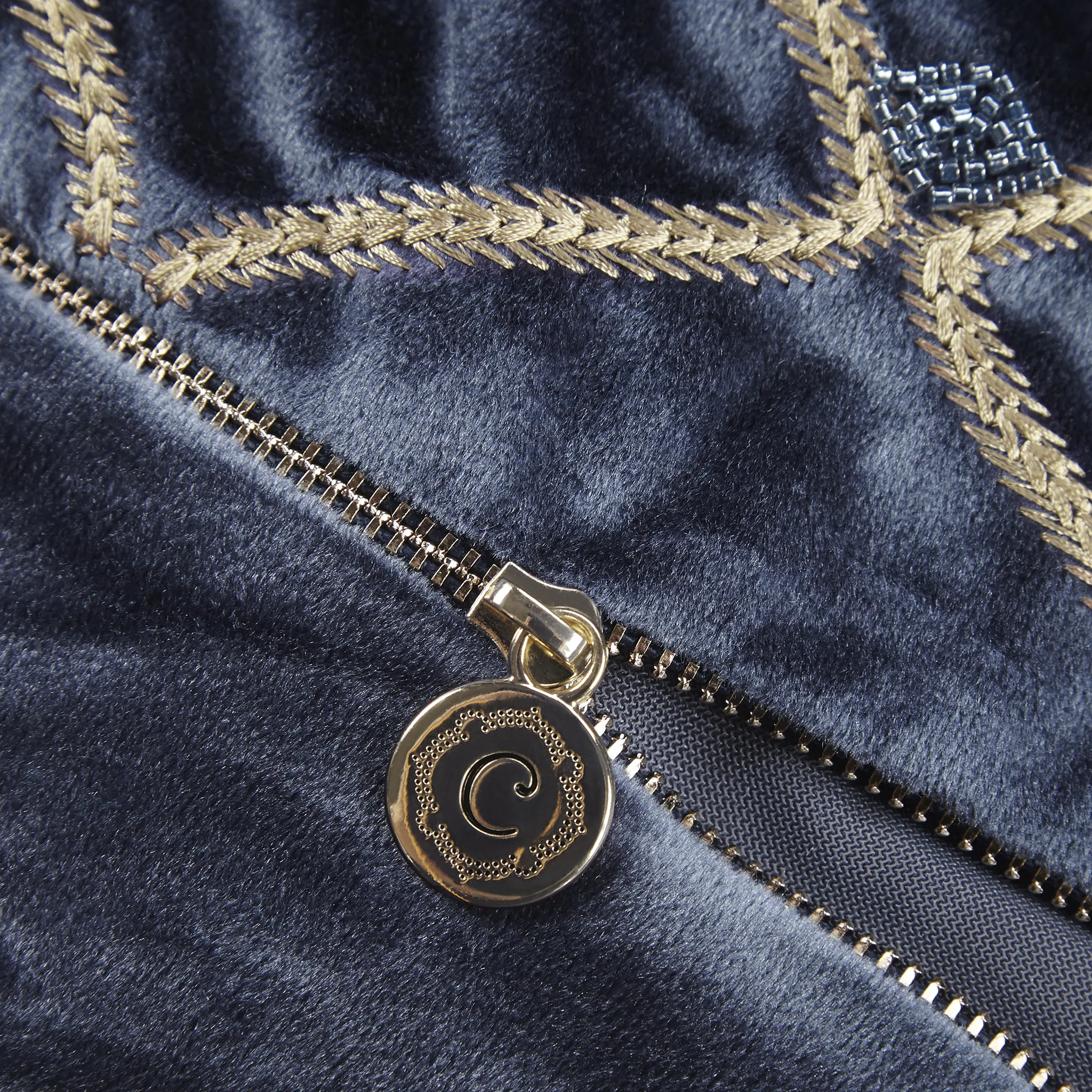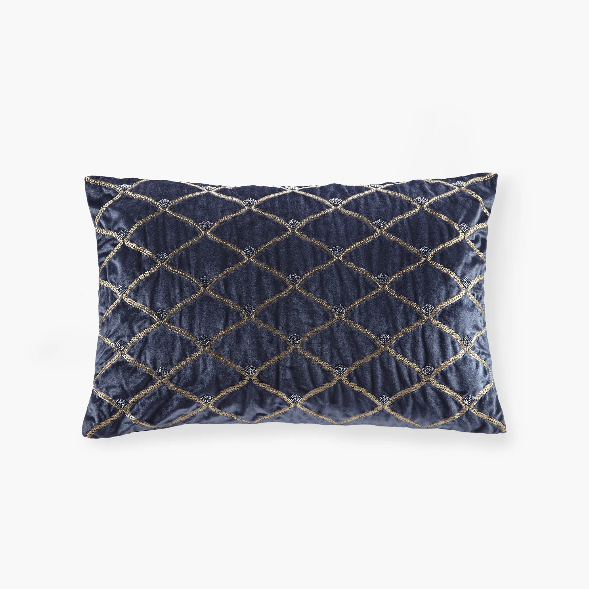 This sumptuous oblong pillow features foxtail stitched, net patterning with hand-beaded embellishments on a highly luxurious velvet cover. It comes with a removable white goose feather insert which is plump and soft to the touch.