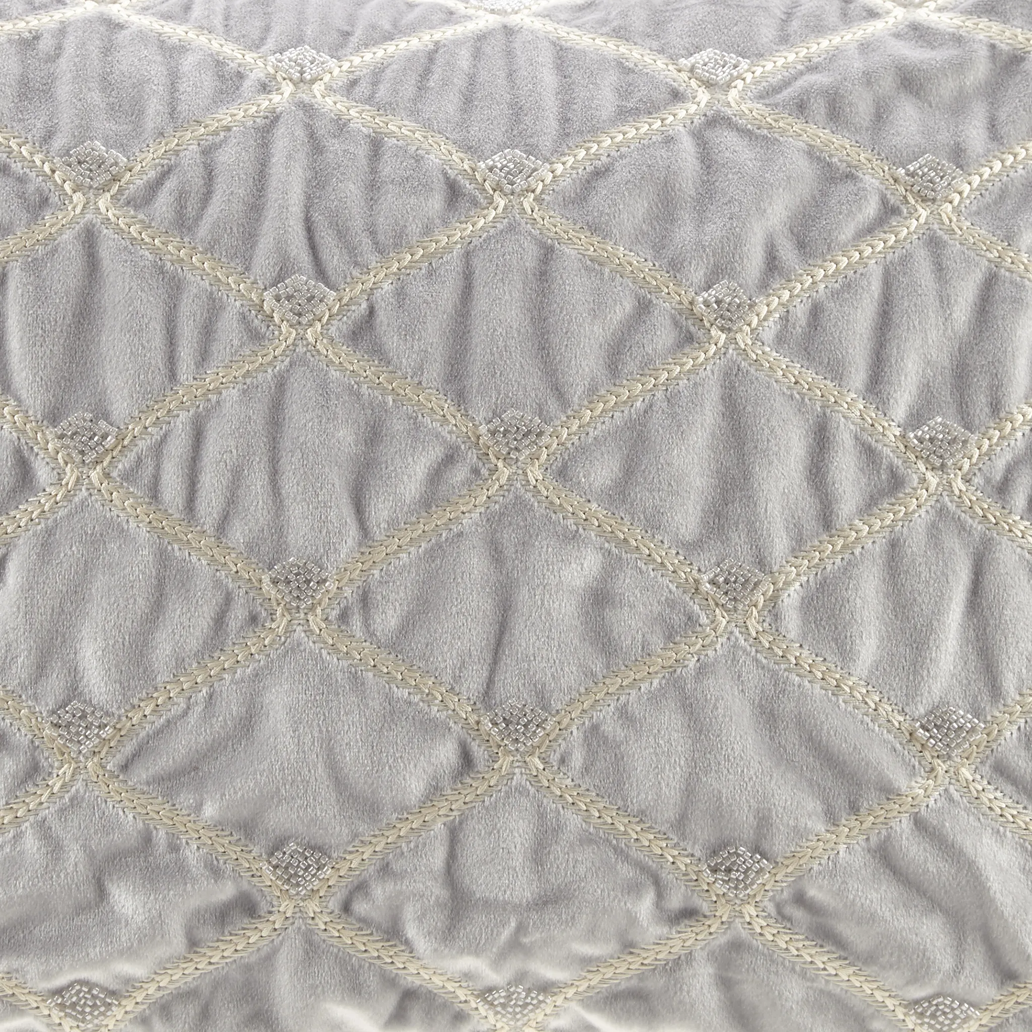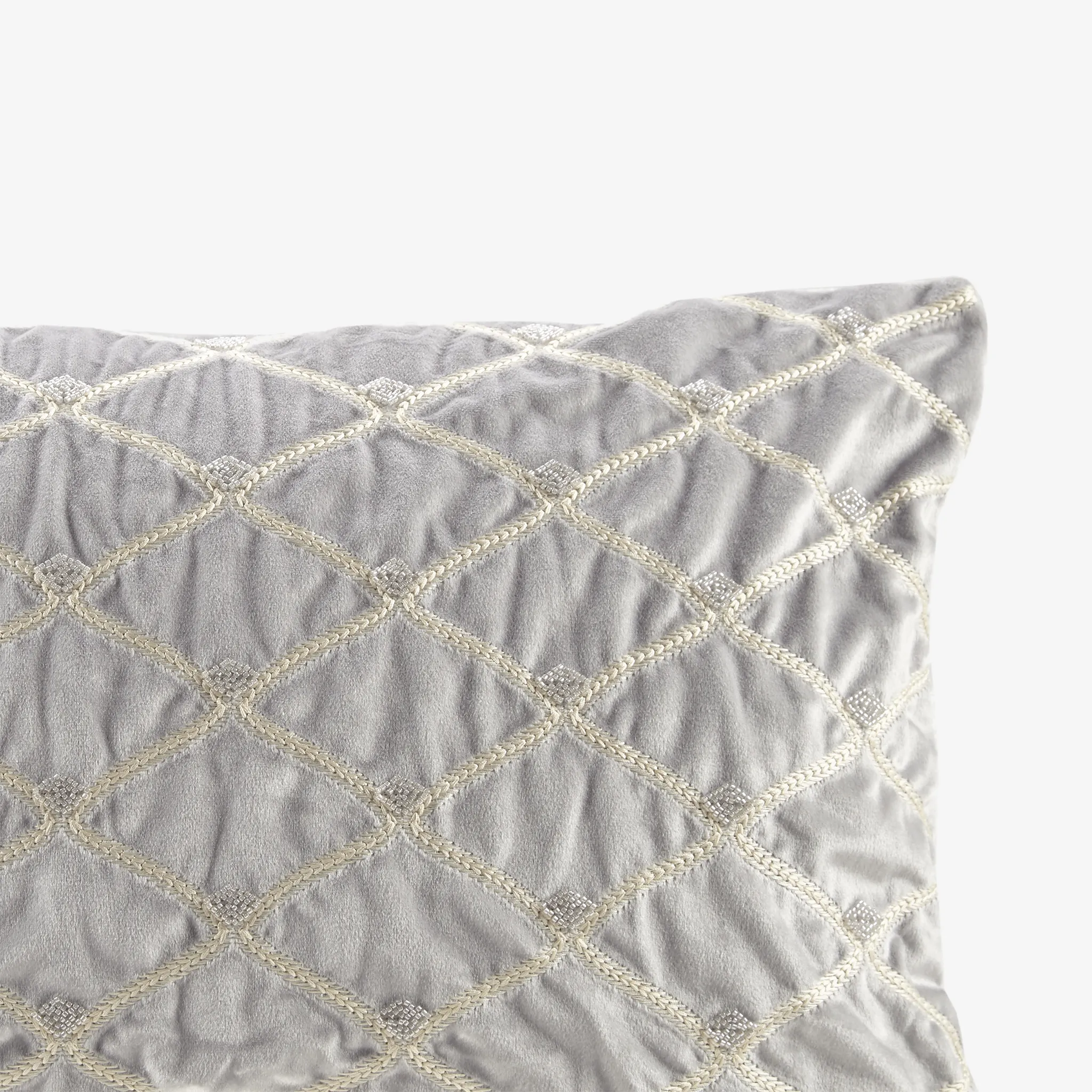 This sumptuous oblong pillow features foxtail stitched, net patterning with hand-beaded embellishments on a highly luxurious velvet cover. It comes with a removable white goose feather insert which is plump and soft to the touch.