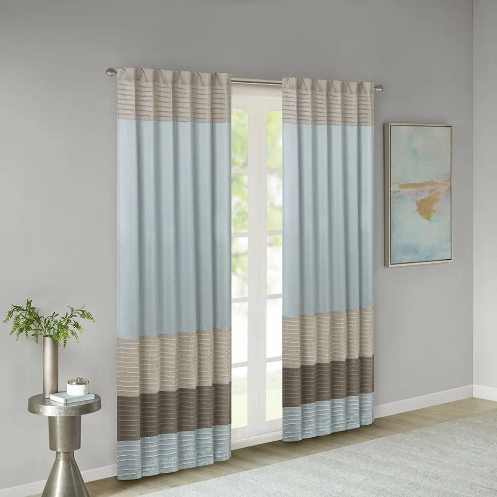Madison Park Amherst Polyoni Pintuck Window Curtain is a simple way to add style to your room. This window panel features a modern striped design in subtle hues of blue, taupe, and brown combined with pintuck detailing for beautiful texture and dimension. The added lining helps filter the perfect amount of light and creates fullness for better drapability. Simply hang using rod pocket or with back tabs for a tailored look. This window curtain fits up to a 1.25" diameter rod.