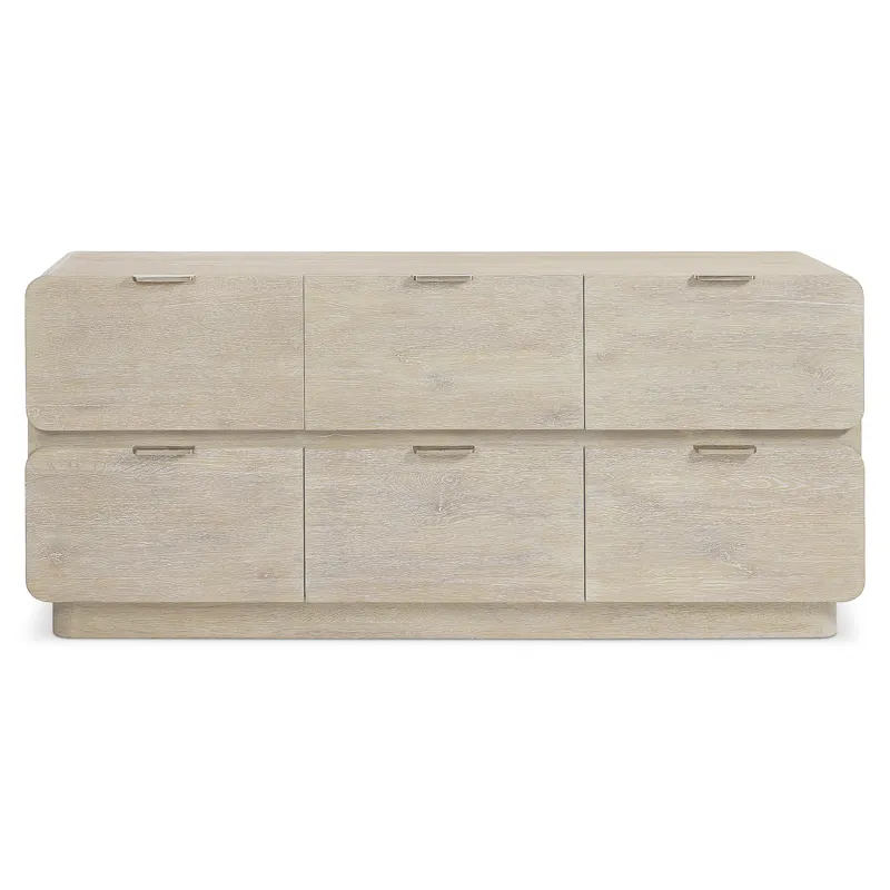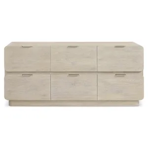 Antibes Dresser (350054): 68 x 20 x 30 - Elemental design gets a refined and modern update for the Antibes dresser. Softened corners and shapely drawer fronts have an organic simplicity with the rustic Roz finish. The case is supported with a plinth base and features six pull-to-open drawers with cast aluminum pulls. Rustic Oak Dresser in Roz finish. Six pull-to-open drawers with Cast Aluminum Tab pulls in Graphite finish. Plinth Base. Adjustable glides. Anti-tip kit.