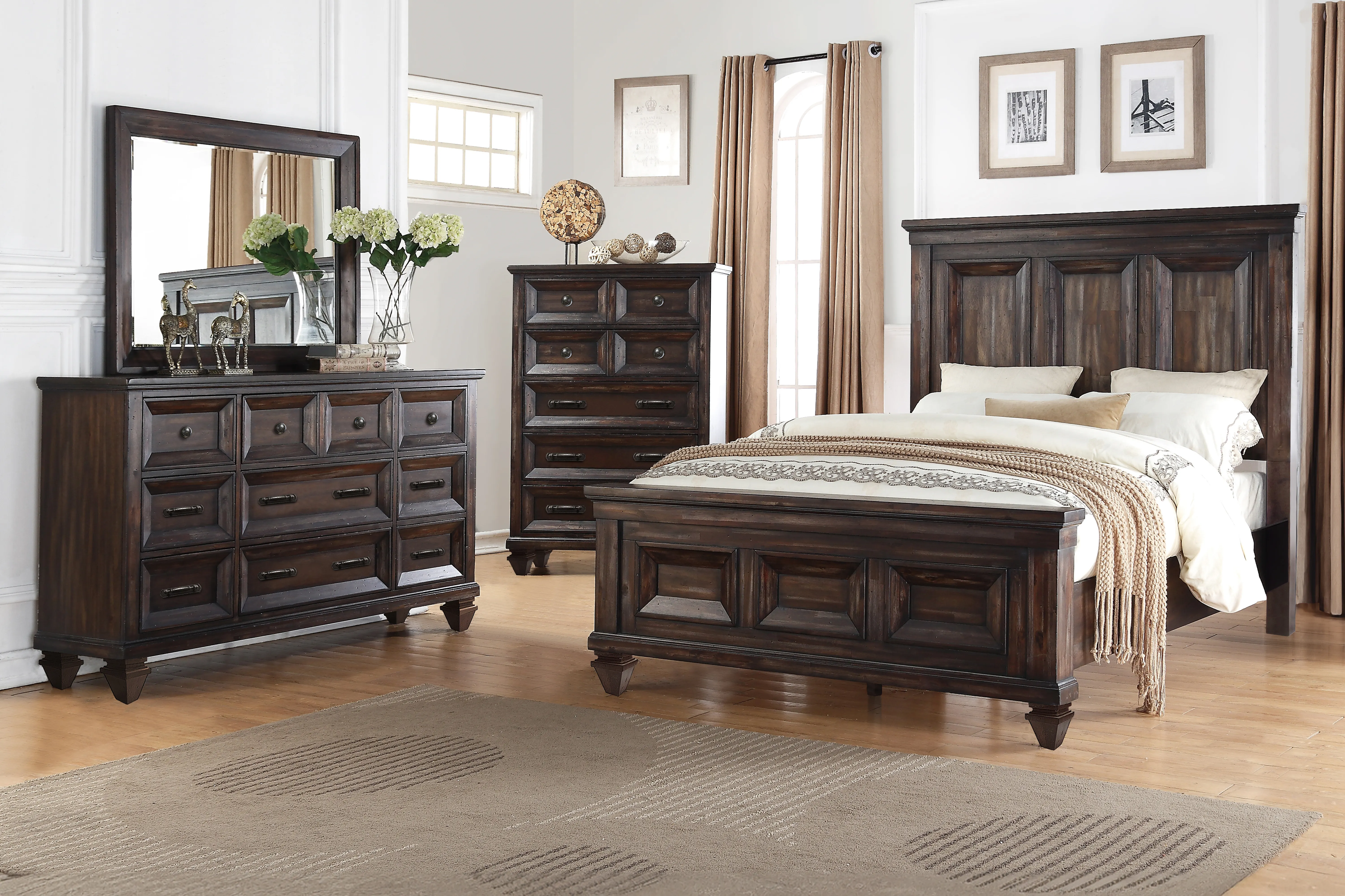 The Sevilla 4-Piece Bedroom Set in walnut offers a perfect blend of timeless craftsmanship and functional elegance. Each piece is crafted from solid Acacia wood, enhanced with Acacia veneers, and features a rich, hand-distressed walnut finish that exudes vintage charm. The bed stands as a majestic centerpiece with its thick crown moldings and wide picture frame panels, while the dresser and chest combine beauty with practicality through dovetail joinery, velvet-lined drawers, and smooth full-extension glides. Completing the set, the mirror’s wide frame and crystal-clear beveled glass provide impeccable functionality and sophistication. Ideal for classic or rustic-inspired spaces, this set effortlessly balances style and durability, making it a captivating focal point in any bedroom.