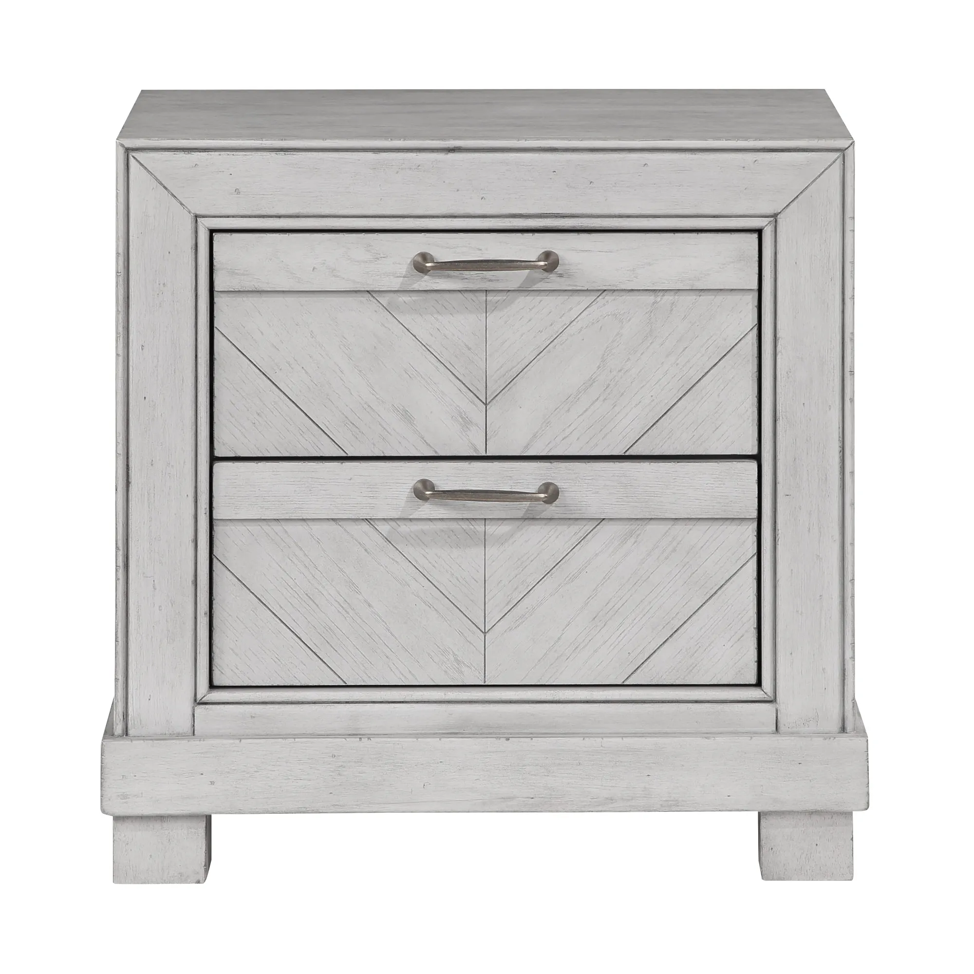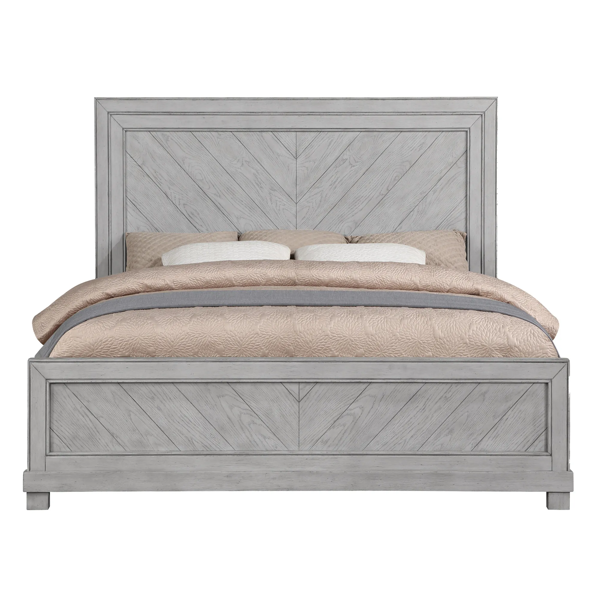 Rustic charm meets modern functionality in the Montana Gray 3-Piece Queen Bedroom Set. Finished in a soft gray stain with oil-rubbed brass hardware, this set exudes a relaxed, casual aesthetic perfect for any bedroom. The Queen Bed features a striking chevron-patterned headboard, bringing a touch of craftsmanship to its rustic appeal. The included Nightstands offer felt-lined top drawers for delicate items and fully extendable deep drawers for optimized storage. This 3-piece set includes a Queen Bed and two Nightstands, creating a stylish and functional retreat.