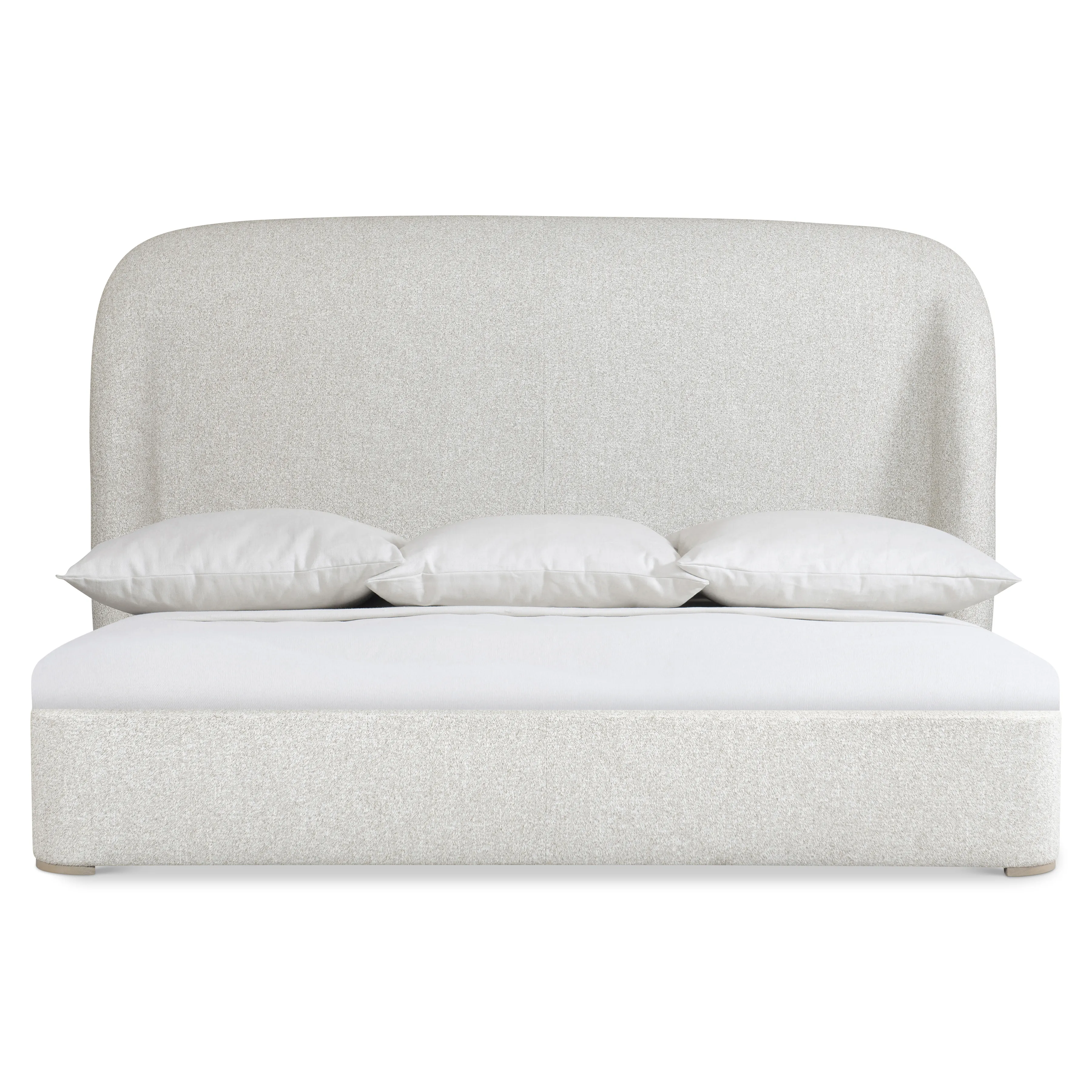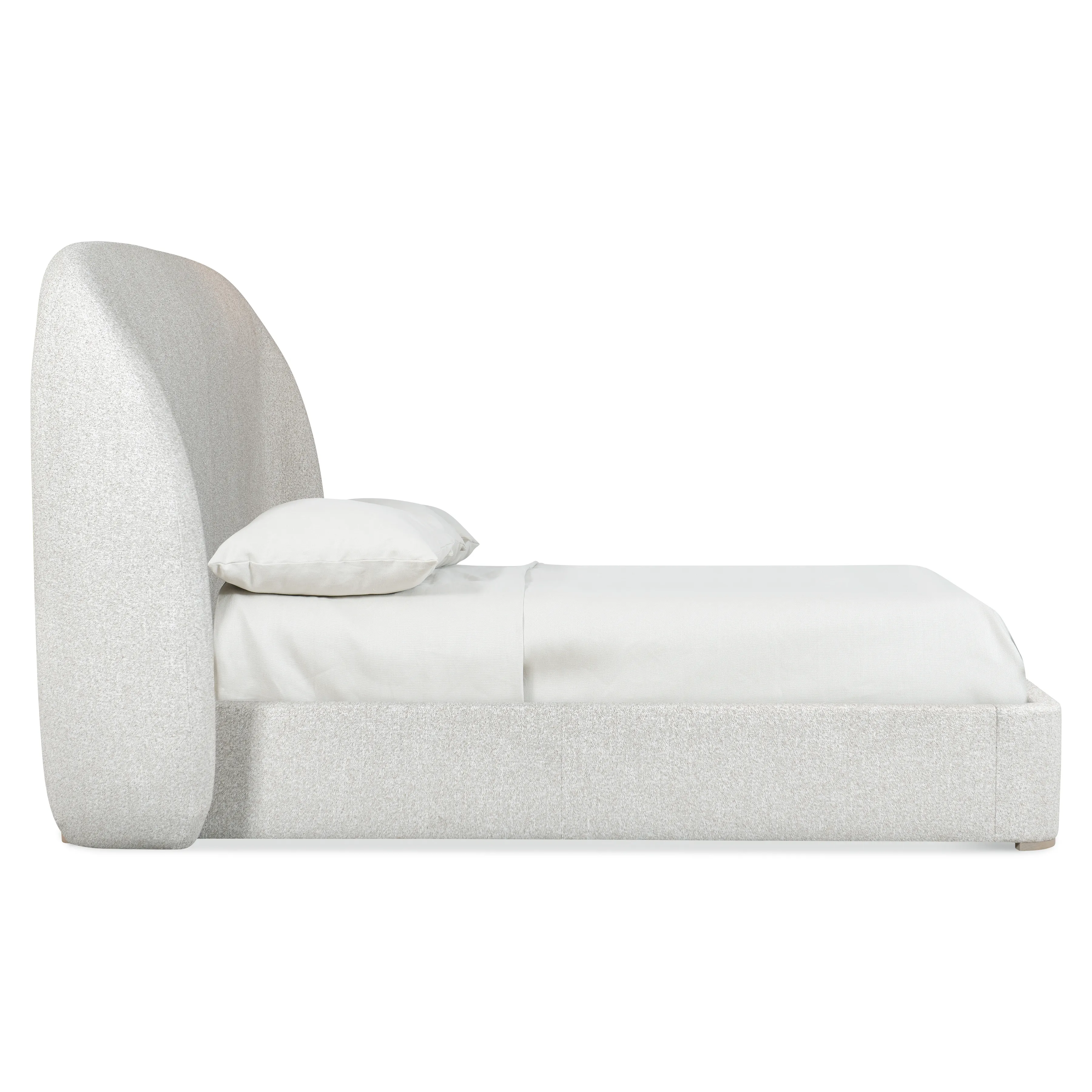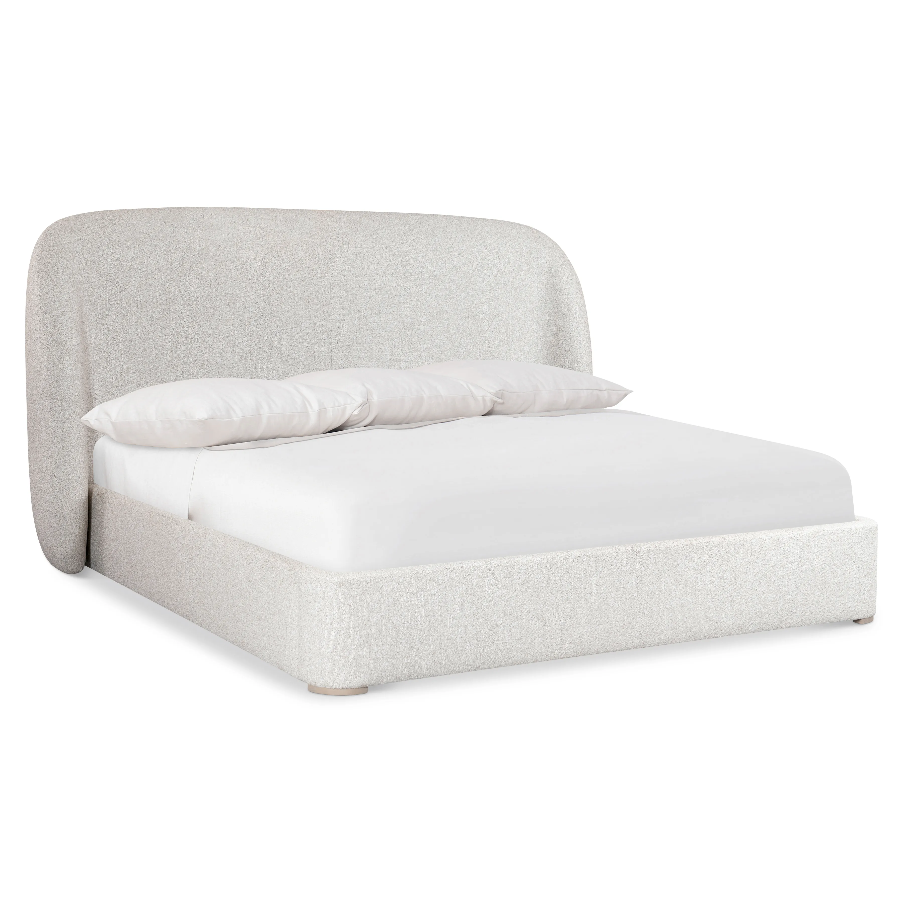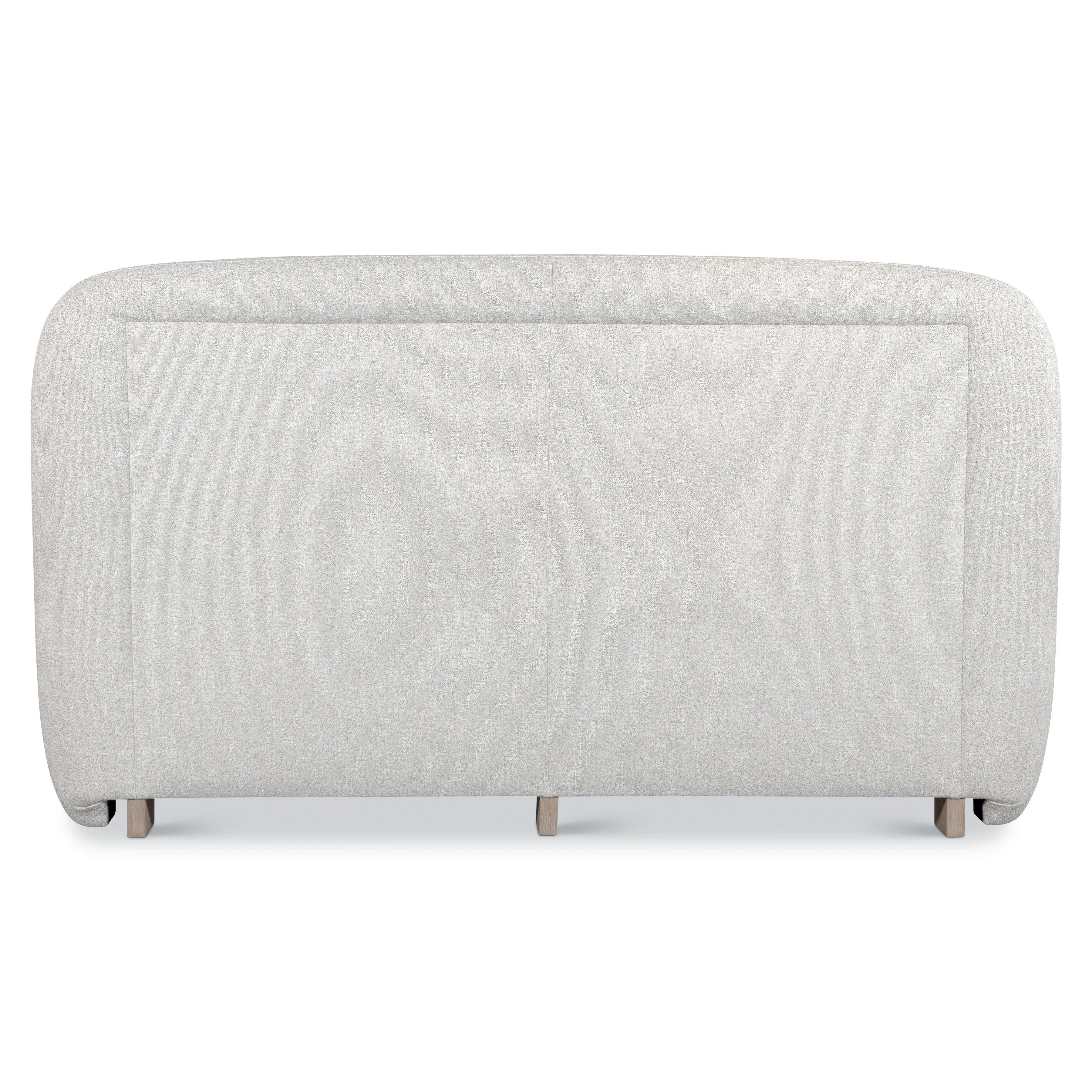 Upholstered panels bend and curve for a new modern shelter style on the Loggia bed. The headboard arcs toward the floor with wings that embrace the side panels. The soft shaping is accentuated by the fabric, while the bed is supported by exposed wood feet in Aria finish.