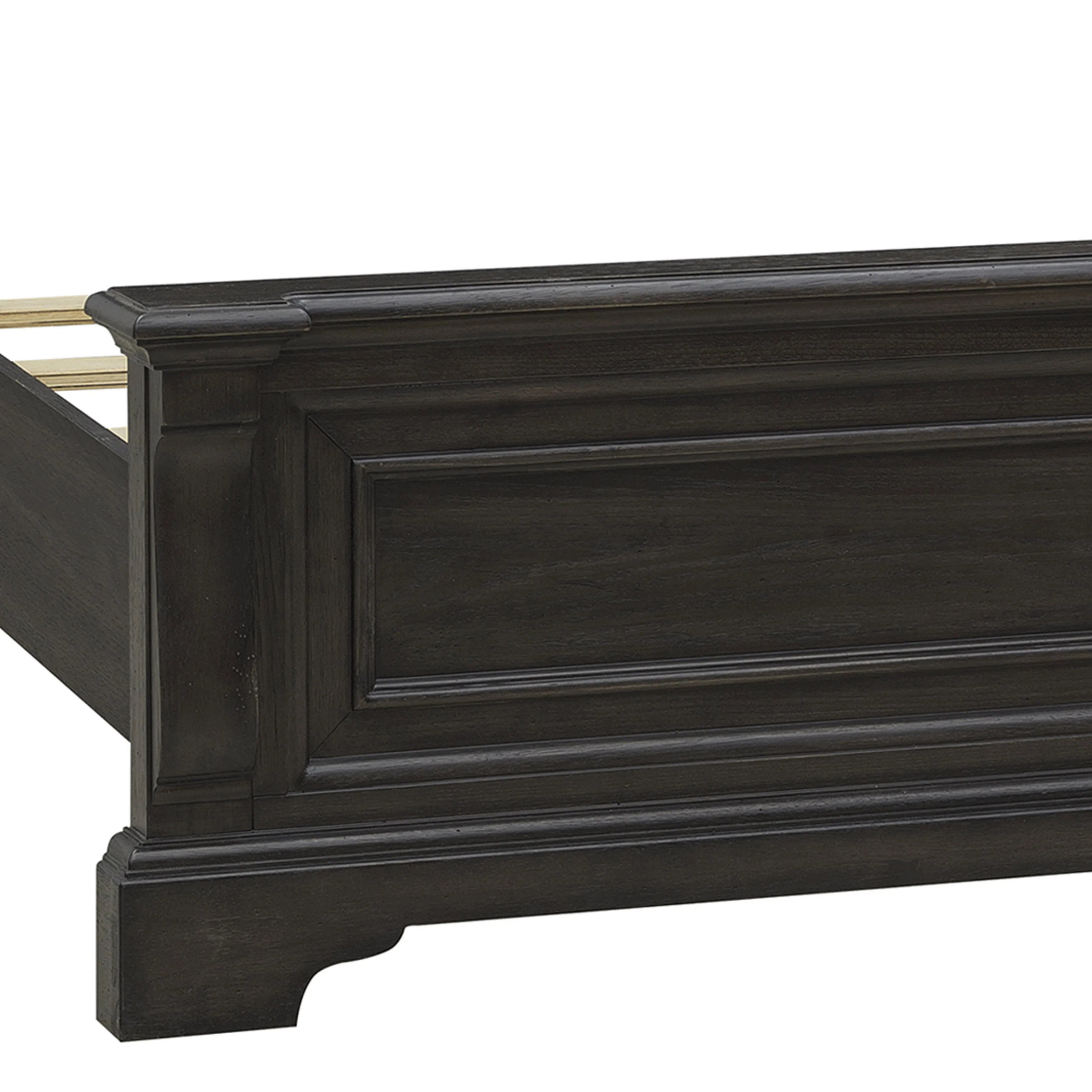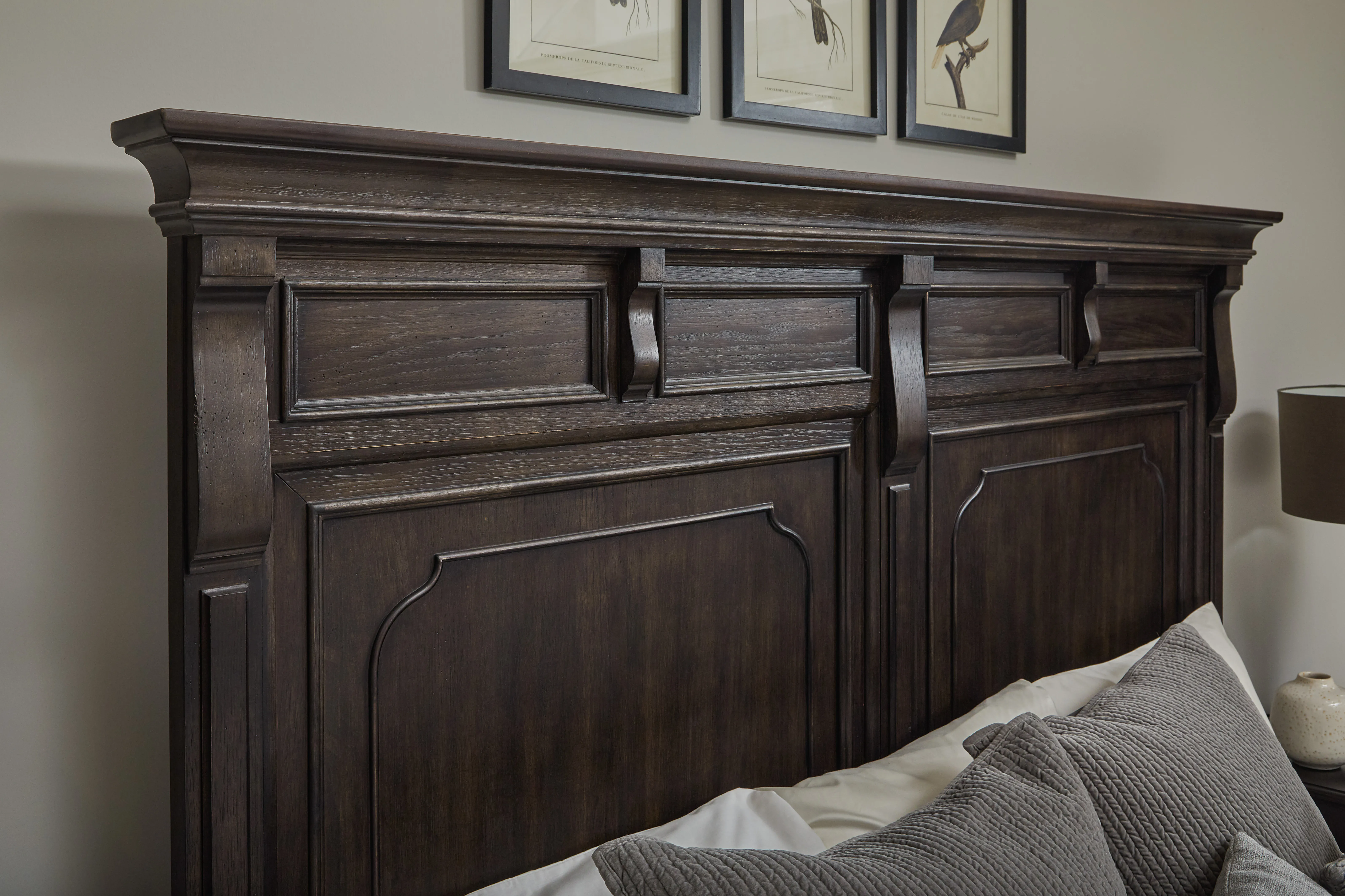 Discover the perfect blend of strength and sophistication with our Hickory Creek California King Panel Bed. It showcases a stately mantel-style headboard in a luxurious Brown Velvet finish with a distinctive vertical break, adding architectural depth and refined elegance. Crafted from split heart cathedral hickory veneers, the rich grain patterns and natural variation bring visual interest and heritage appeal to every detail. This bed embodies classic English style, craftsmanship, and masculine charm, making it perfect for those who appreciate timeless design.