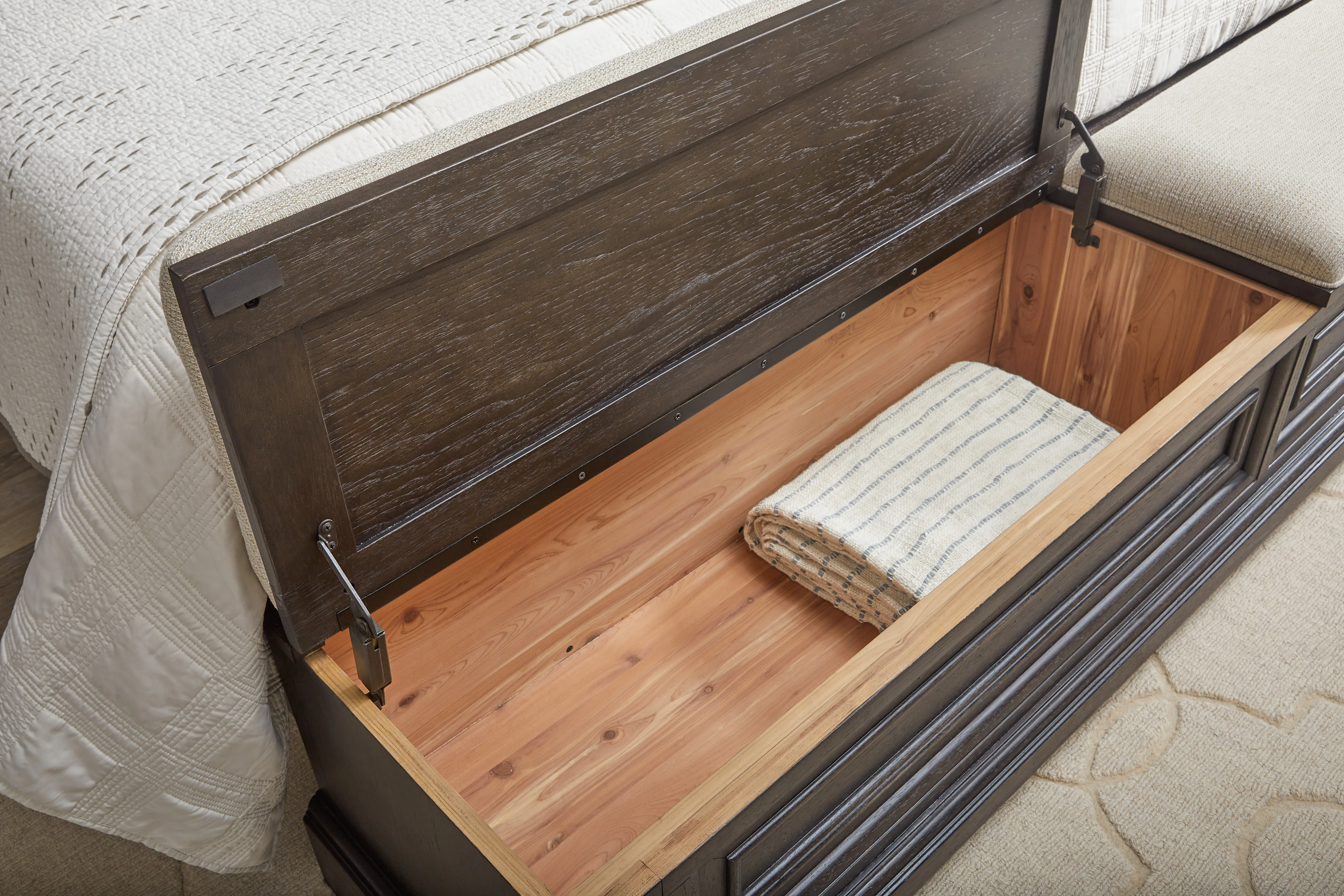 Discover the perfect blend of strength and sophistication with our Hickory Creek California King Storage Bed. It showcases a stately mantel-style headboard in a luxurious Brown Velvet finish with a distinctive vertical break, adding architectural depth and refined elegance. The footboard has built-in storage compartments with upholstered hinged tops, perfect for storing bedding, clothes, and other essentials. Crafted from split heart cathedral hickory veneers, the rich grain patterns and natural variation bring visual interest and heritage appeal to every detail. This bed embodies classic English style, craftsmanship, and masculine charm, making it perfect for those who appreciate timeless design.