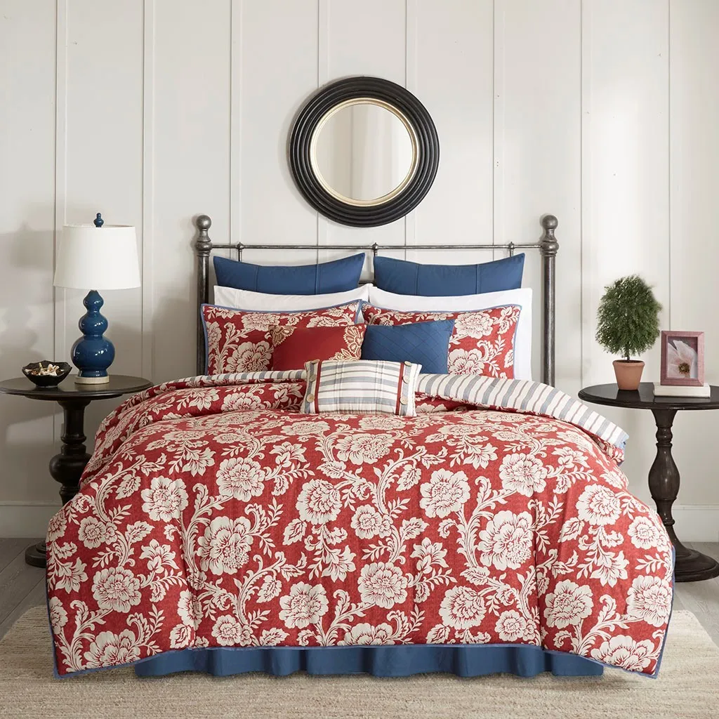 The Madison Park Lucy 9 Piece Cotton Twill Reversible Comforter Set offers a cozy cottage update to your bedroom. This cotton twill comforter features a floral motif in a classic color scheme that flips to a complimentary striped pattern on the reverse. Two coordinating shams flaunt the same pattern as the comforter, while two Euro shams add a touch of color to the comforter set. Three decorative pillows with embroidery and fabric manipulation and a solid bed skirt complete this country comforter set. This bedding set is also OEKO-TEX certified, meaning it does not contain any harmful substances or chemicals to ensure quality comfort and wellness.