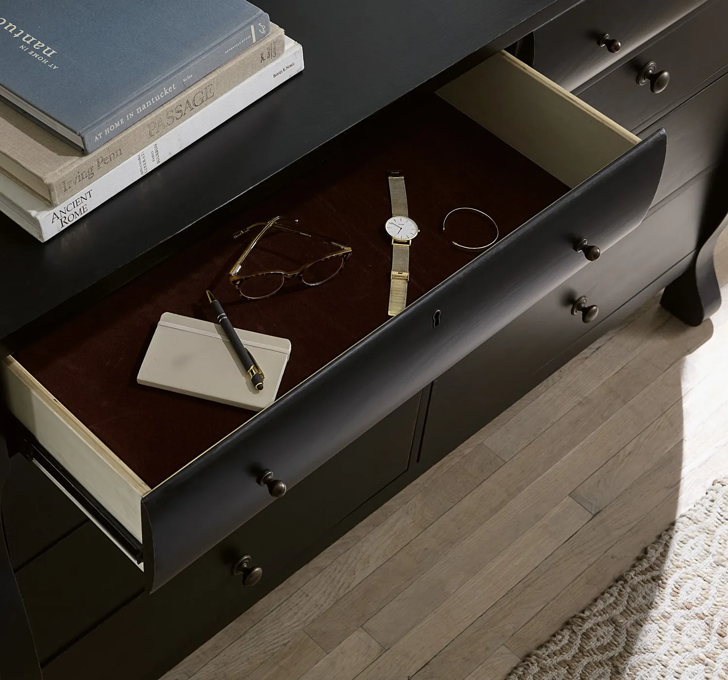 Felt Lined Top Drawers: The beautiful premium felt lining helps protect delicate items and reduces movement of objects while opening and closing the drawer.