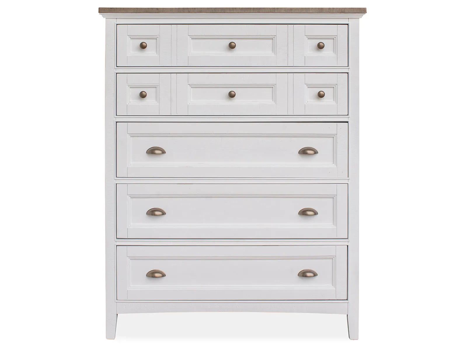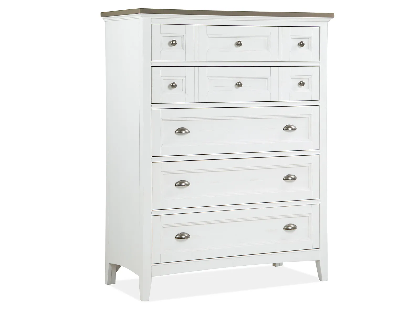 A soft Chalk White finish on Pine veneers and solids creates a relaxed beachy feel in any bedroom with Heron Cove. Select pieces offer a two-tone look with Dovetail Grey tops. A high back beaded framed panel bed lends shaker appeal and is available with hidden rails storage. Straight legs support the straight-lined chests with raised beaded trim for cottage appeal. Come home to Heron Cove!