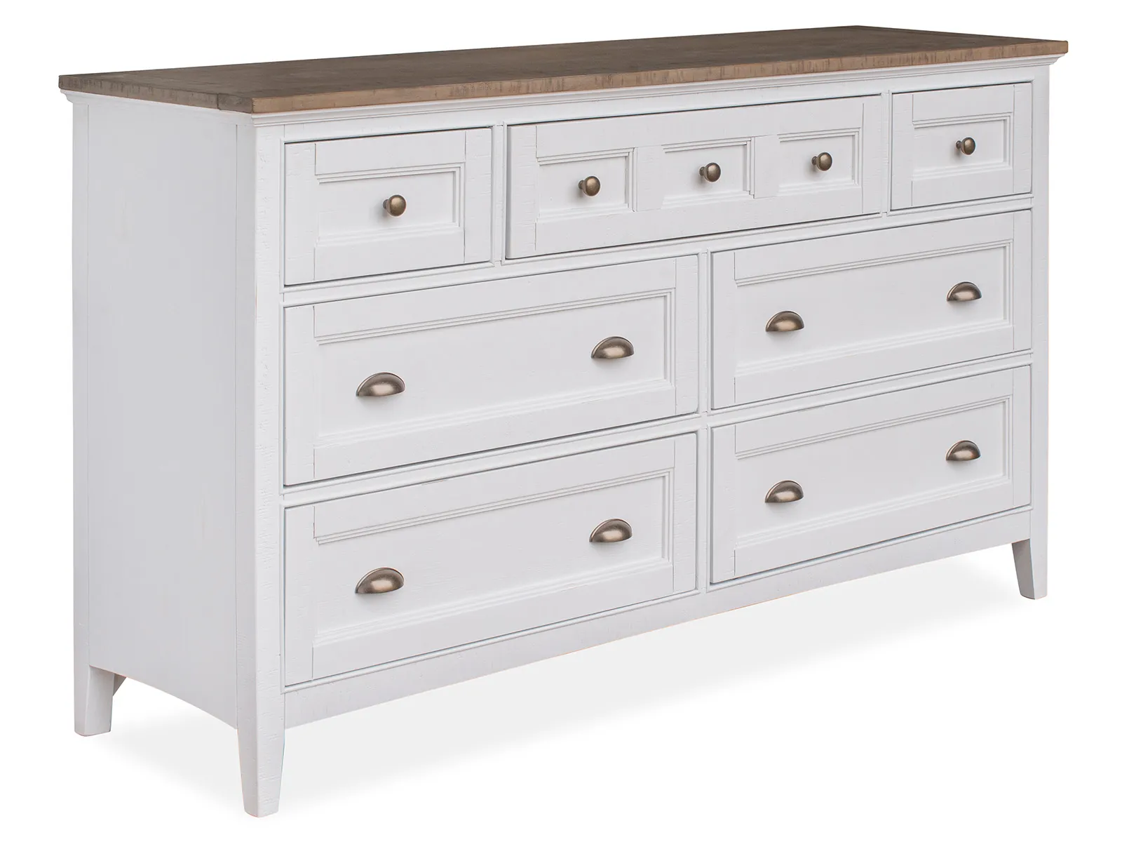 A soft Chalk White finish on Pine veneers and solids creates a relaxed beachy feel in any bedroom with Heron Cove. Select pieces offer a two-tone look with Dovetail Grey tops. A high back beaded framed panel bed lends shaker appeal and is available with hidden rails storage. Straight legs support the straight-lined chests with raised beaded trim for cottage appeal. Come home to Heron Cove!