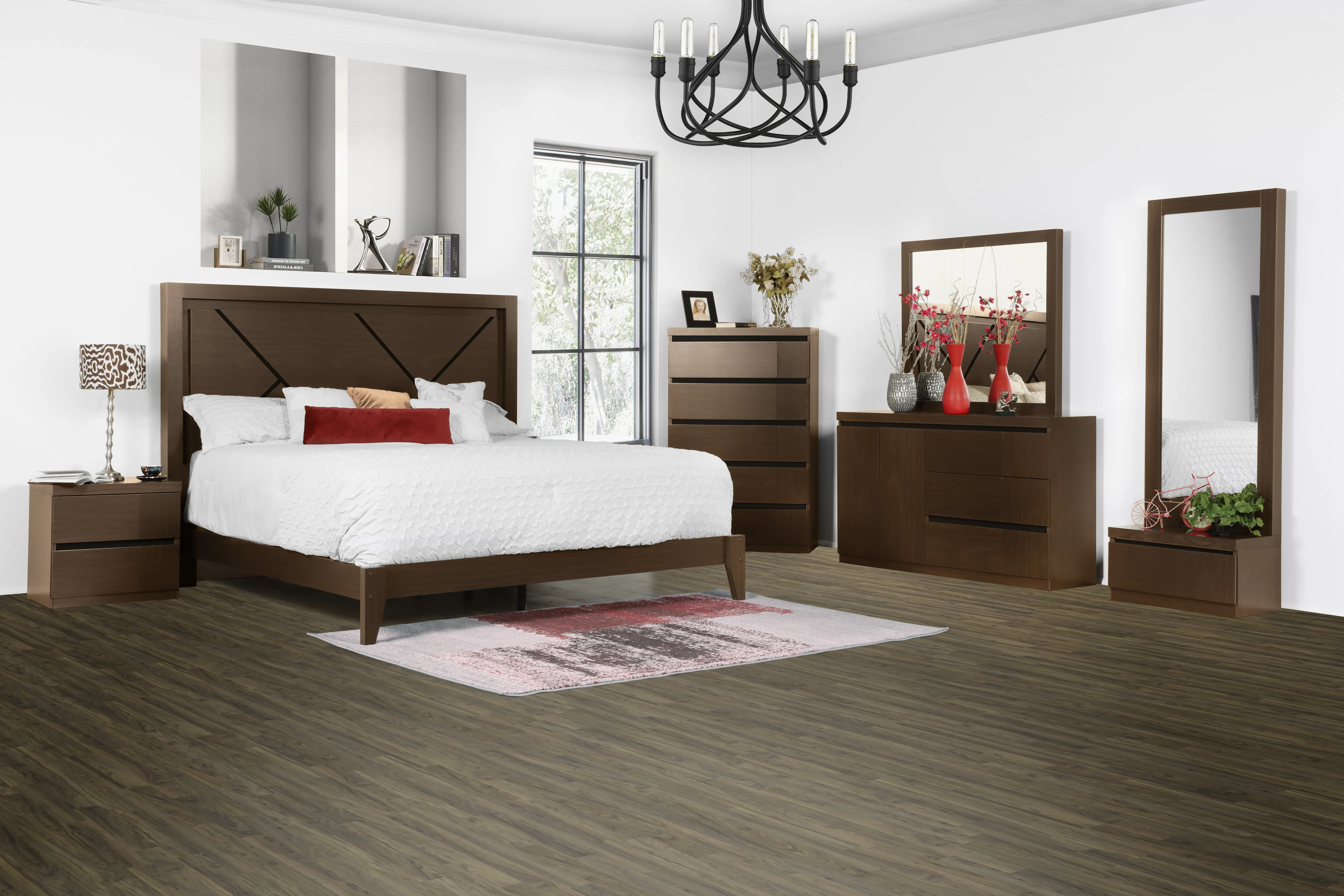 The Chadwick Bedroom set from New Classic Furniture is the perfect way to add a touch of luxury to your home. Made from MDF with a printed walnut grain, this furniture is built to last with English dovetail construction and full extension glides. The stained finish and silver accents give it a sophisticated look that will complement any decor. This set includes a nightstand, dresser, mirror, chest, standing mirror and base, and headboard. It is also heat, water, and scratch resistant for added durability.