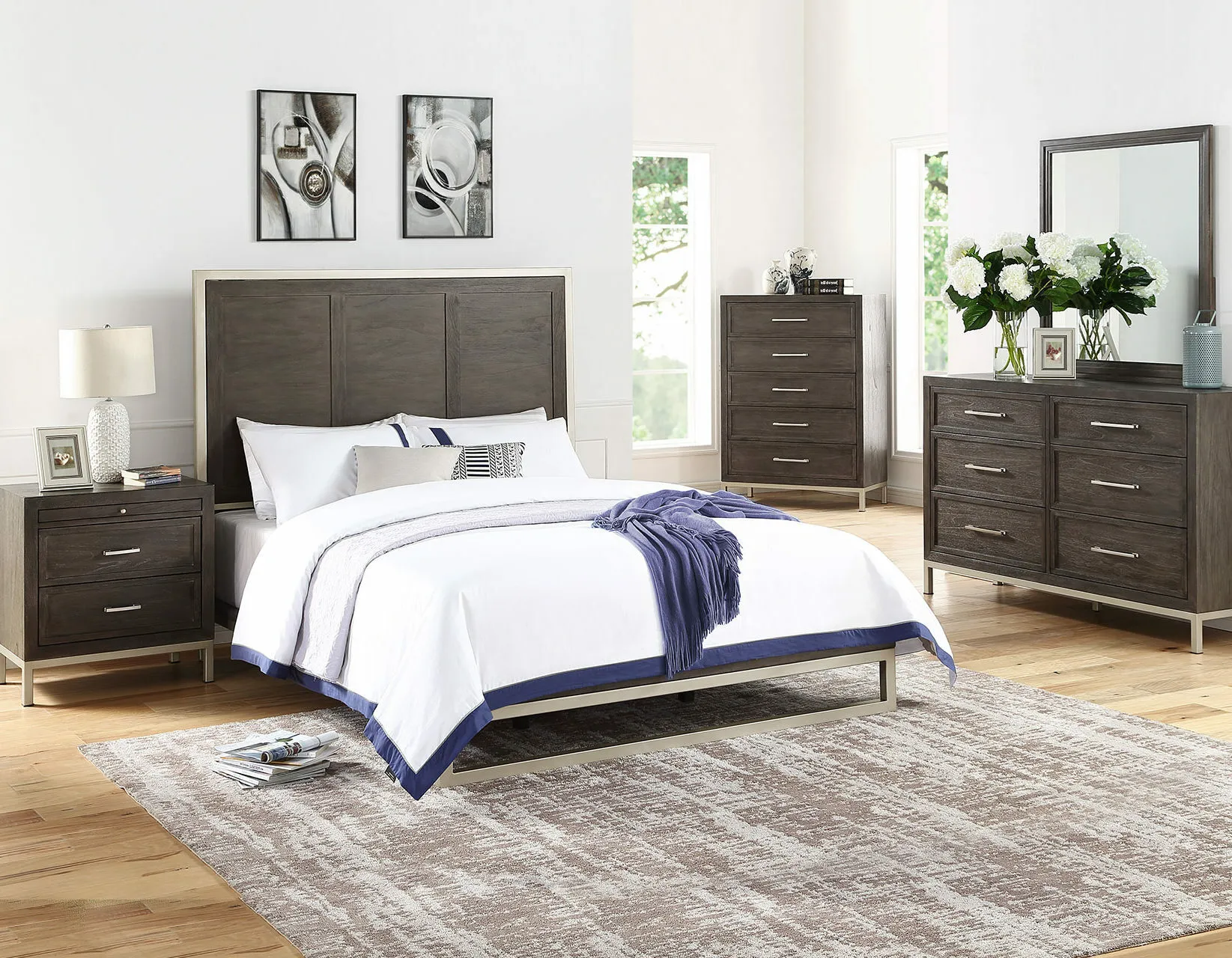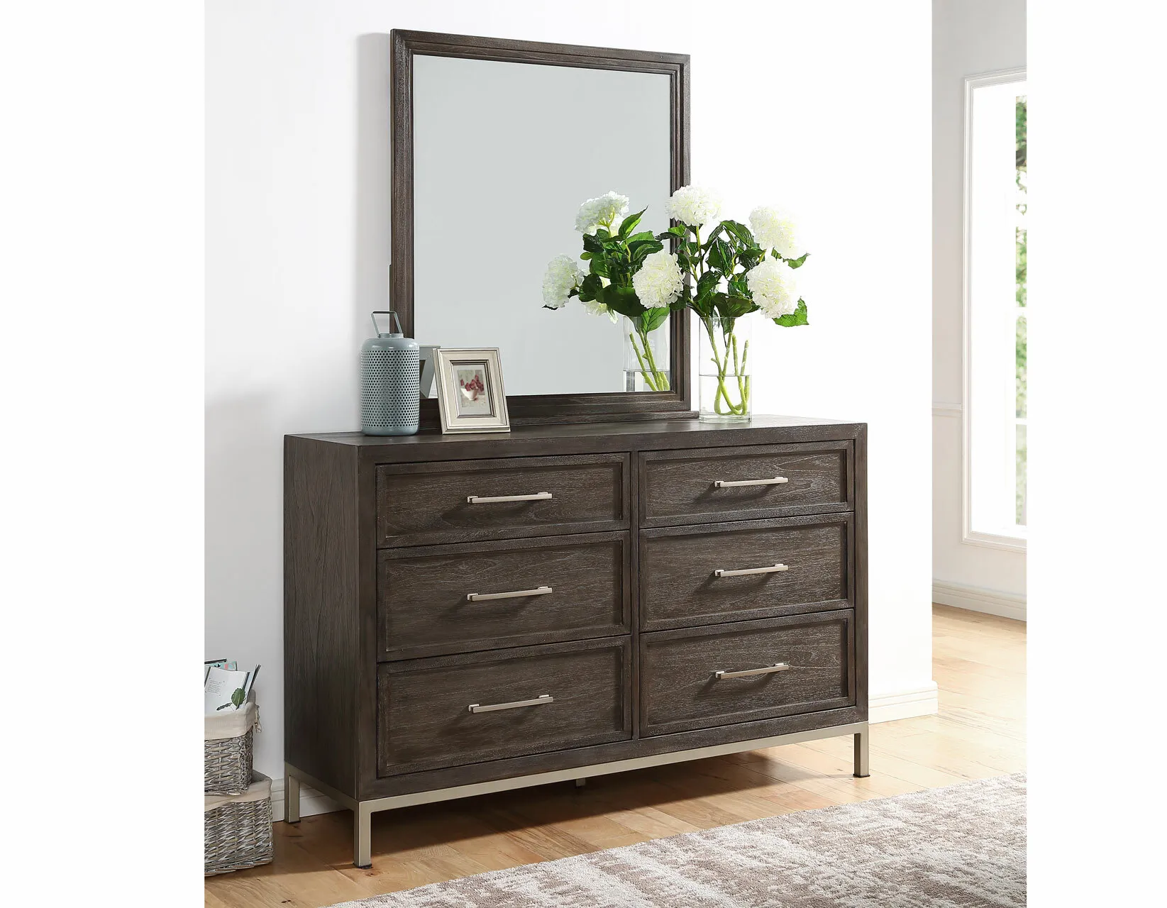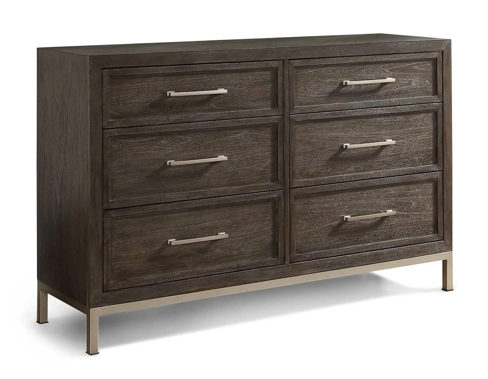 With a modern take on transitional styling, Broomfield is a study in simplicity with clean lines and an elegant mix of materials. This Dresser is sleek, yet warm and inviting with a warm walnut color finish that beautifully complements the champagne finished metal on bases and hardware. Picture frame drawer fronts add just the right amount of trim to accent the Dresser perfectly.