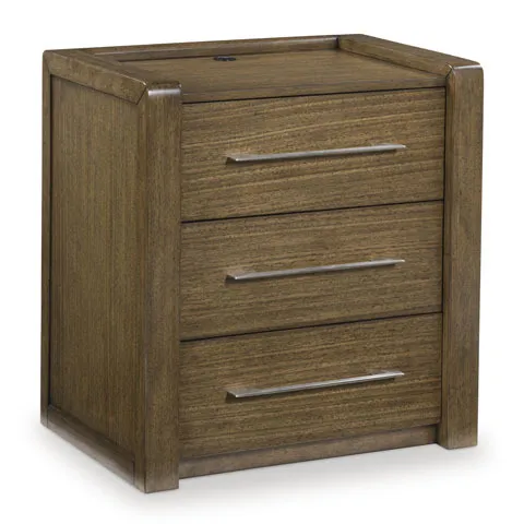 Clean lines. Classic finish. Complete harmony. Create a contemporary retreat with this nightstand. Its versatile brown finish brings warmth to your space, while the sleek form and chic gallery rail add a modern touch. Luxe bar pulls dress up the drawers with subtle sophistication. Crafted with eucalyptus wood veneer and equipped with USB charging, this nightstand caters to both your everyday comforts and your eye for design.