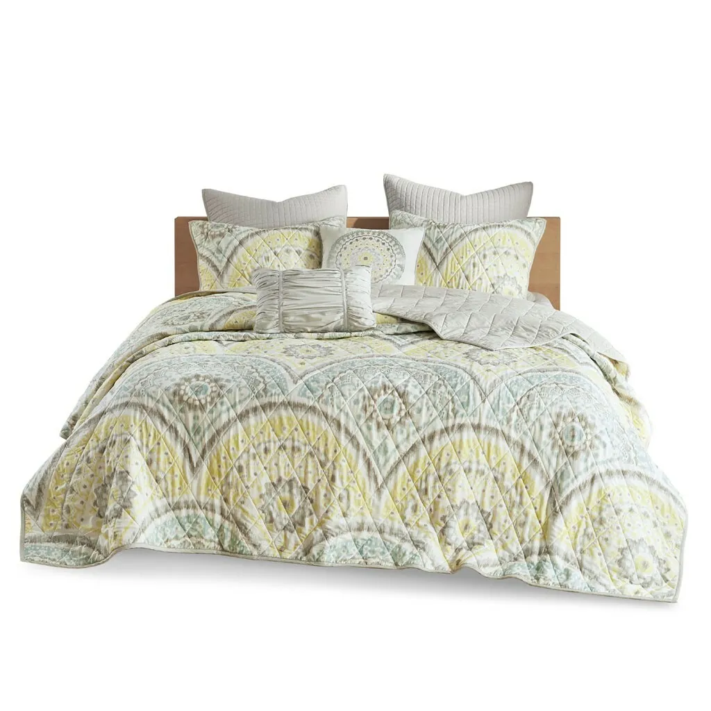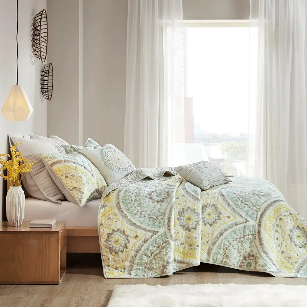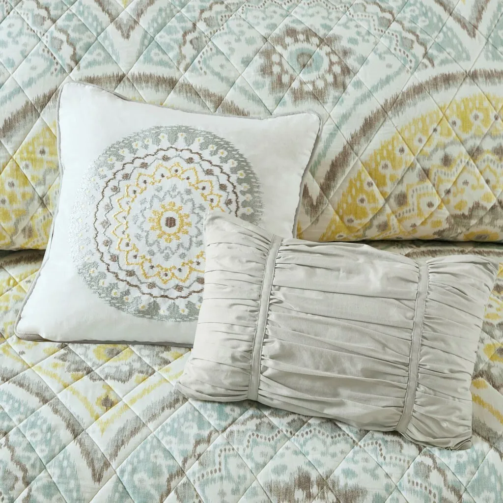 The Urban Habitat Matti 7 Piece Cotton Reversible Coverlet Set offers a relaxing update to your bedroom. The coverlet showcases an ikat printed medallion fan motif in muted shades of yellow and blue to create a pleasant globally inspired look. A solid grey reverse complements the top of the bed. Two matching shams pair perfectly with the coverlet, while two quilted Euro shams add texture to the bedding set. An embroidered medallion square decorative pillow and a ruched oblong pillow provide the finishing touches. Machine washable for easy care, this bedding set is OEKO-TEX certified, meaning it does not contain any harmful substances or chemicals, and uses an antimicrobial treatment that provides built-in freshness protection, reducing the growth of odor causing bacteria to keep fabric lasting longer.