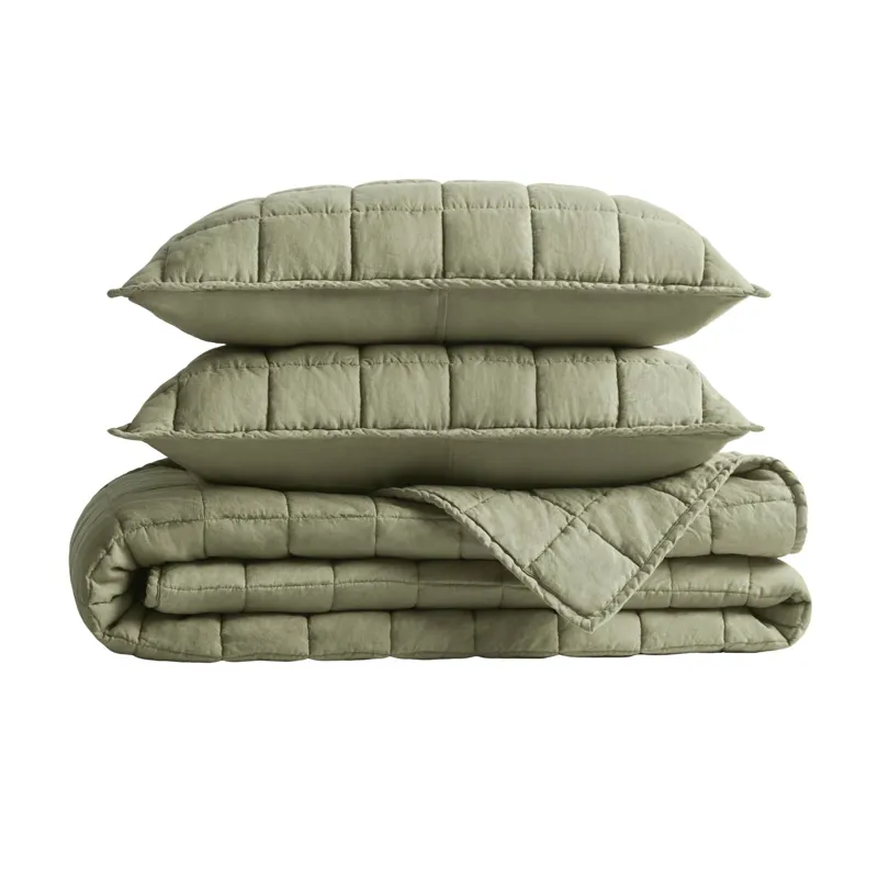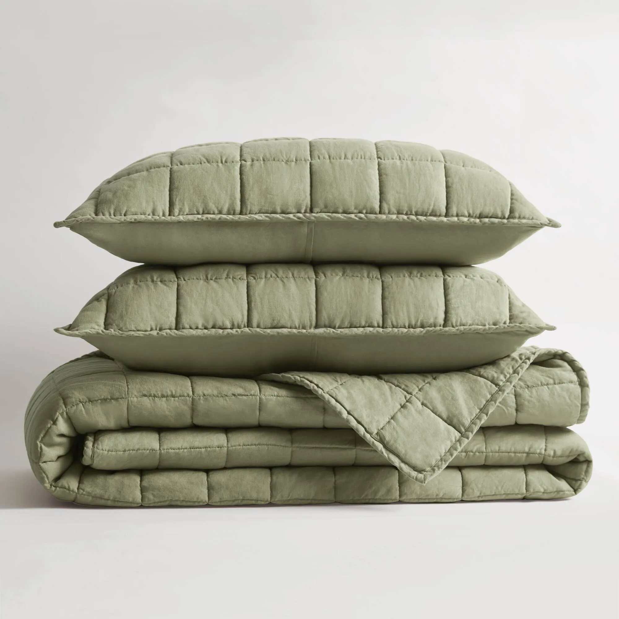 Made from certified French linen and shaped by artisanal hands, this bedding set brings a sense of calm, comfort, and understated luxury to the modern bedroom. The garment-washed quilt feels soft from the start, with added durability to help prevent shrinkage and fading over time—so it stays beautiful, wash after wash. Thoughtfully designed with a balanced 4x4 quilt pattern with piping finish, it adds just the right amount of structure and detail. Matching shams are included to complete the look. Certified by OEKO-TEX®, this quilt set is free from harmful substances and safe for daily use. It also includes a French Linen Certificate of Origin, affirming the authenticity and exceptional quality of the natural fibers used.