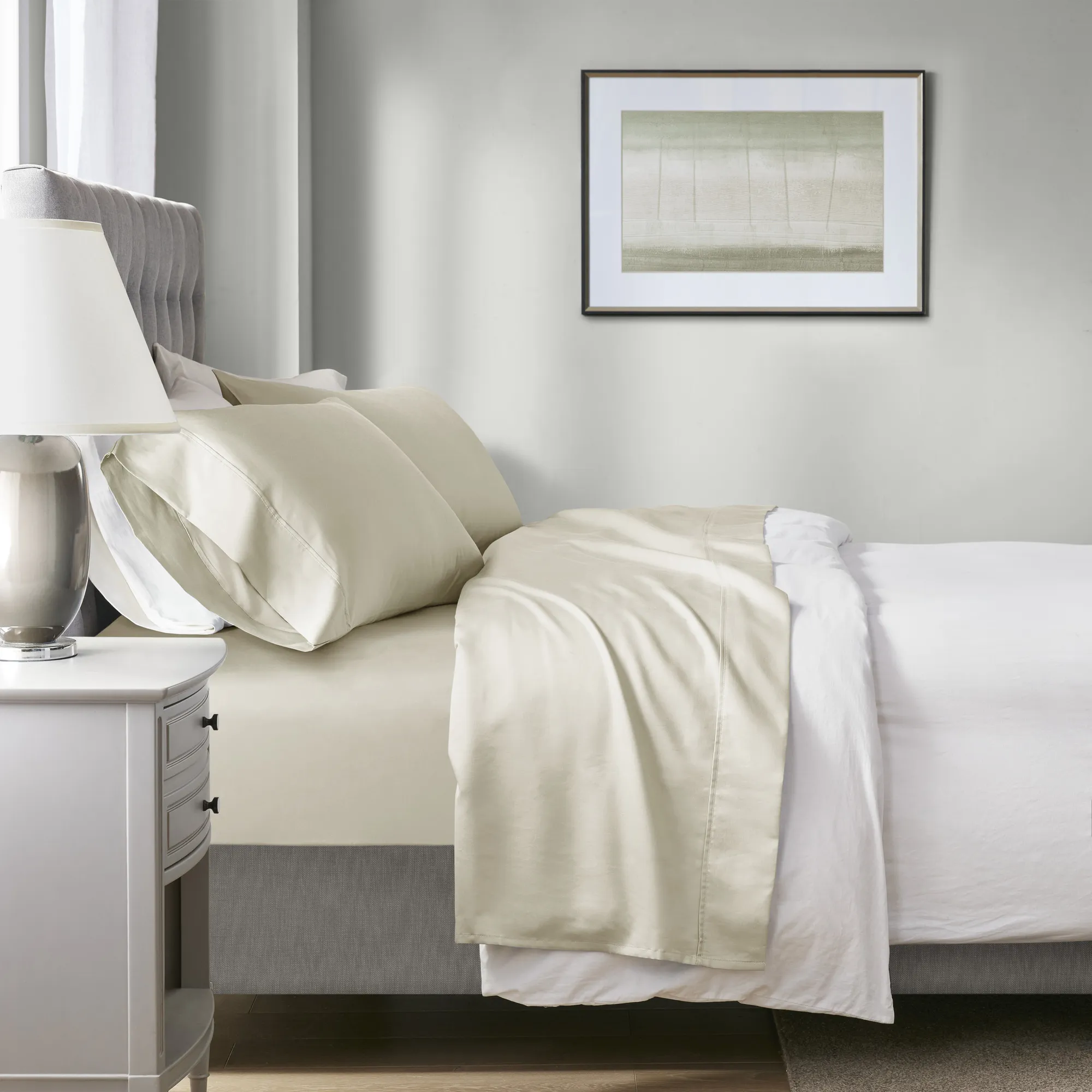 The 1000 Thread Count California King HeiQ Smart Temperature Cotton Blend 4 PC Sheet Set - Ivory by Olliix may be available at Howard's Budget Furniture & Mattress in the