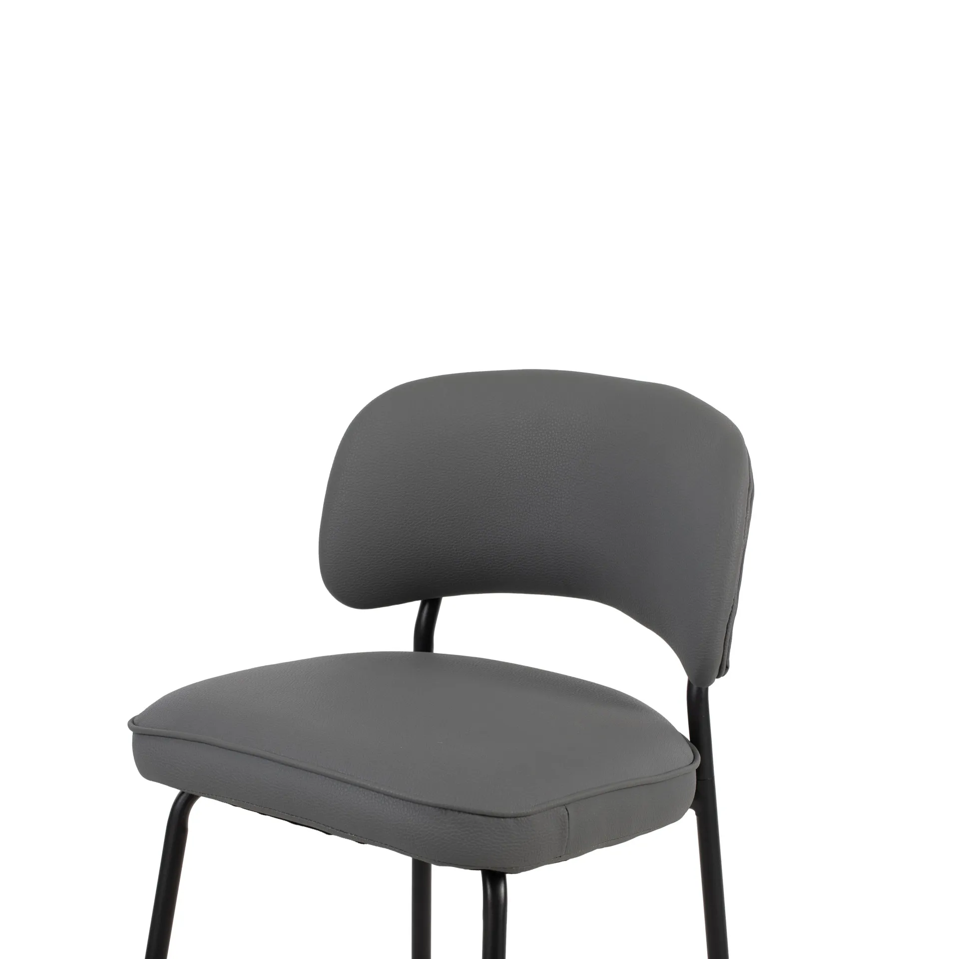 The Blythe Gray Faux Leather Counter Chair set combines modern design with practical comfort, perfect for enhancing any contemporary space. Each set includes two counter-height chairs with a sleek, arched back and low profile for a refined look. The gray vegan leather delivers the luxurious appeal of leather without the maintenance, offering a durable and eco-friendly seating solution. The sturdy black iron legs provide exceptional stability, resisting bending or breaking, while the contrast between the black legs and the upholstery creates a sophisticated, modern style. Dual-purpose footrests ensure added stability and provide a comfortable place to rest your feet. These chairs offer a perfect blend of style, comfort, and durability, making them an ideal choice for any home or kitchen setting.