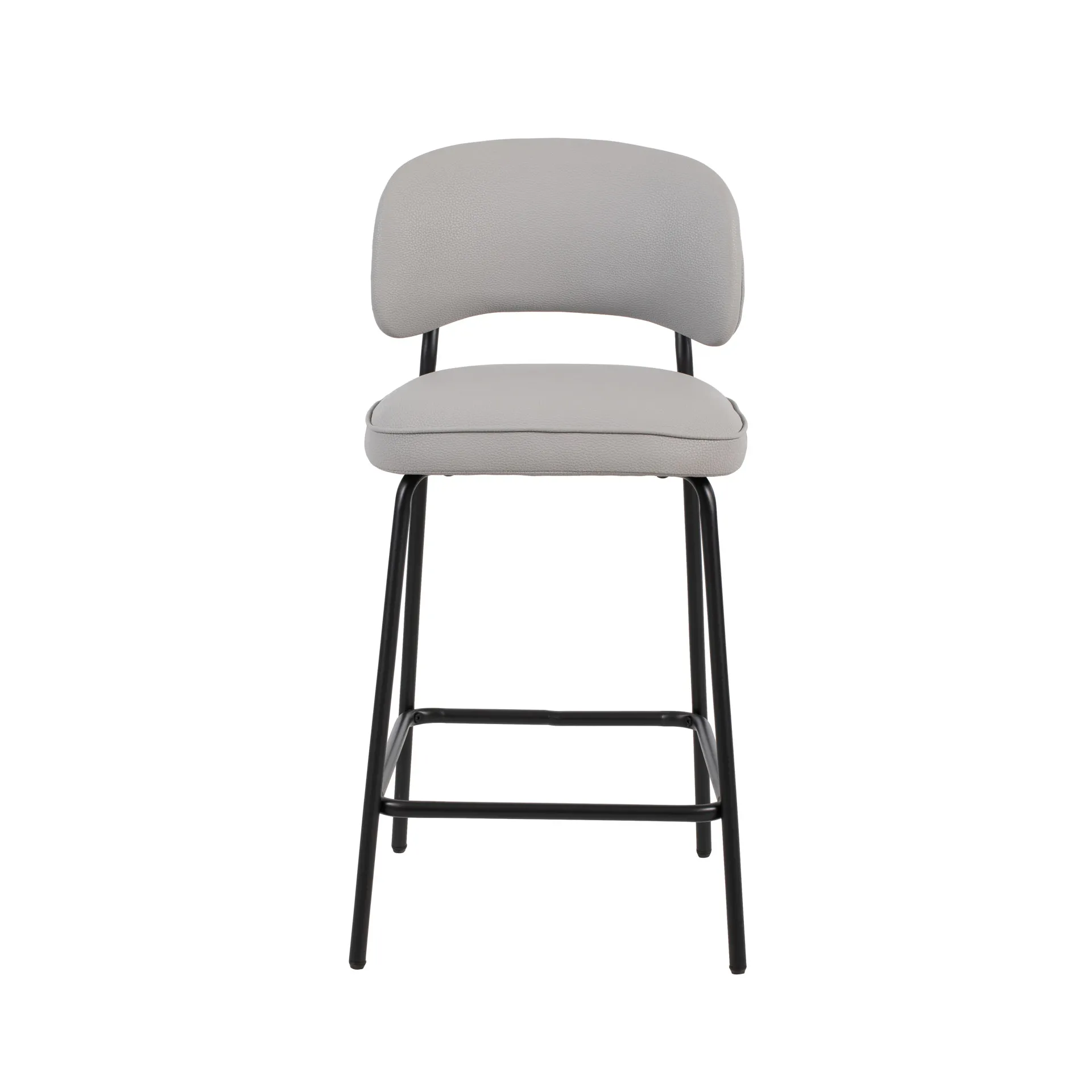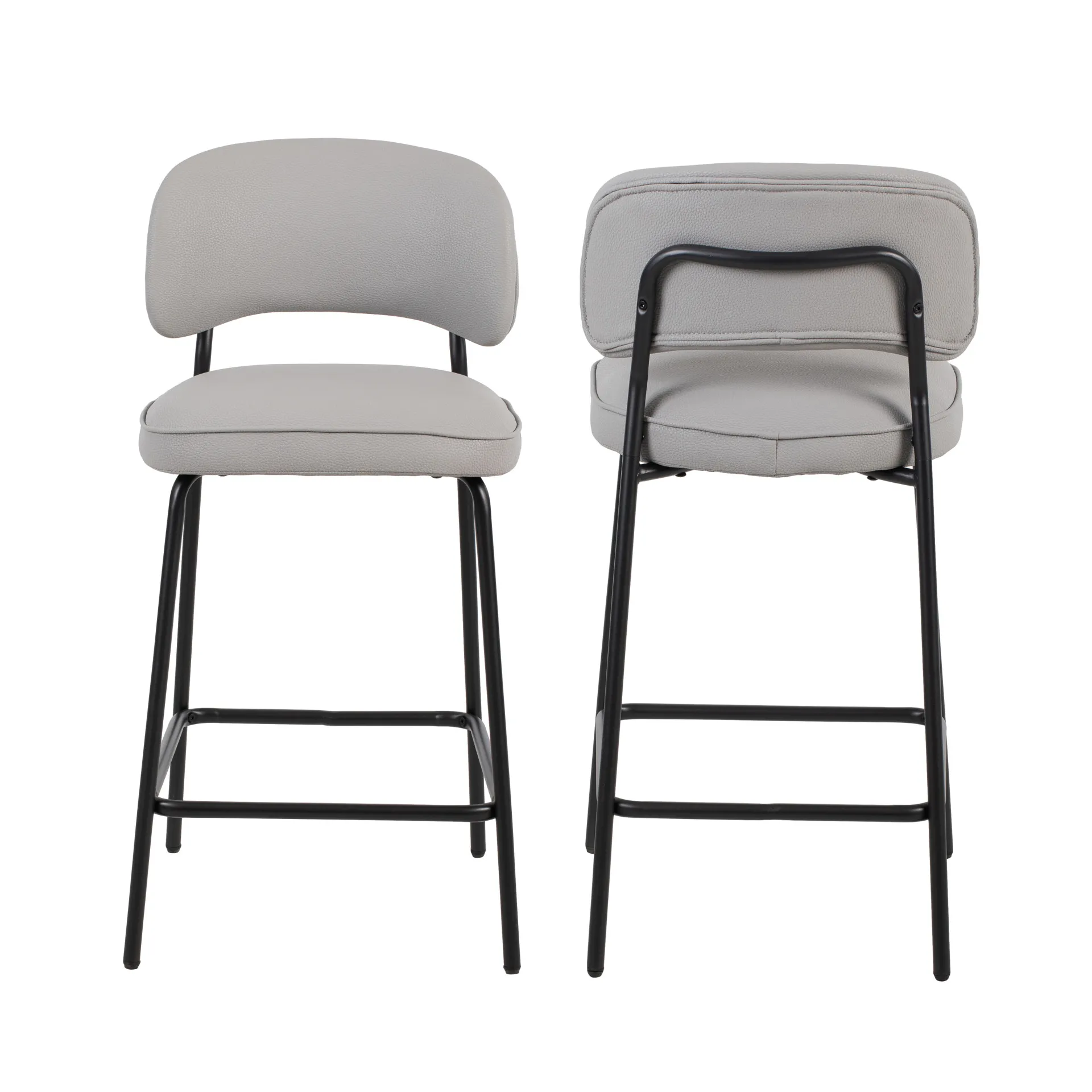 The Blythe Ivory Faux Leather Counter Chair set combines modern design with practical comfort, perfect for enhancing any contemporary space. Each set includes two counter-height chairs with a sleek, arched back and low profile for a refined look. The ivory vegan leather delivers the luxurious appeal of leather without the maintenance, offering a durable and eco-friendly seating solution. The sturdy black iron legs provide exceptional stability, resisting bending or breaking, while the contrast between the black legs and the upholstery creates a sophisticated, modern style. Dual-purpose footrests ensure added stability and provide a comfortable place to rest your feet. These chairs offer a perfect blend of style, comfort, and durability, making them an ideal choice for any home or kitchen setting.