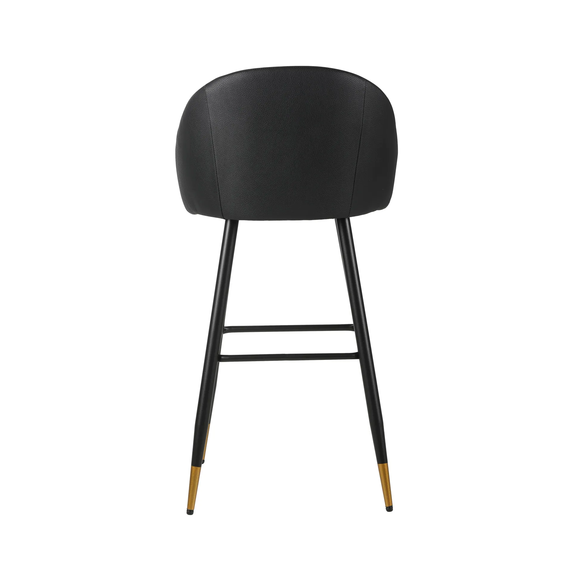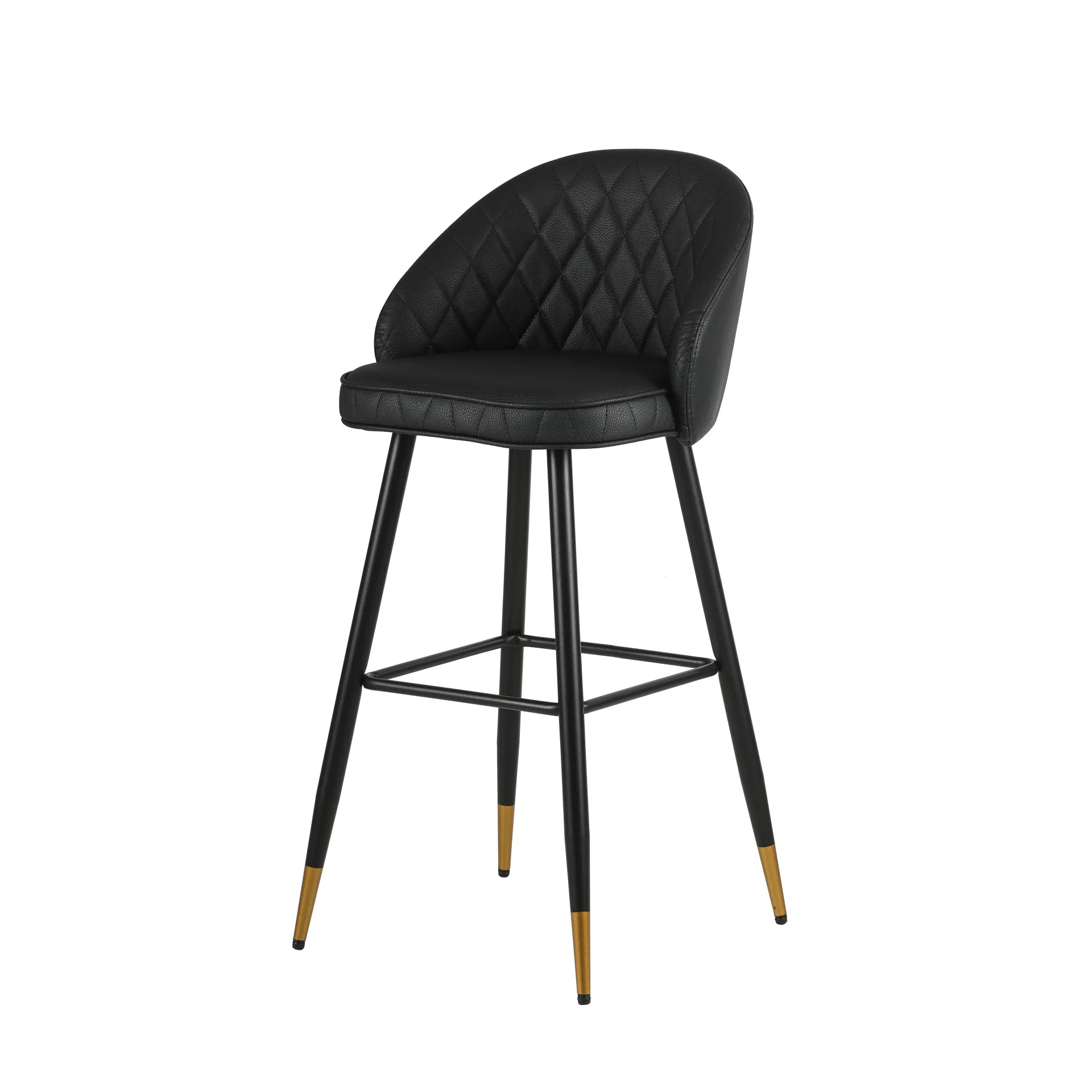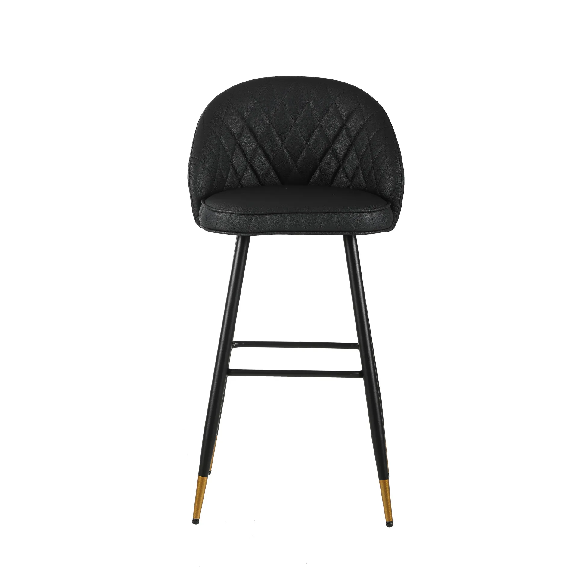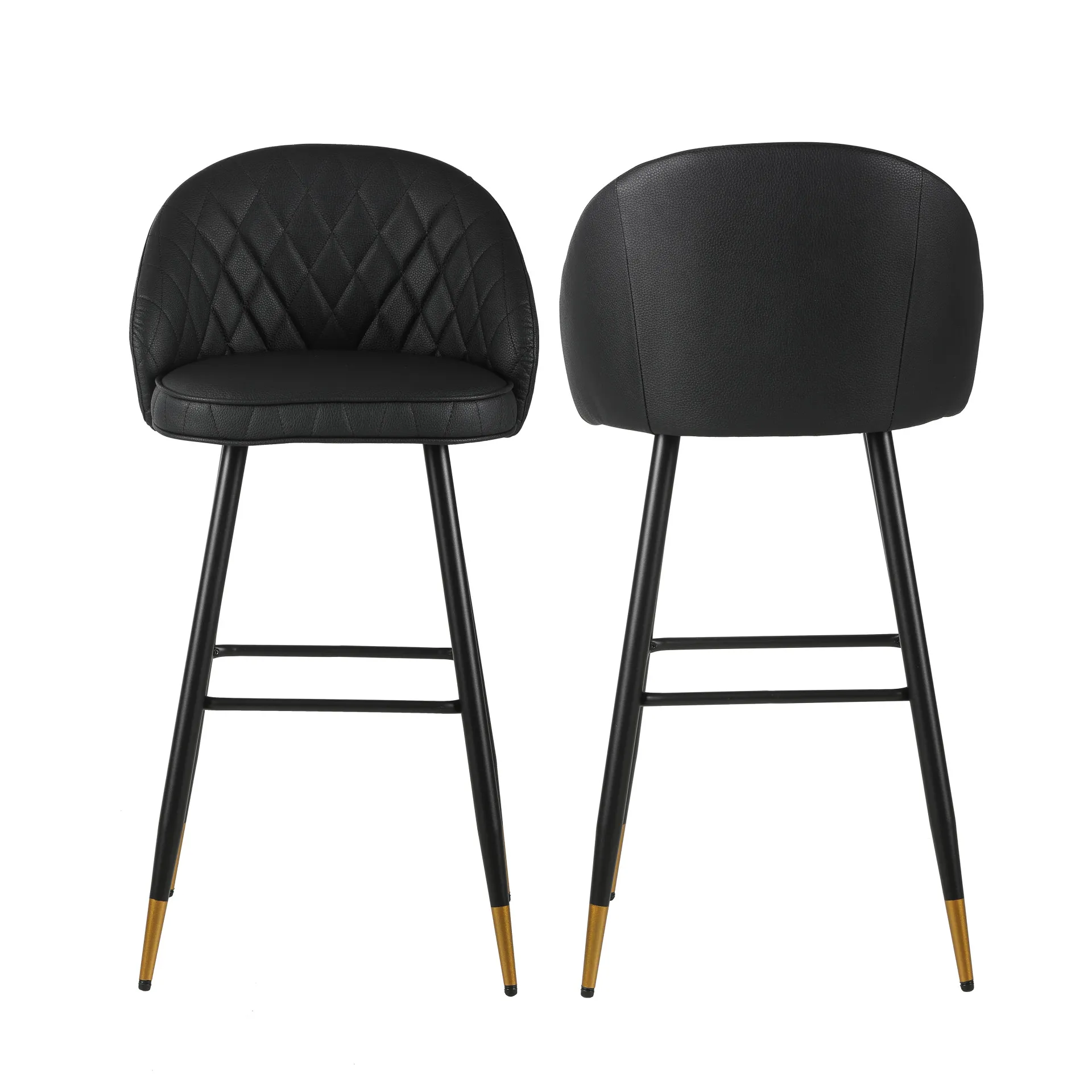 The Oliver Black Vegan Leather Bar Chair set combines contemporary style with practical features to enhance any modern space. Each set includes two bar chairs with a sleek, arched back and low profile, offering a chic yet refined aesthetic. Crafted from eco-friendly vegan leather, the chairs deliver the luxurious look of leather without the maintenance, with intricate diamond tufting for added sophistication. The sturdy, tapered black iron legs provide excellent stability, resisting bending or breaking, and are accented with subtle gold detailing for a touch of elegance. Dual-purpose footrests ensure both added stability and a comfortable spot to rest your feet. A perfect blend of style and functionality, these bar chairs offer long-lasting comfort and timeless design—an excellent addition to any home or bar setting.