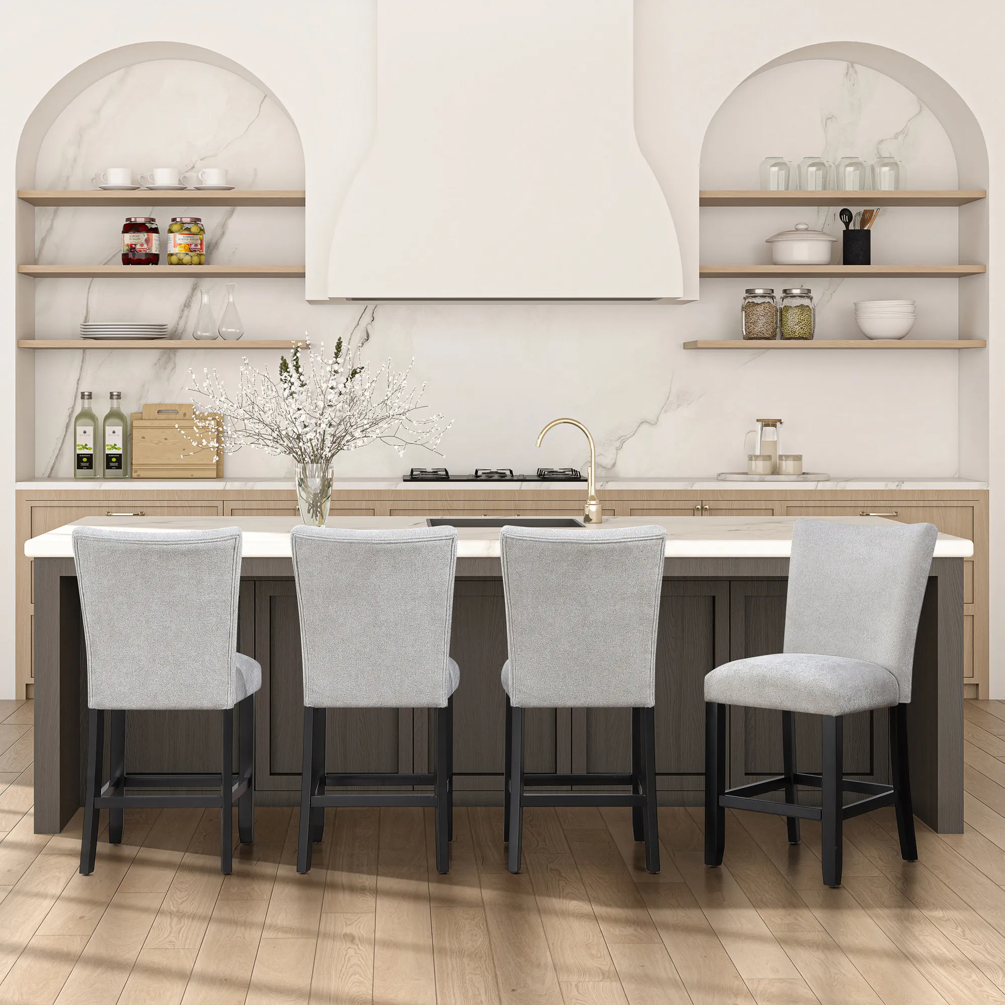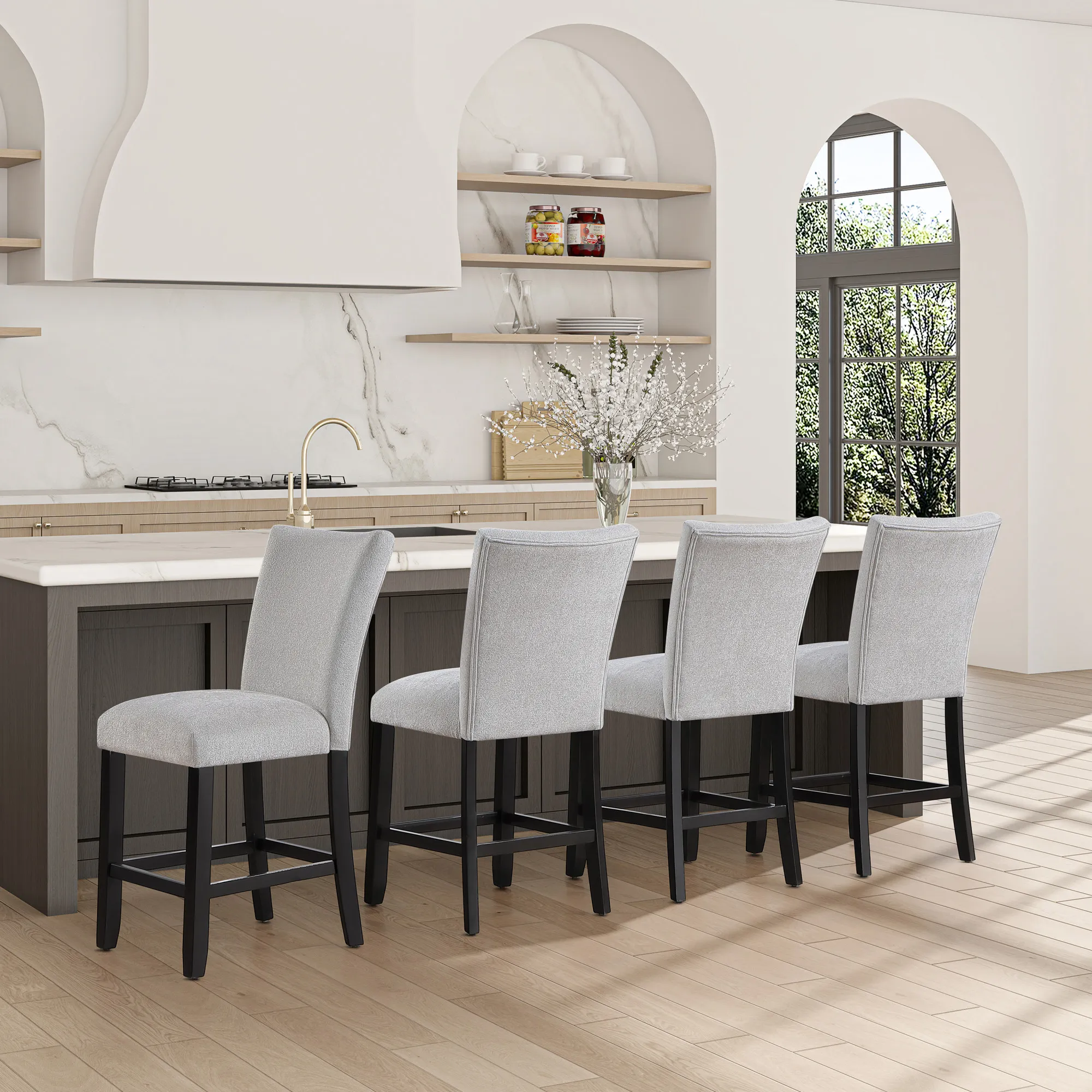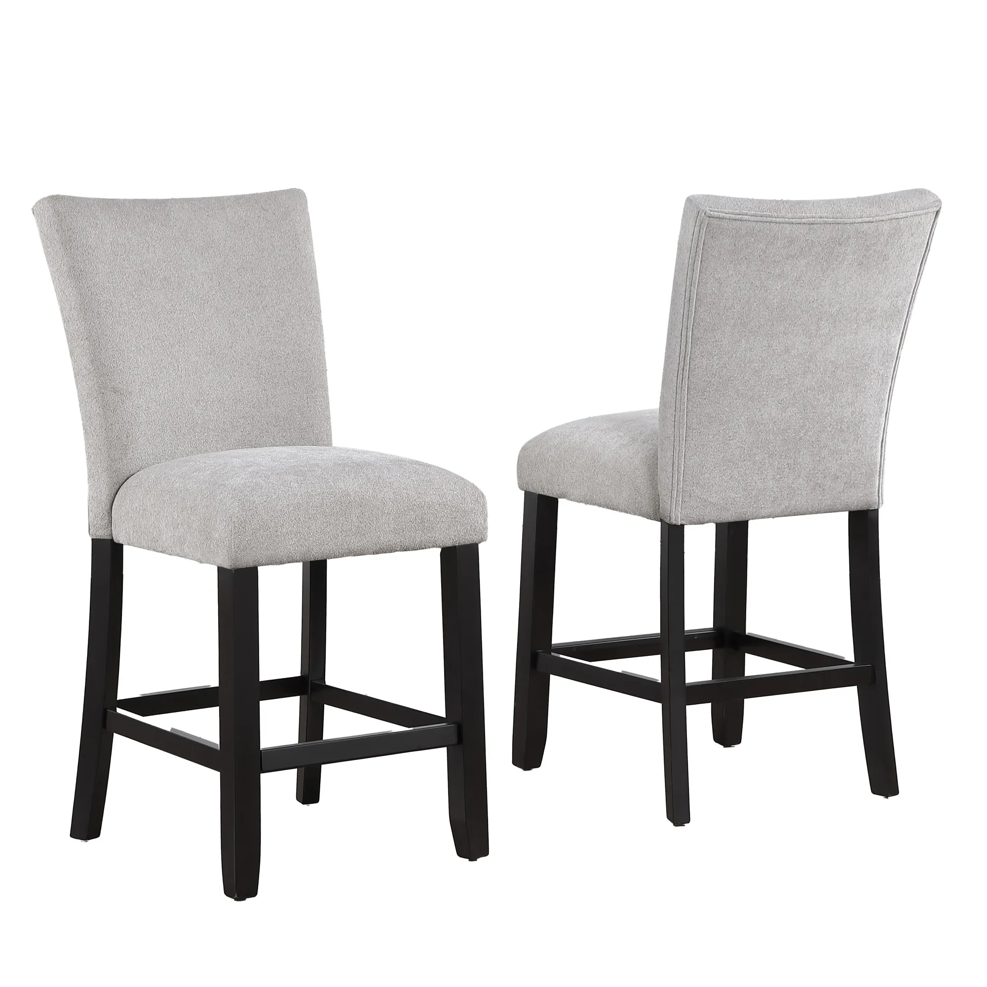 The Artemis Gray Chenille 24" Counter Chair in Black delivers plush comfort with an incredibly soft, luxurious hand. Its neutral gray chenille beautifully complements the black-finished frame for an elevated, neutral look. Designed for both style and function, it pairs perfectly with the Artemis Counter Table or kitchen counters approximately 36" high. Front and side stretchers provide exceptional stability and durability, while the gently pitched back and integrated footrest offer supportive comfort, allowing you to sit, relax, and enjoy for hours.