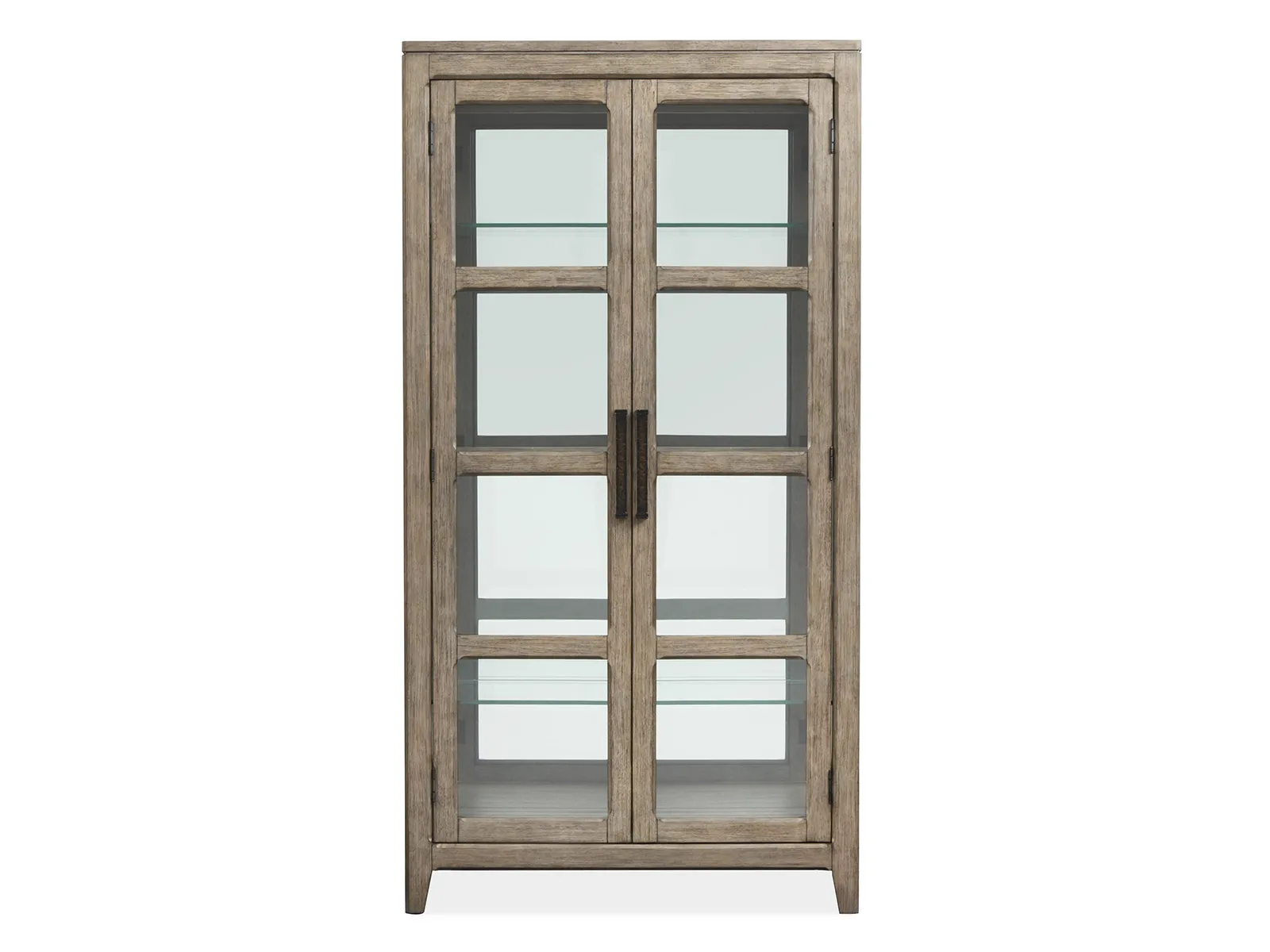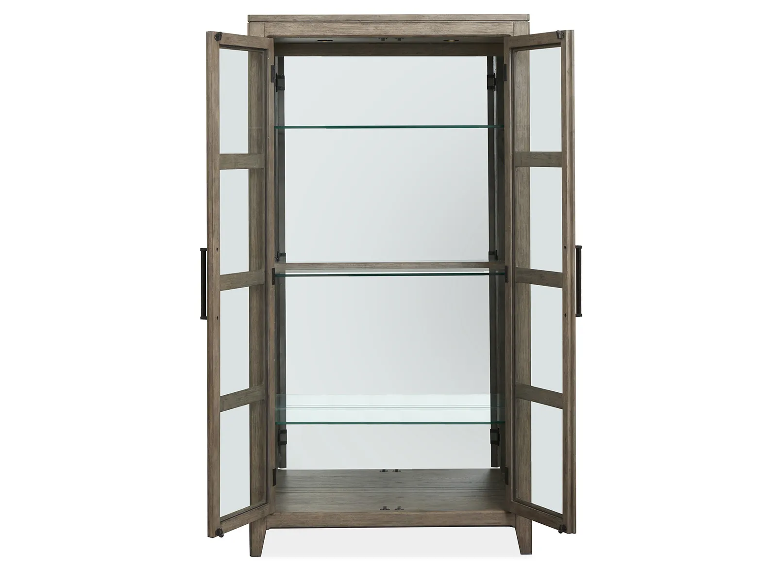 - 2 wood framed tempered glass doors and 2 adj. tempered glass shelves w/plate grooves and 1 middle fixed tempered glass shelf w/plate groove behind the doors