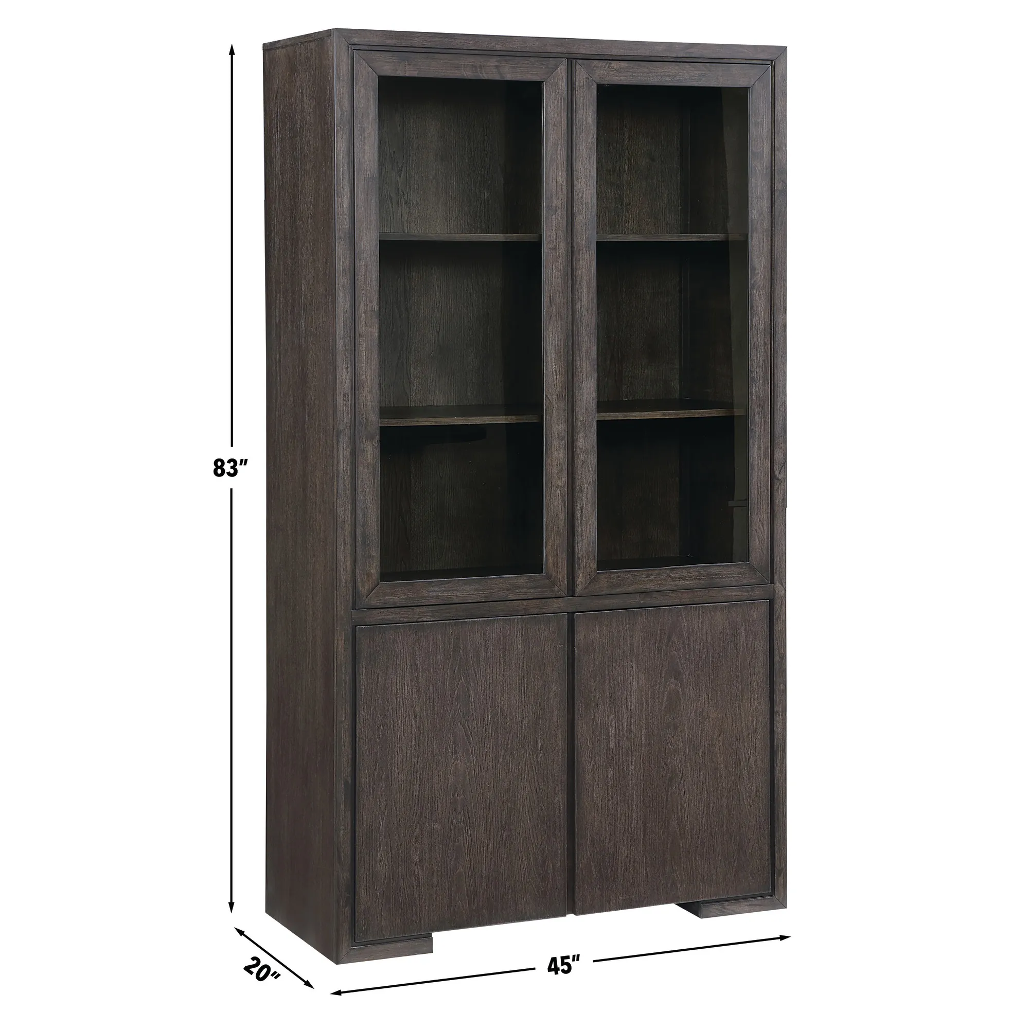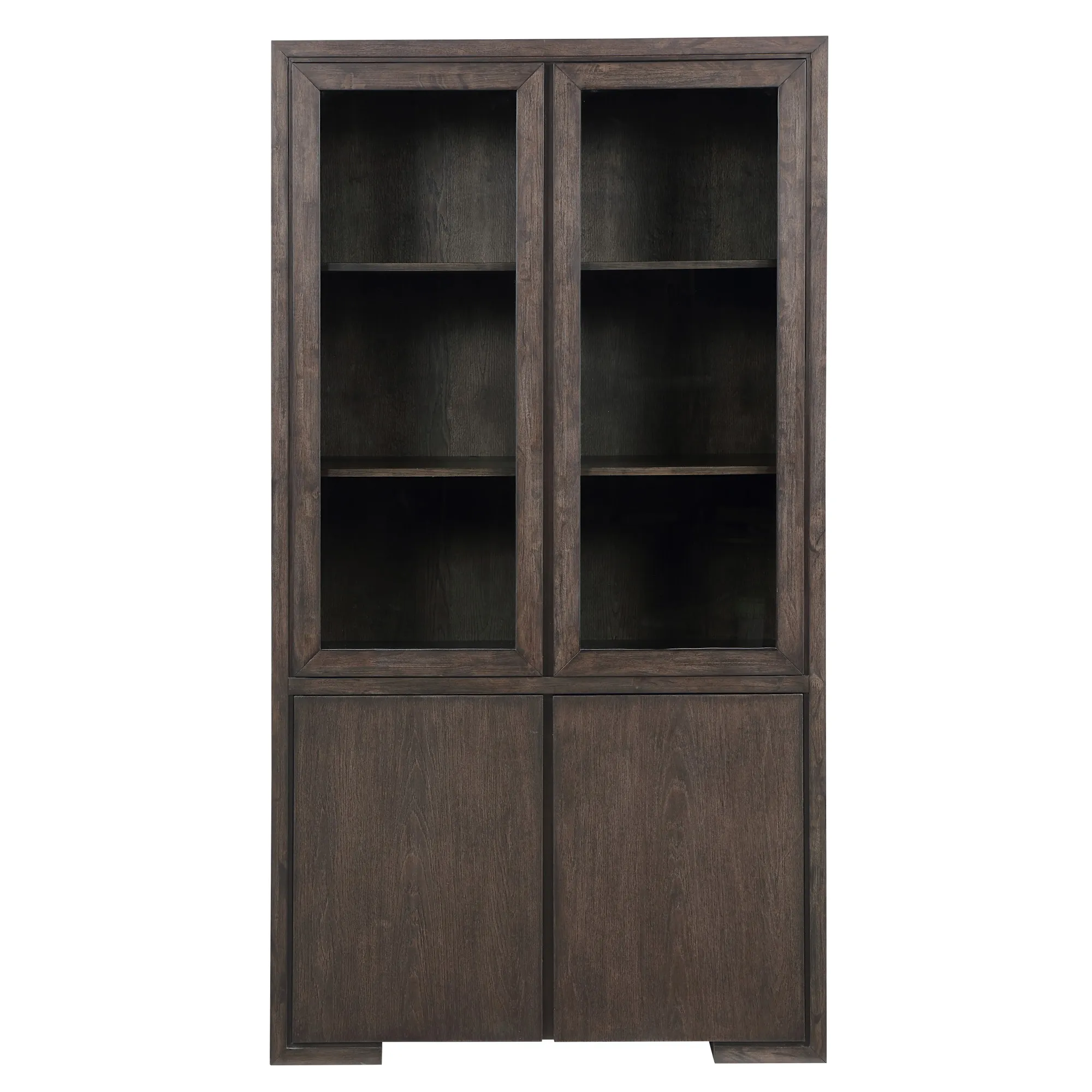 The Evan Curio offers a blend of display and hidden storage with a sleek, modern design. Its clean lines and soft-touch doors create a seamless exterior, showcasing the walnut finish over oak and mango veneers. The wire-brushed texture with a waxy hang-up adds depth to the rich color. Glass doors provide an elegant display for china or decorative items, while the wooden bottom doors offer concealed storage for dining essentials. With its sophisticated finish and functional design, the Evan Curio elevates any dining space with style and practicality.