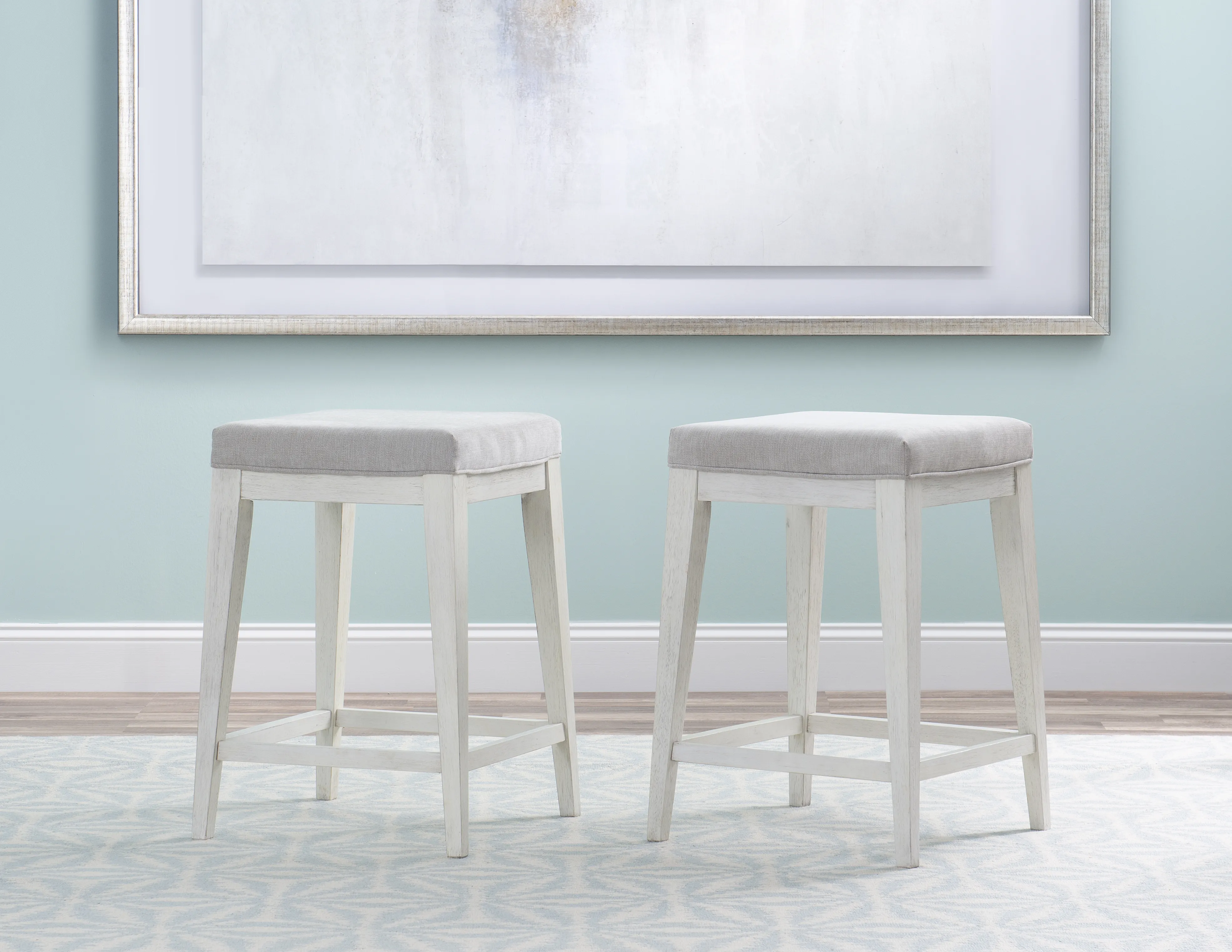 The Edgewater Upholstered Stool offers an Upholstered Seat in Light Beige Fabric. Seat Height is 25". Natural tones, classic coastal influences, and a love of casual, come together to create the Edgewater collection. Details such as canted legs, a shutter motif on drawer fronts and bases, along with the Aged Bronze hardware, lend the perfect amount of a relaxed and livable vibe. The Sand Dollar White finish on quartered ash veneer has a slight wire brushing that draws attention to the wood grain and hang up. Packaged 1 per carton