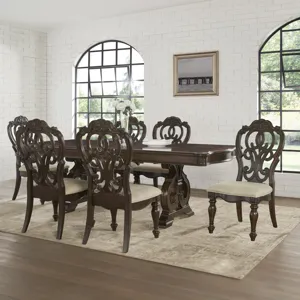 Royale evokes memories of the detail and craftsmanship of yesterday's antiques in a dining package updated for today. A warm, brown pecan-colored finish over oak and ash burl veneers combines with shaped fronts and tops to create a truly grand presentation. Etched glass and carved scrollwork complete the presentation to impress your family and friends at any gathering.