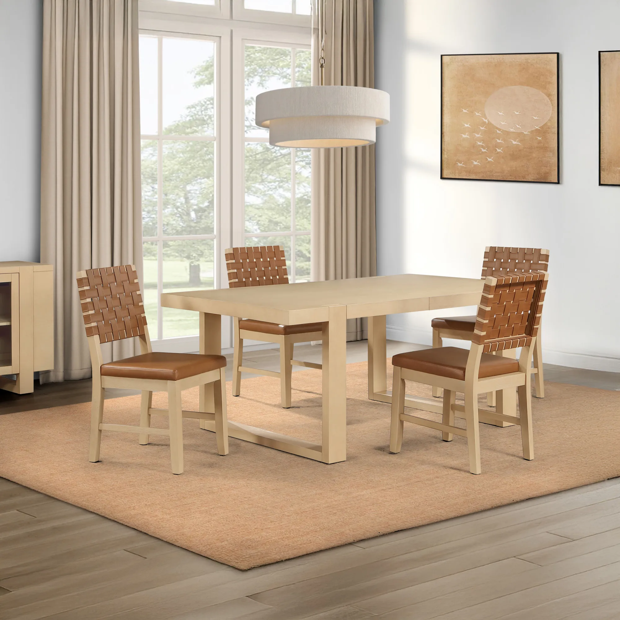 - 5-Piece Set includes the Reid 77-95" Dining Table with 18-inch leaf and 4 Reid Camel Vegan Leather Side Chairs. Each item also sold separately.