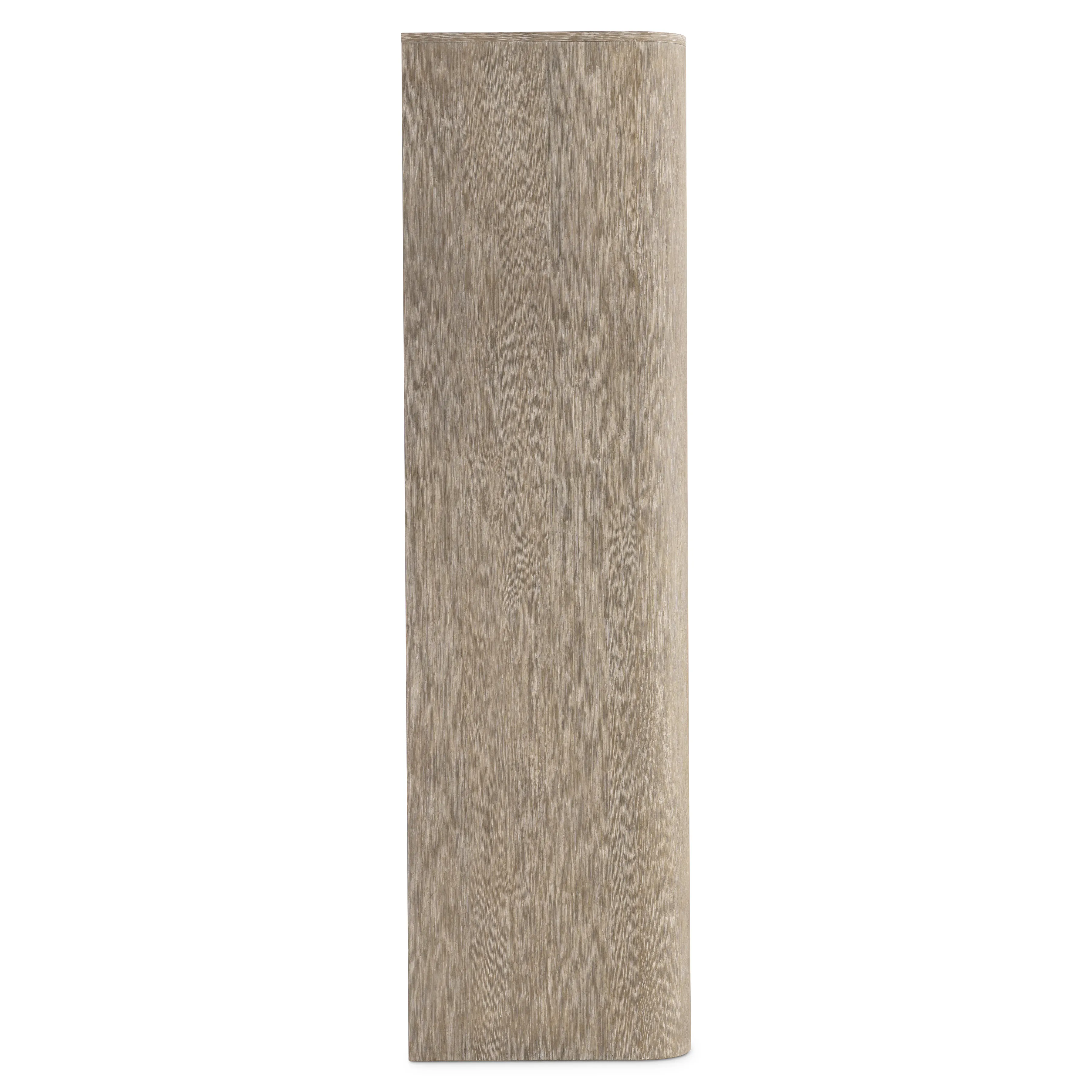 Wirebrushed Oak Bar Cabinet in Aria finish. Two push-to-open, Scalloped-front doors. Interior Strip Light with Paddle Switch. Mirrored back panel. Stemware racks. Two adjustable glass shelves. Two pull-to-open, soft-close drawers with a Brown Guardian cloth Wrapped Pad in each. Fixed Bottle Storage shelf. Adjustable glides. Anti-tip kit.Â
