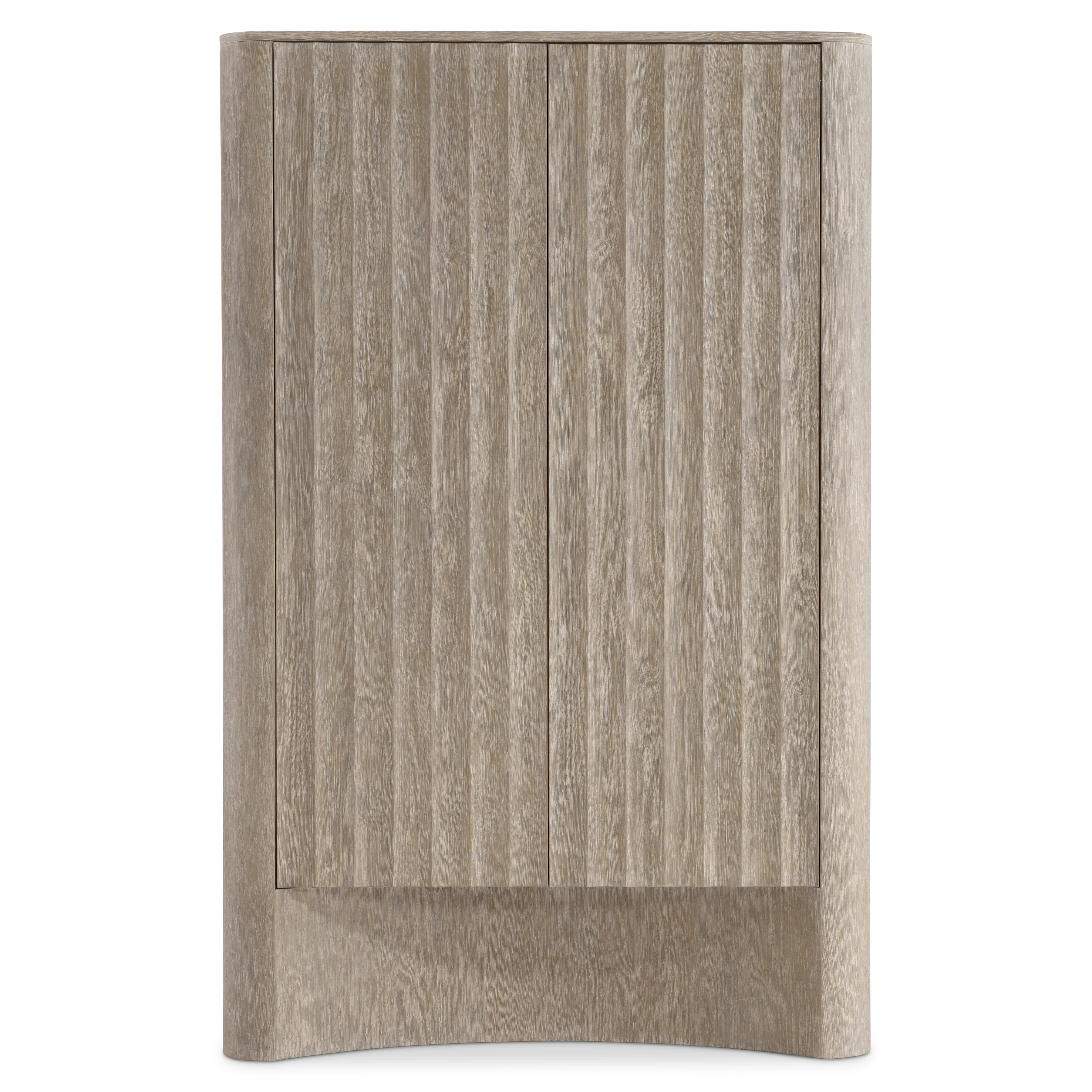 Curves and planes create a master play of light and shadow on the Loggia bar cabinet. Fluting marks the two doors while the base showcases a concave curve. The doors open to reveal lights, a mirrored back panel, bottle storage and two drawers.