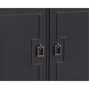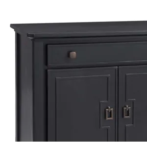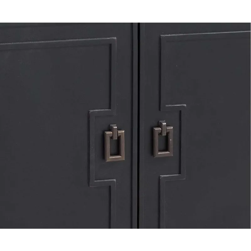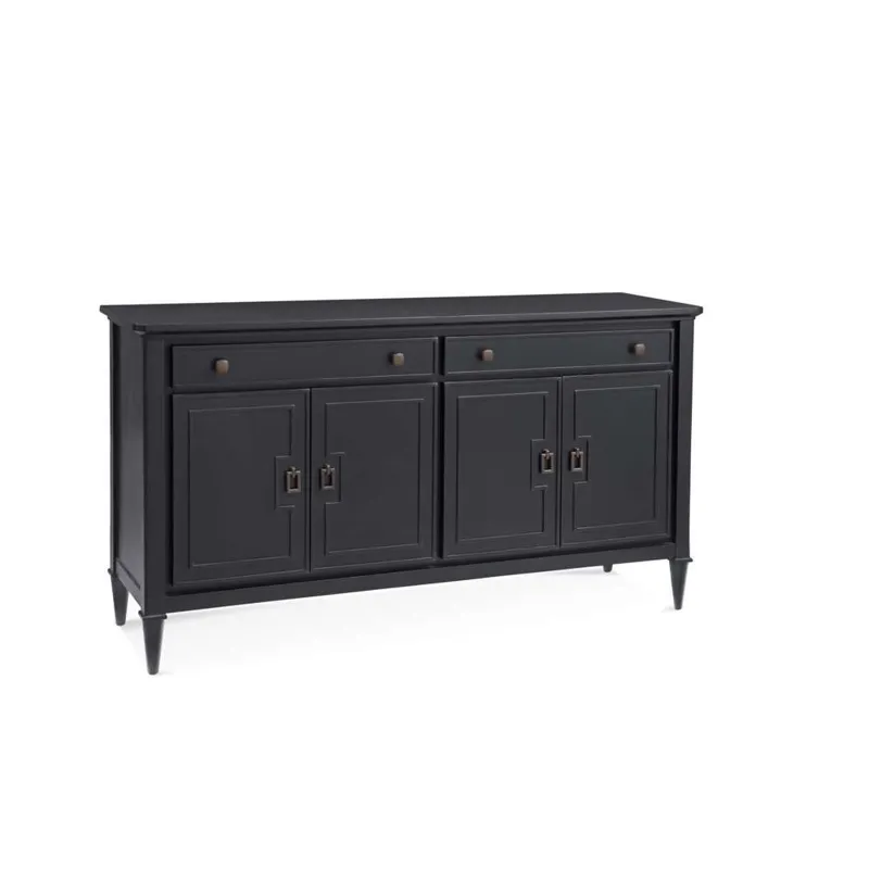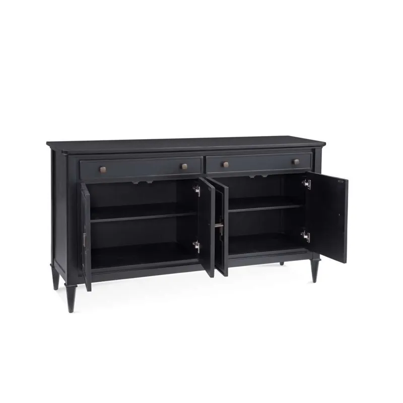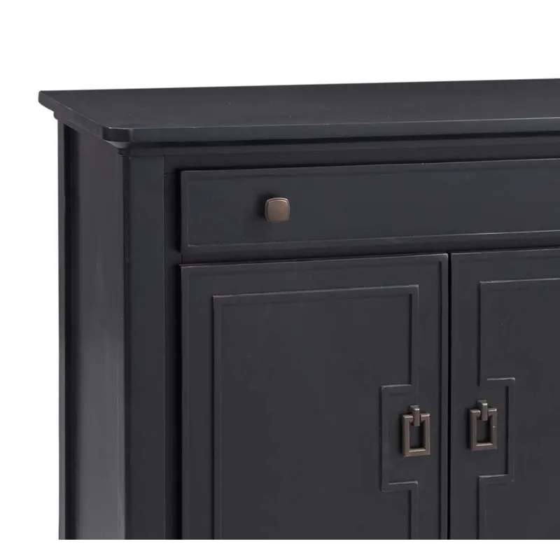 The Hudson Server features an all black finish, with geometric details giving it an Asian flair. This sideboard provides ample storage between the two upper drawers and two cabinets. The top drawers feature black felt lining. The four doors open smoothly with the magnetic stops and soft close hinges, revealing two cabinet spaces, each with an adjustable shelf. The sturdy piece is solidified with adjustable floor levelers on each leg.