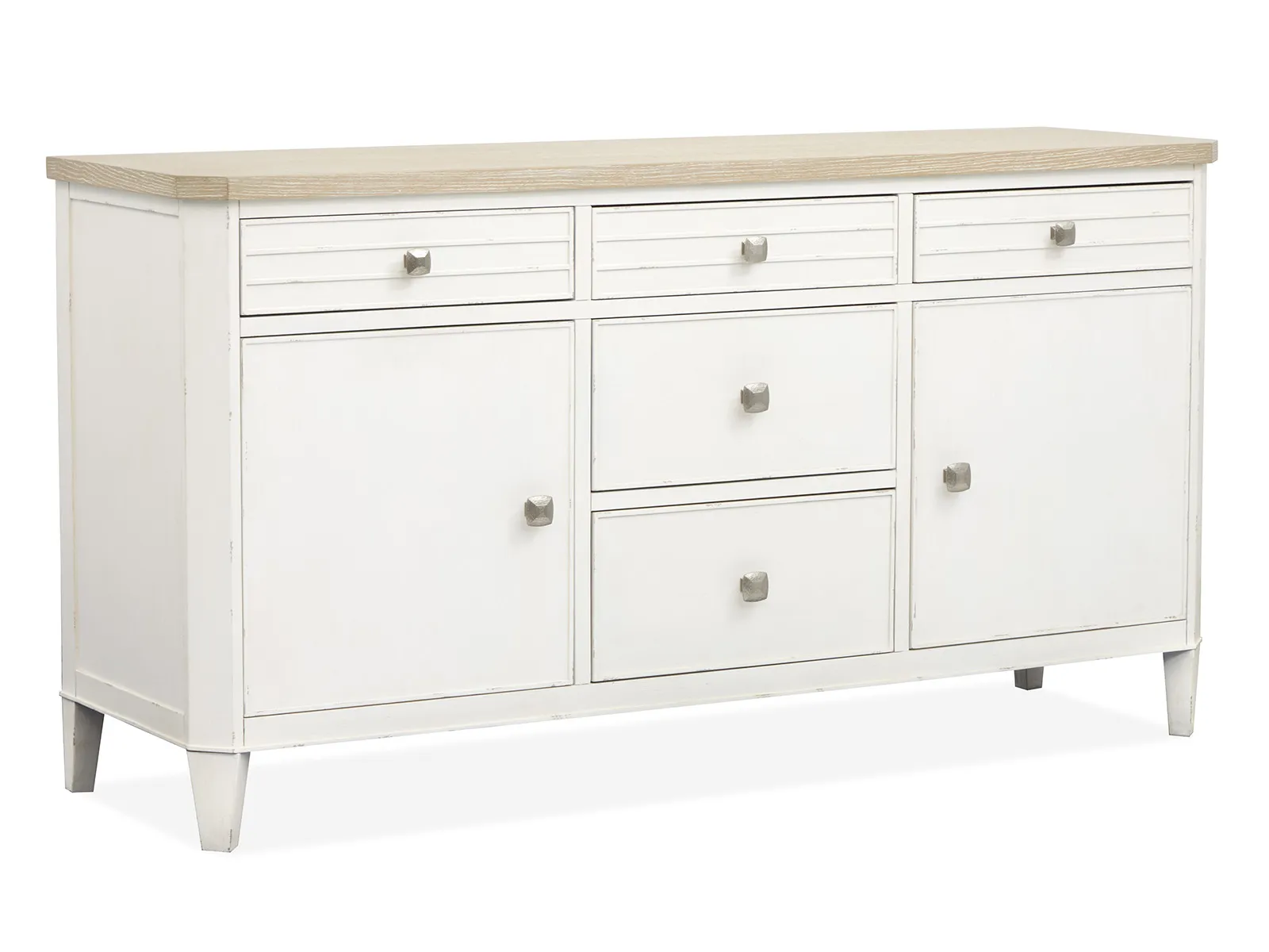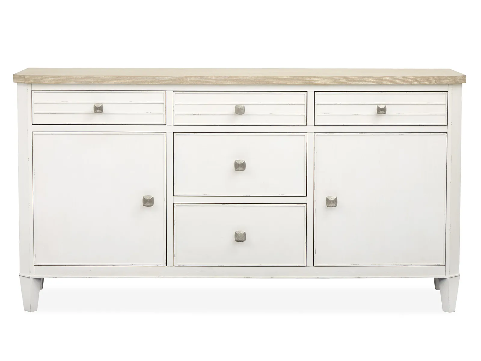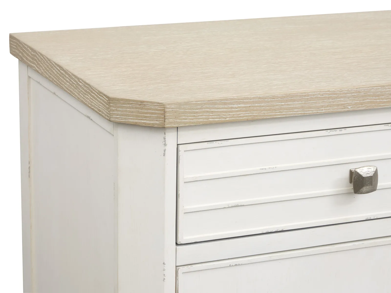 The Echo Isles Collection brings together a perfect blend of transitional casual style with its serene Sea Pearl and Driftwood finishes. Crafted with quartered oak tops and casual chippy white undertop surfaces and the collection's casegoods feature modern raised beads and concentric squares and and canted posts and aprons and adding dimension and visual interest. The sculpted and textured Satin Silver hardware provides a subtle shine and enhancing the collection's relaxed yet refined aesthetic. The versatile pieces and including several bedroom and living options and offer flexibility for various rooms of the home and making the Echo Isles Collection ideal for creating a welcoming and functional space. With its inviting finish and thoughtful design details and this collection will bring a calm and coastal charm to your home and effortlessly elevating any room.